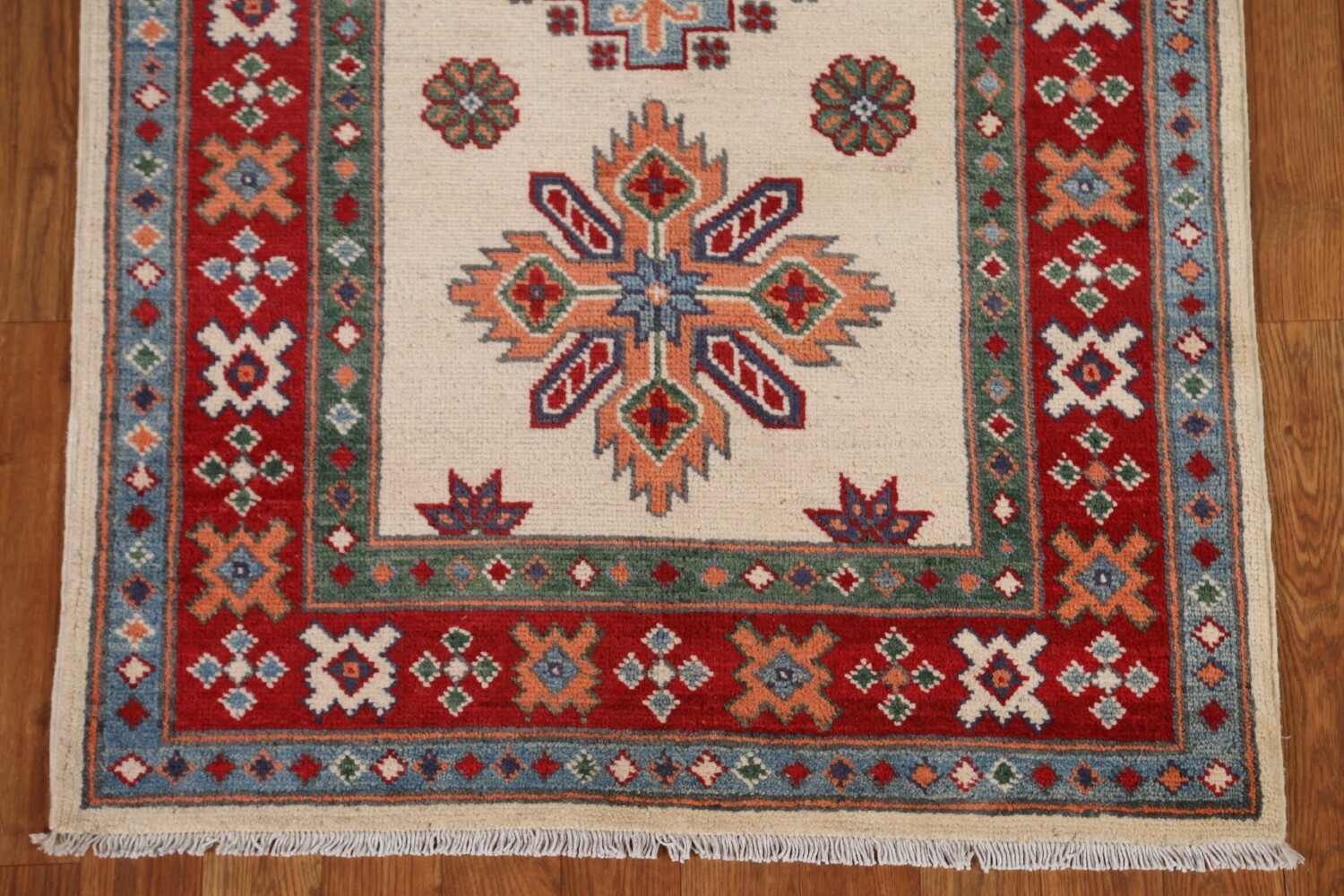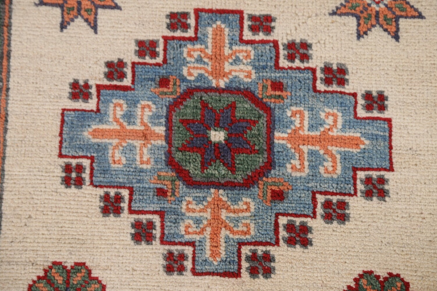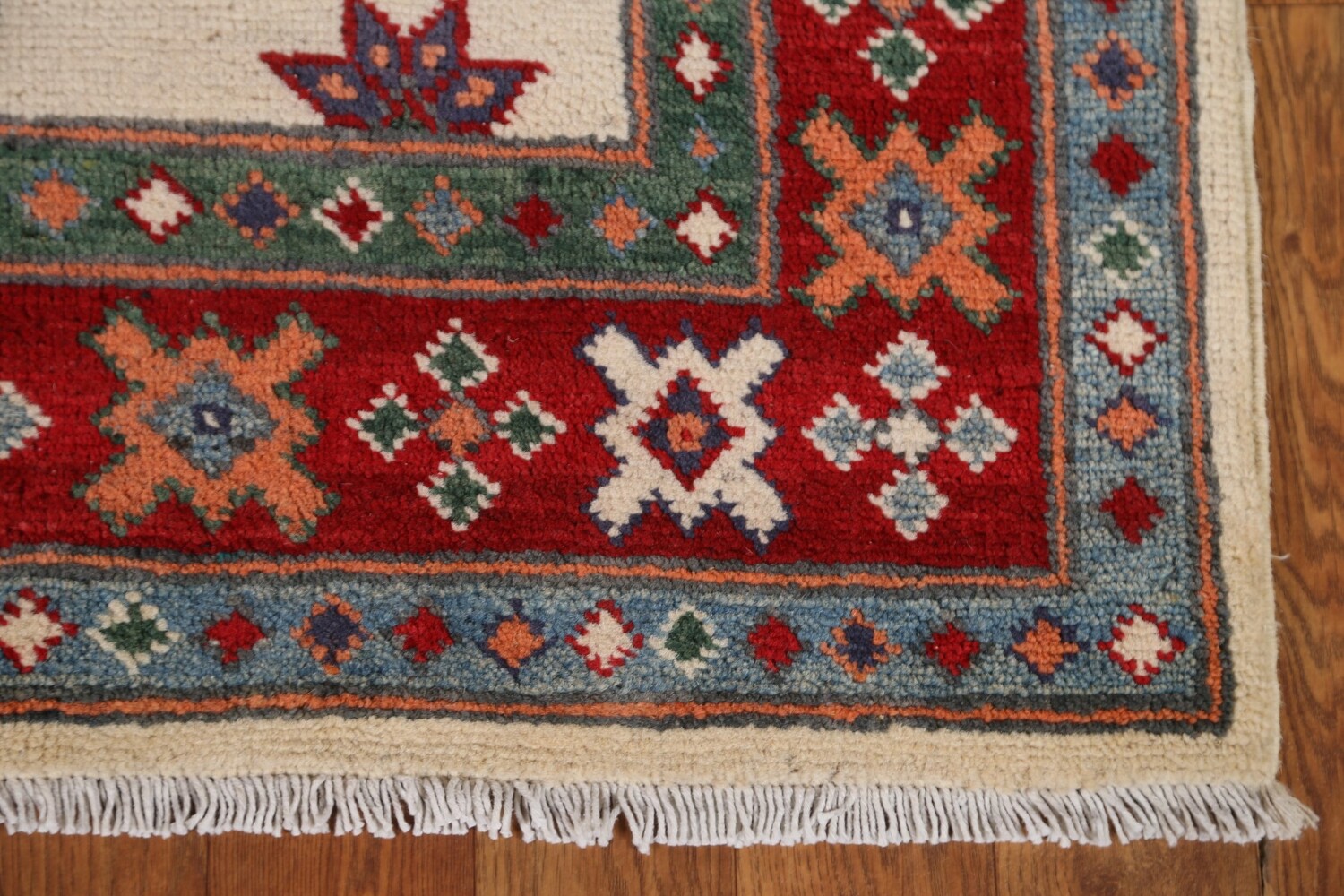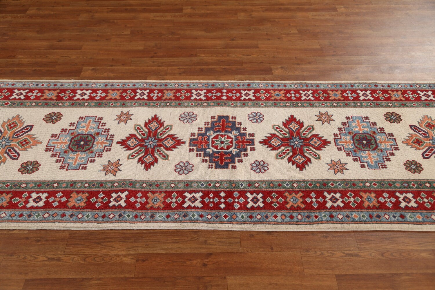 A Beautiful Genuine Pakistan Kazak rug is Hand Knotted by skillful weavers in Pakistan with 100% Wool Material. This rug is in New, First Quality condition. dimensions are 8' 8'' X 2' 10'' in foot and 264 X 86 in centimeter. the primary color is Beige & Ivories.