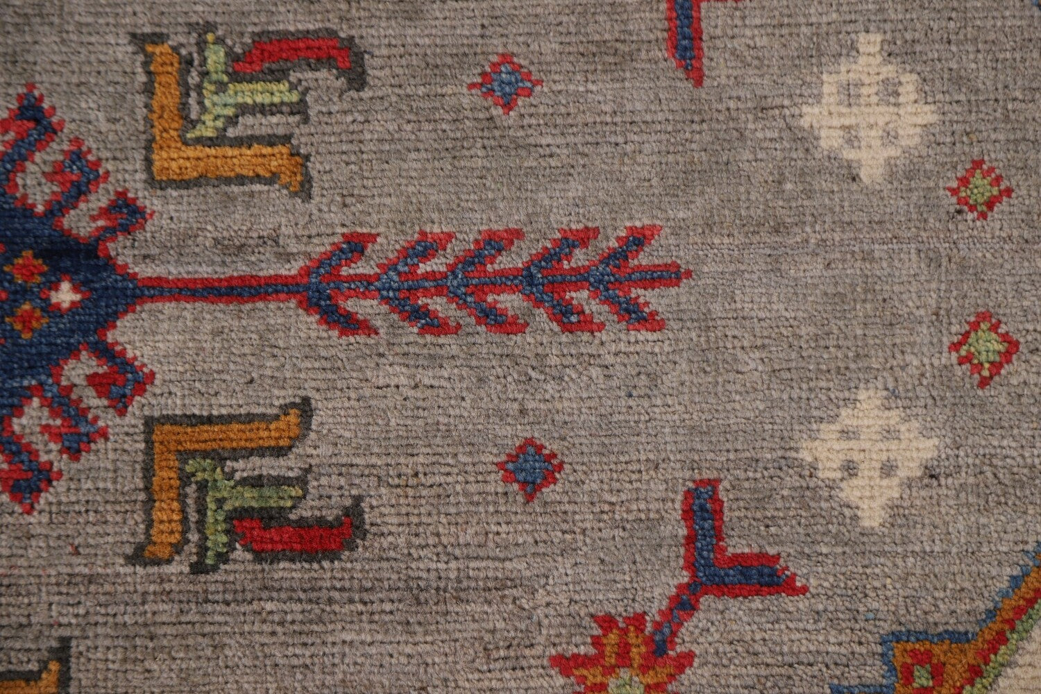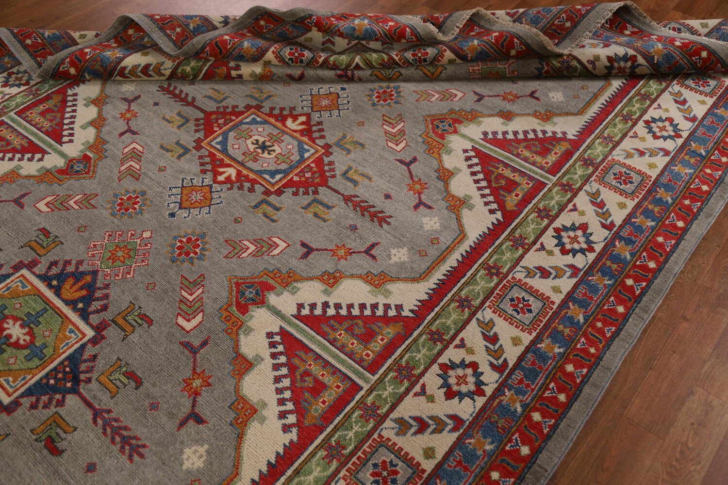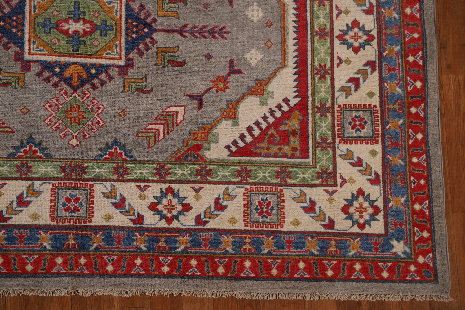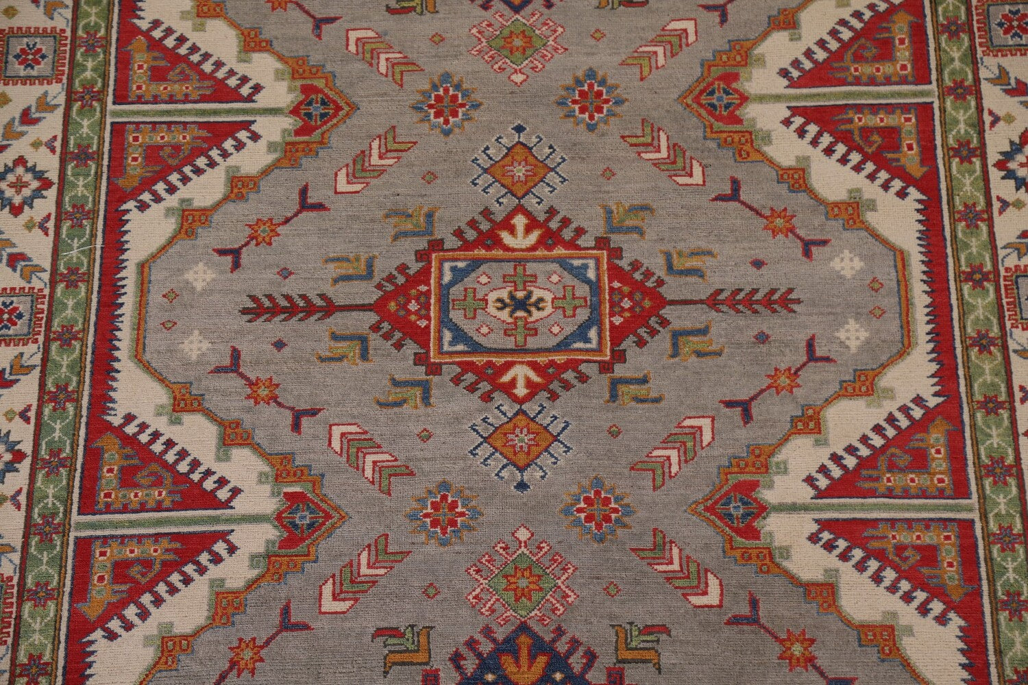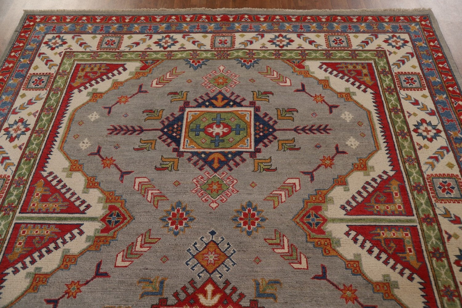 A Beautiful Genuine Pakistan Kazak rug is Hand Knotted by skillful weavers in Pakistan with 100% Wool Material. This rug is in New, First Quality condition. dimensions are 9' 9'' X 6' 7'' in foot and 297 X 201 in centimeter. the primary color is Greys & Charcoal.