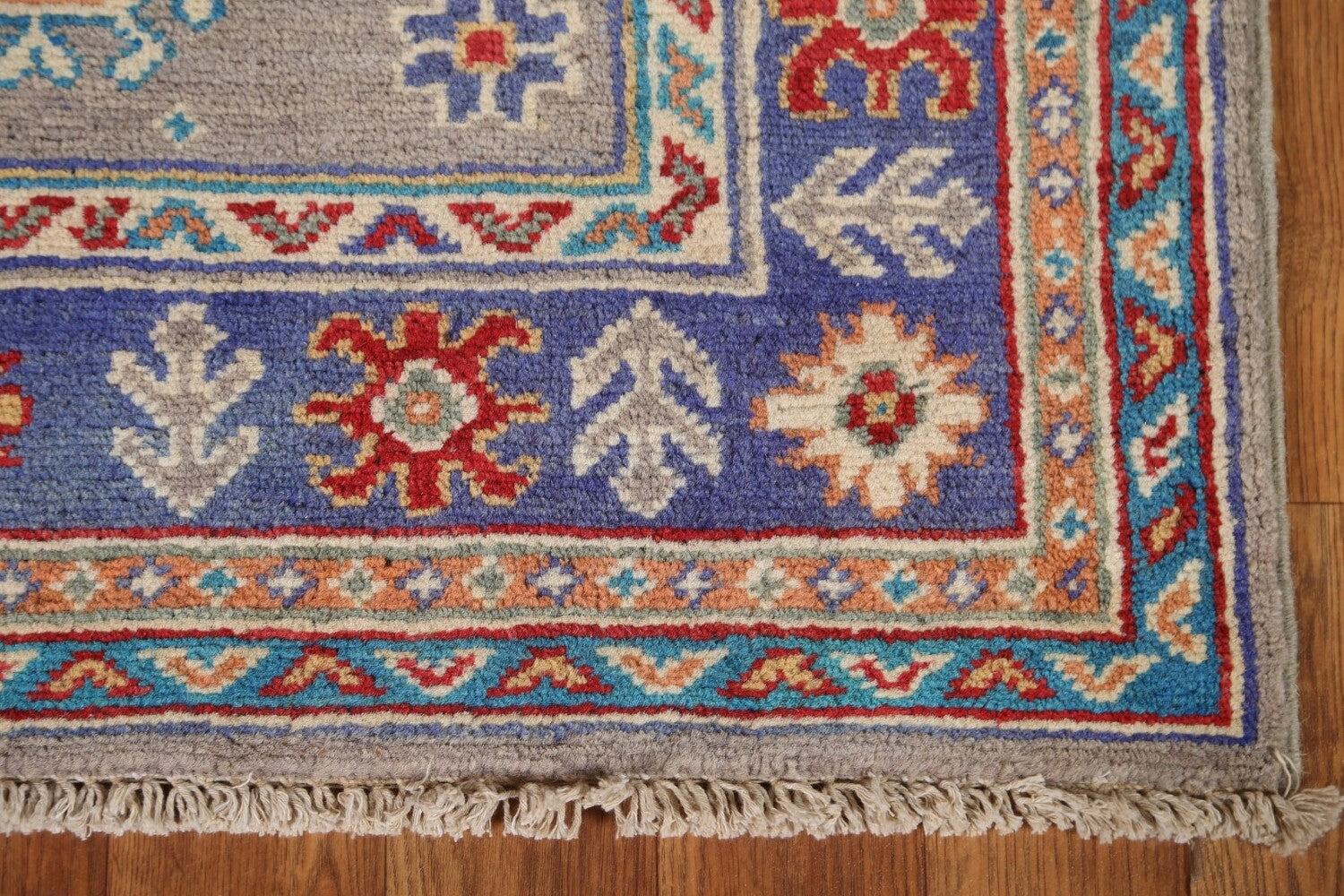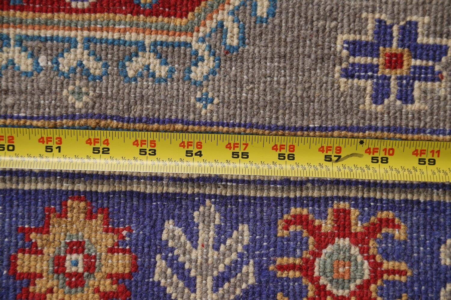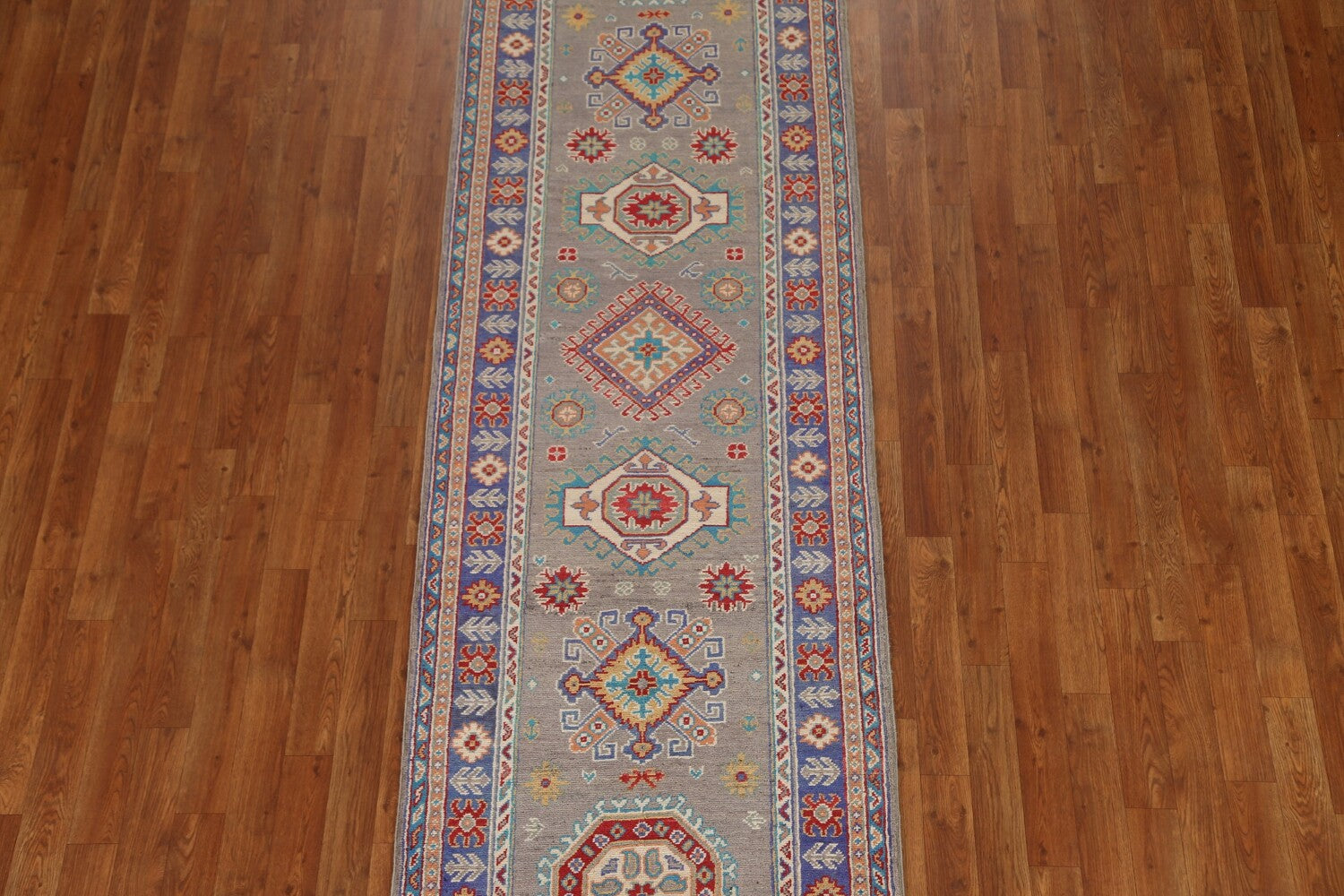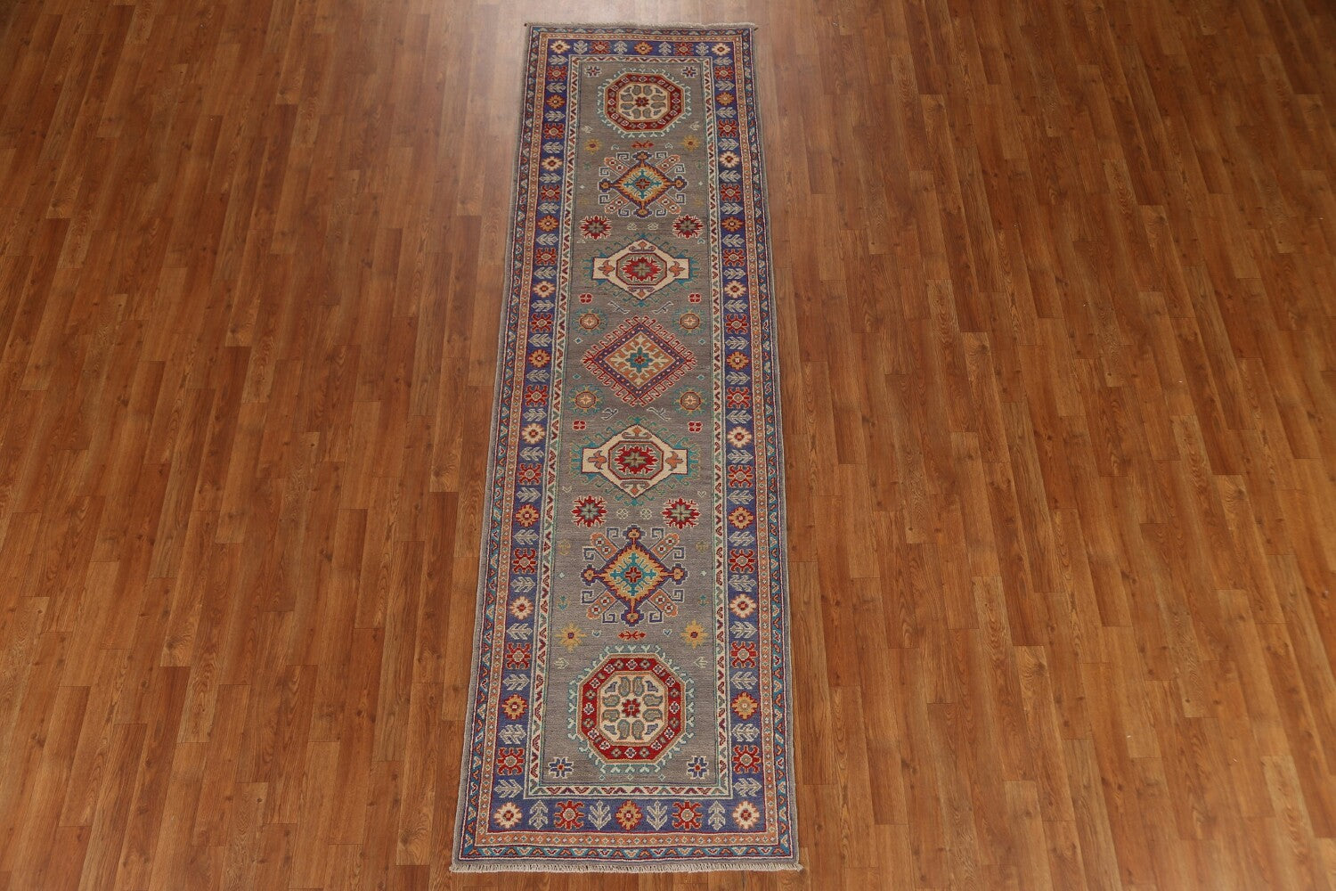 A Beautiful Genuine Pakistan Kazak rug is Hand Knotted by skillful weavers in Pakistan with 100% Wool Material. This rug is in New, First Quality condition. dimensions are 9' 6'' X 2' 9'' in foot and 290 X 84 in centimeter. the primary color is Greys & Charcoal.