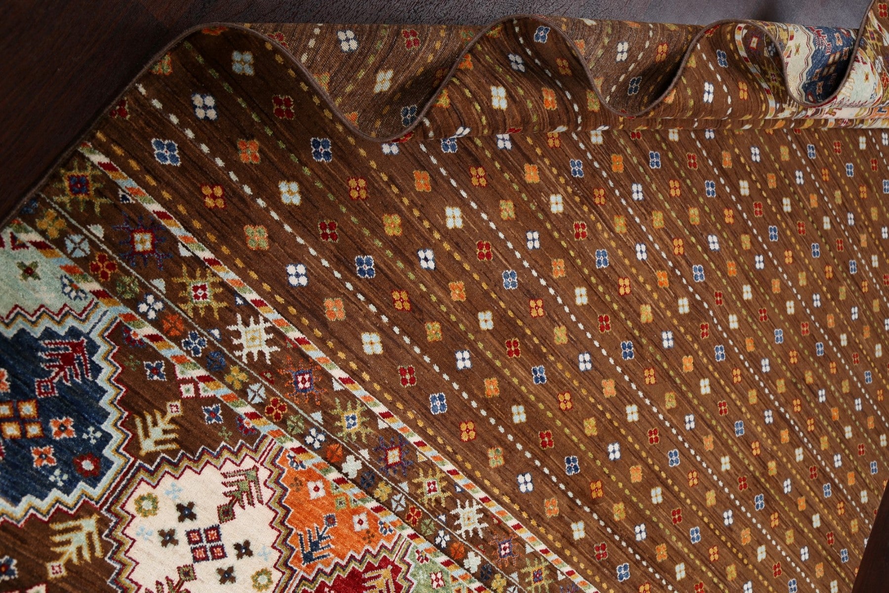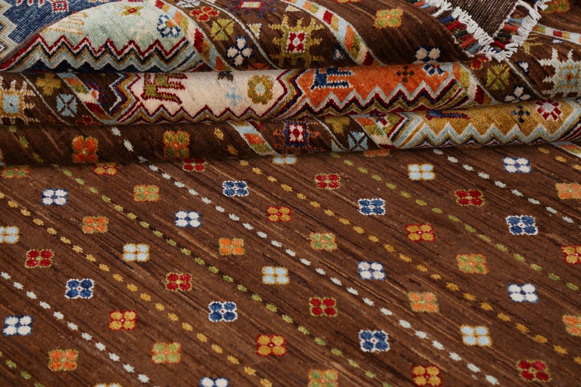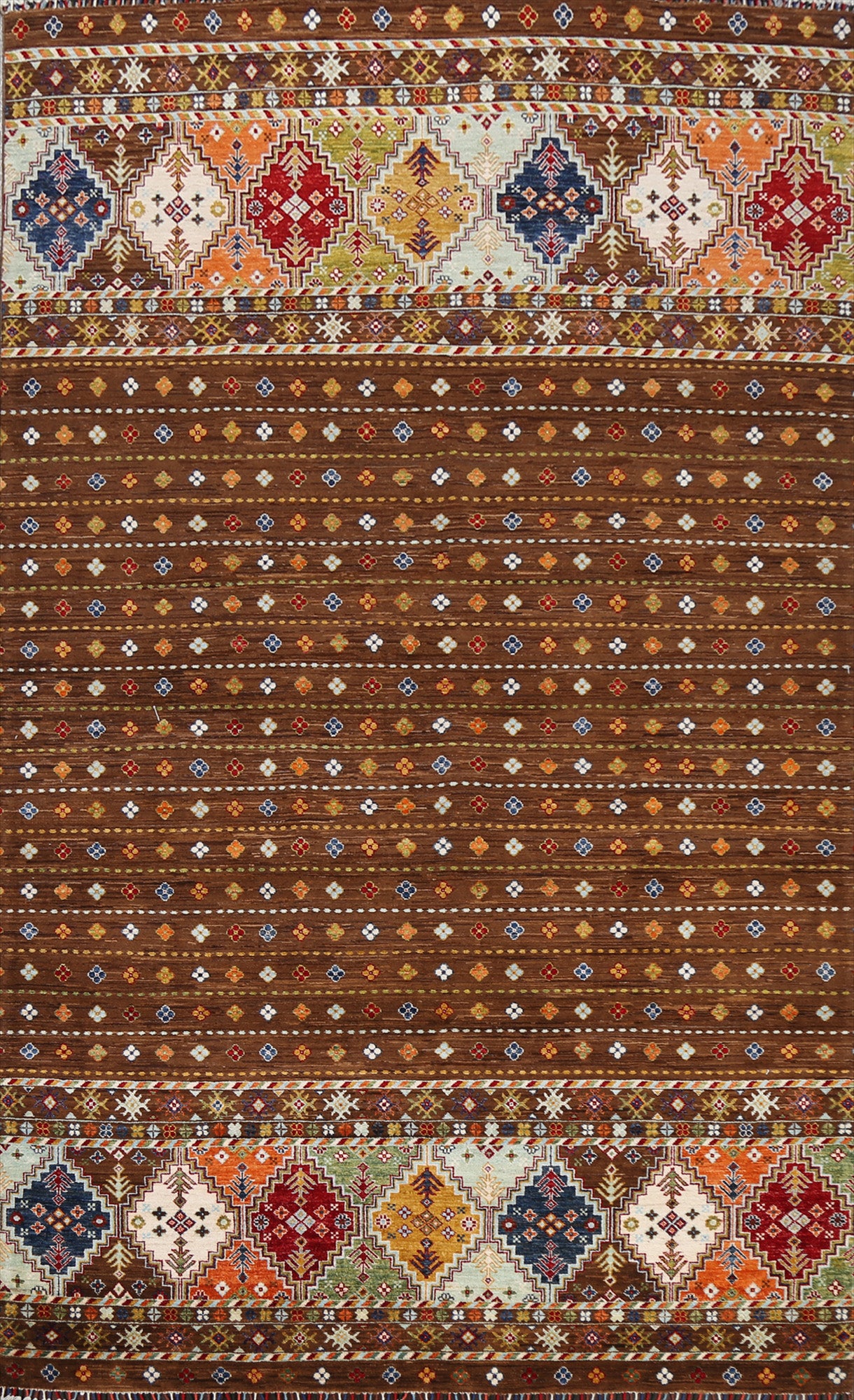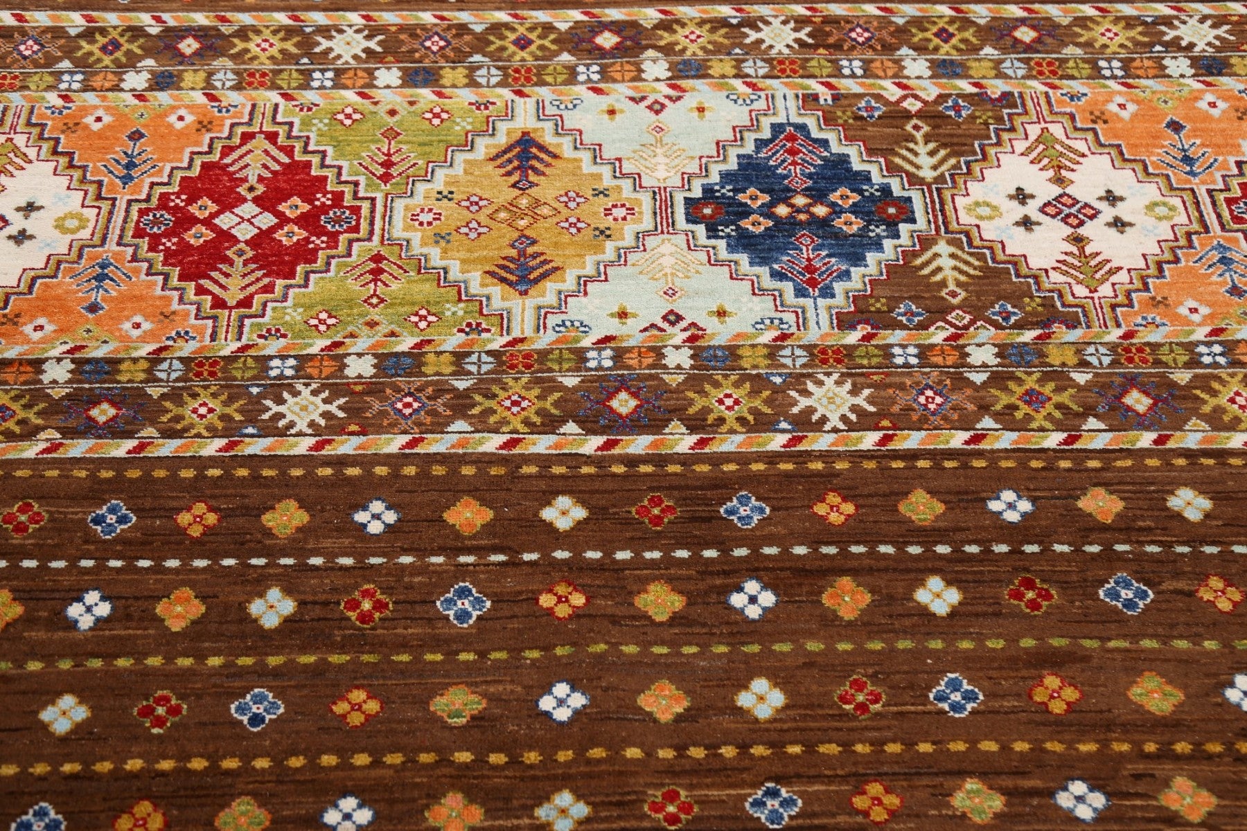 A Beautiful Genuine Persia ( Persia ) Kazak rug is Hand Knotted by skillful weavers in Persia ( Persia ) with 100% Wool Material. This rug is in New, First Quality condition. dimensions are 9' 9'' X 6' 9'' in foot and 297 X 206 in centimeter. the primary color is Brown.