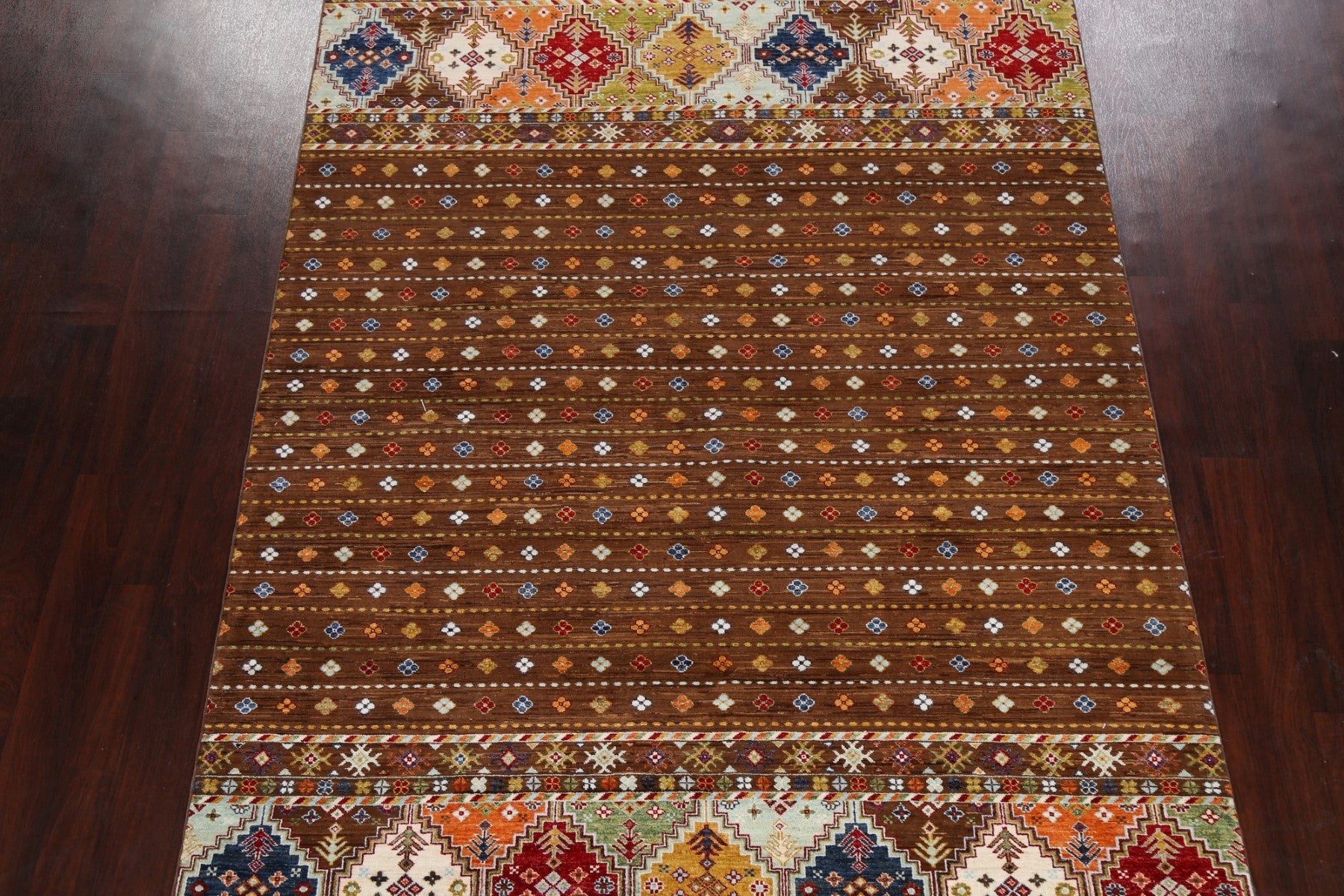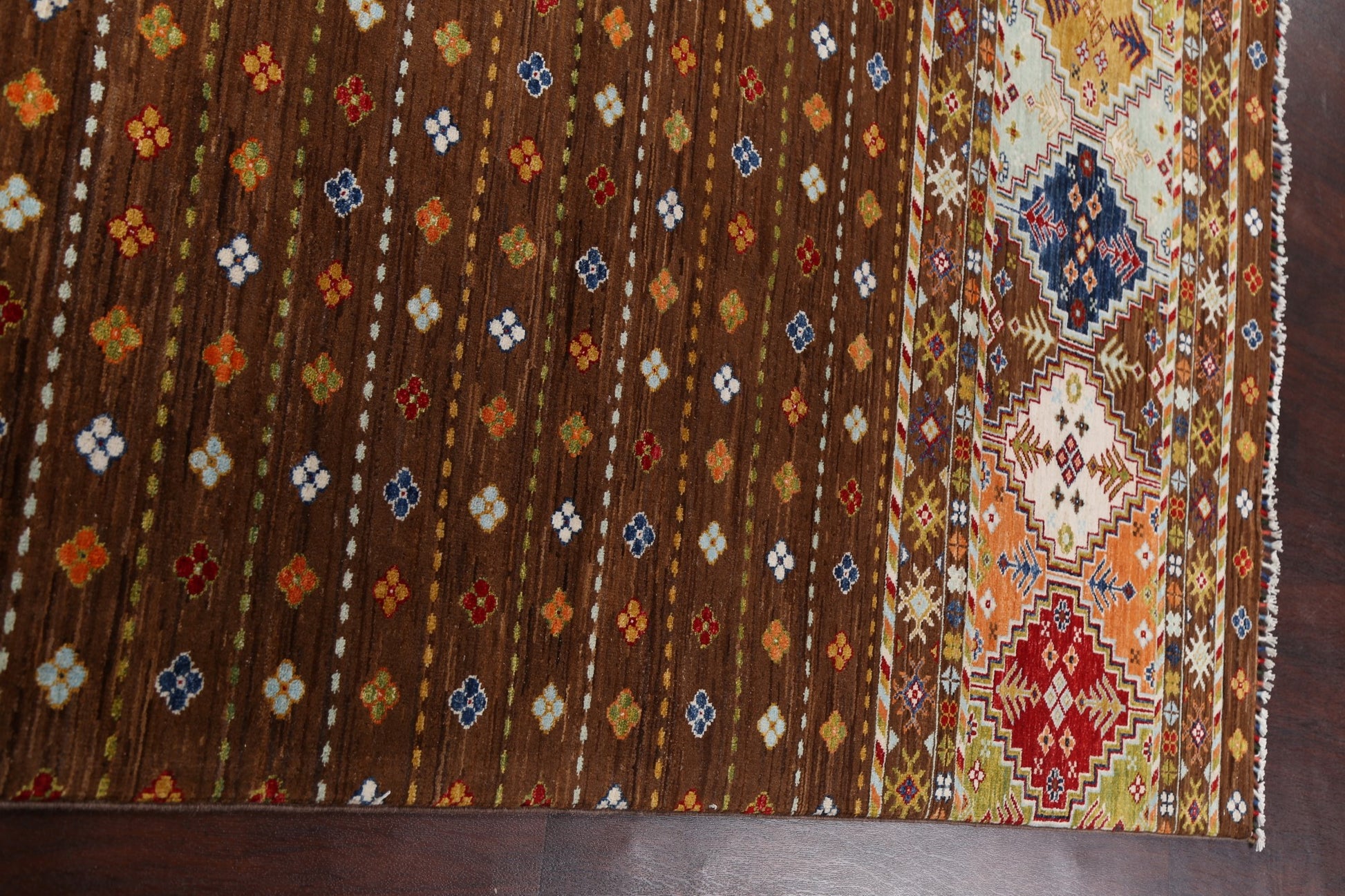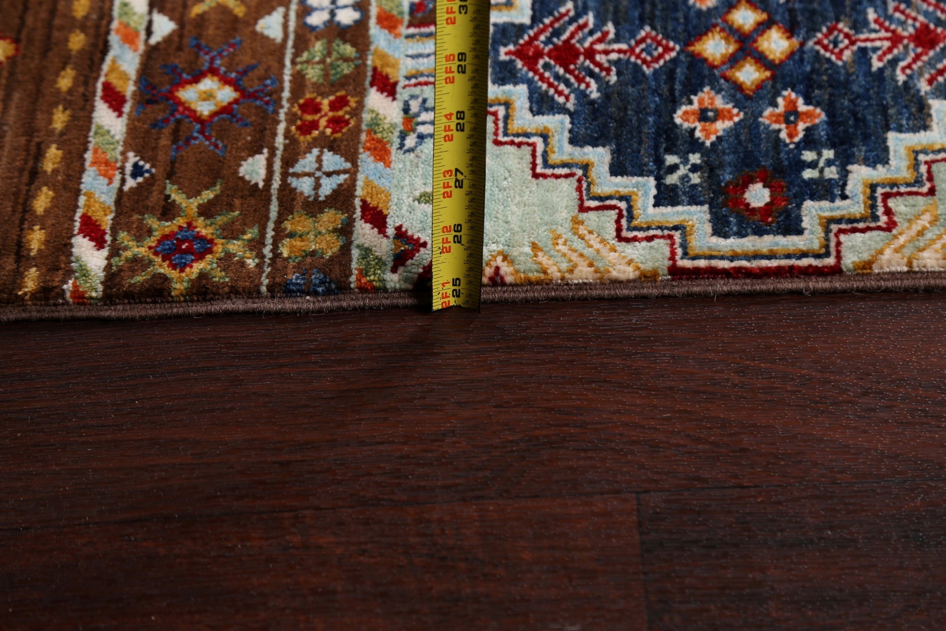 A Beautiful Genuine Persia ( Persia ) Kazak rug is Hand Knotted by skillful weavers in Persia ( Persia ) with 100% Wool Material. This rug is in New, First Quality condition. dimensions are 9' 9'' X 6' 9'' in foot and 297 X 206 in centimeter. the primary color is Brown.