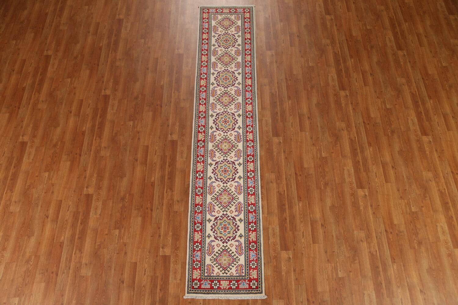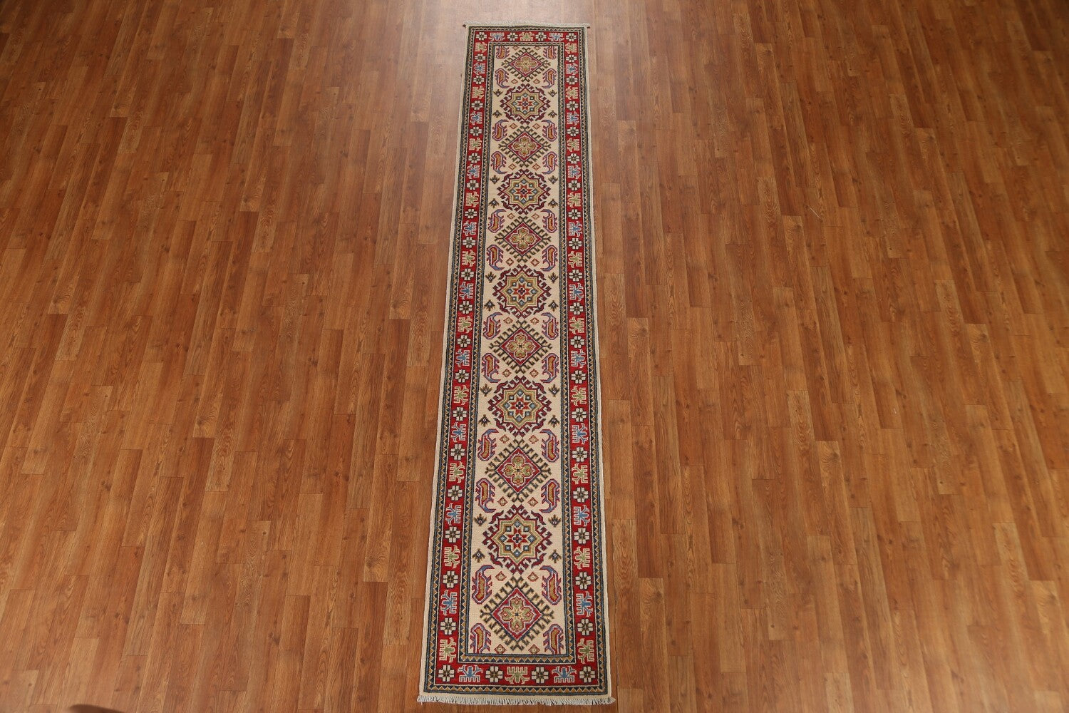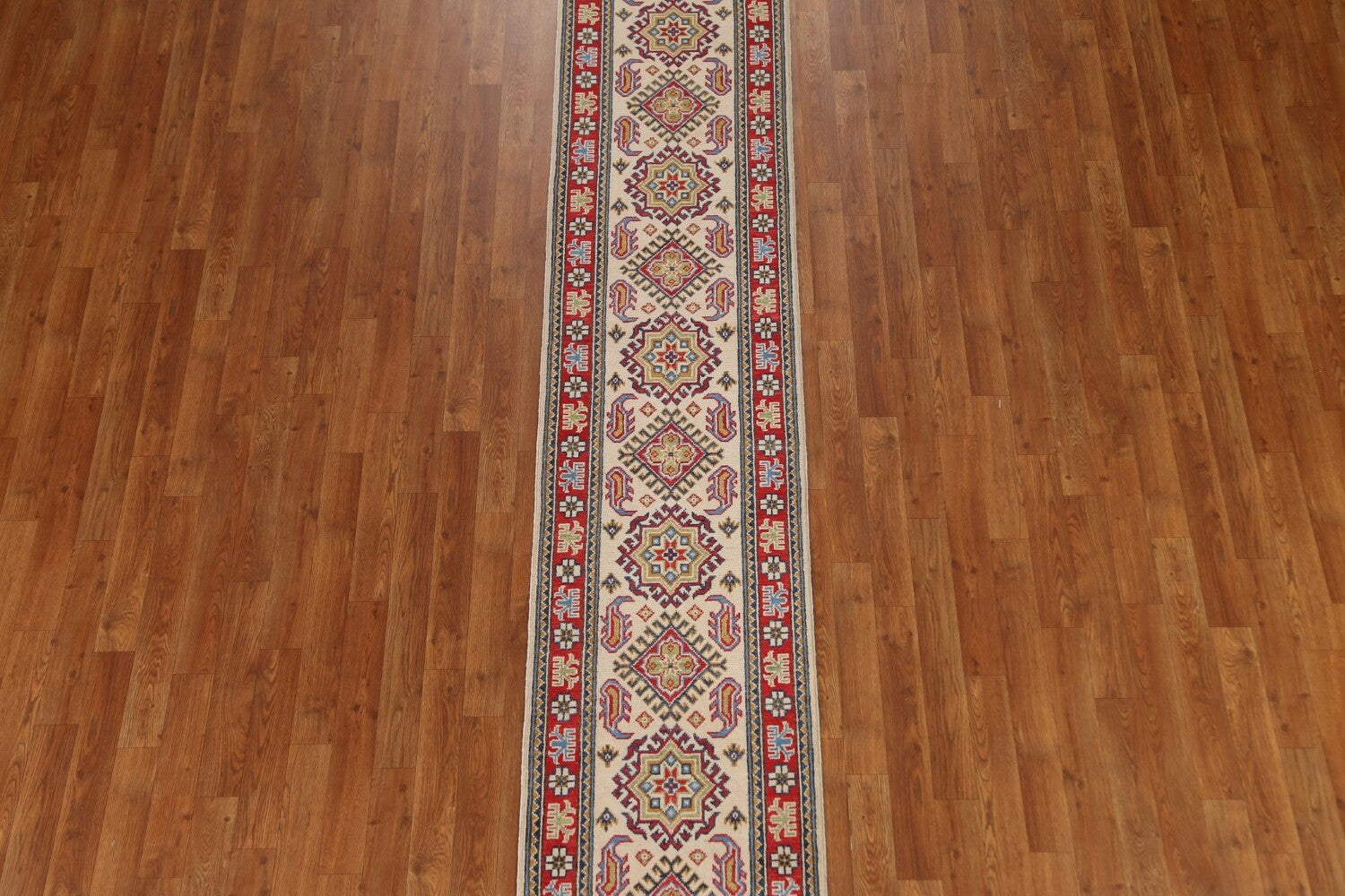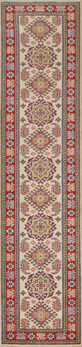 A Beautiful Genuine Pakistan Kazak rug is Hand Knotted by skillful weavers in Pakistan with 100% Wool Material. This rug is in New, First Quality condition. dimensions are 9' 8'' X 2' 0'' in foot and 295 X 61 in centimeter. the primary color is Beige & Ivories.