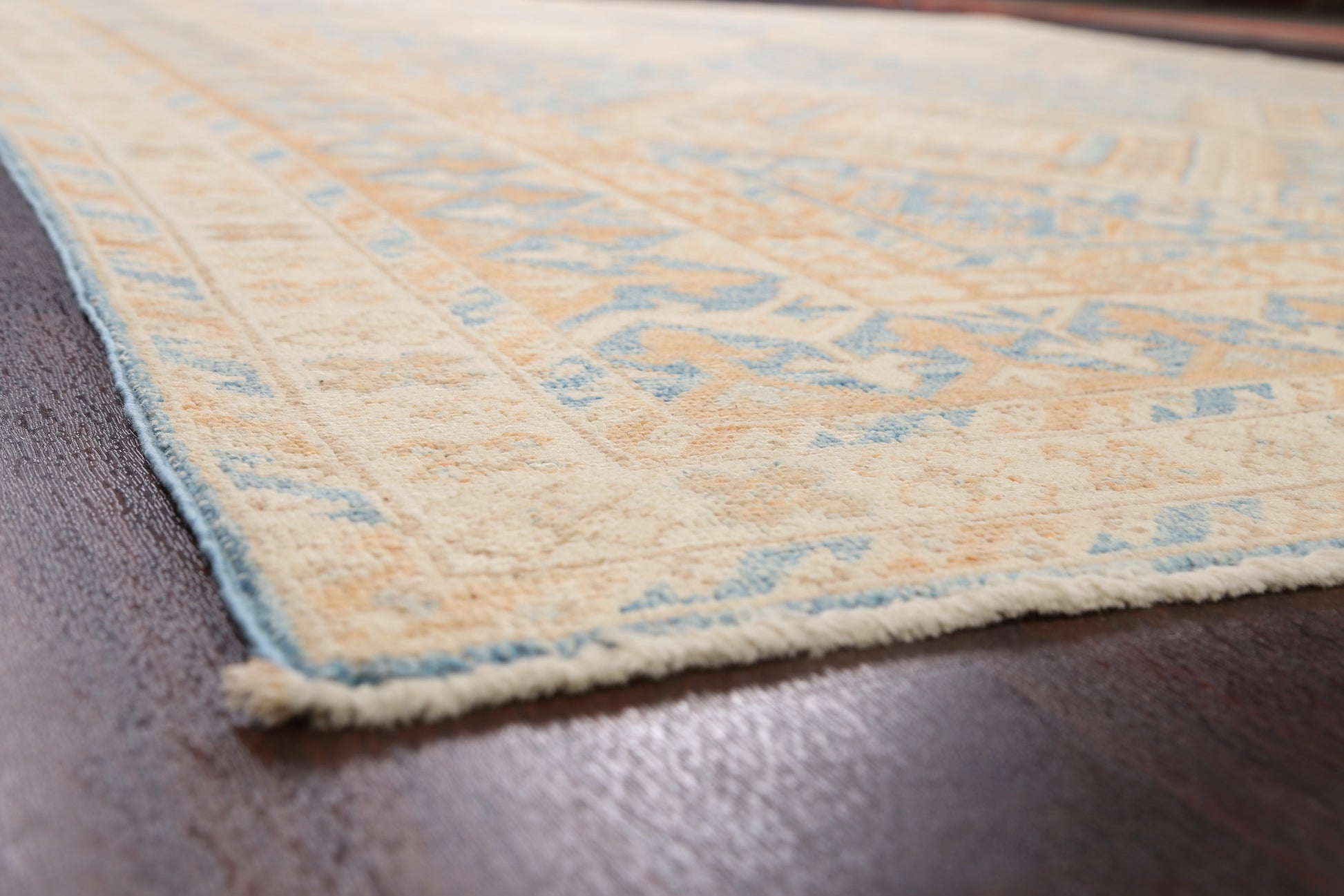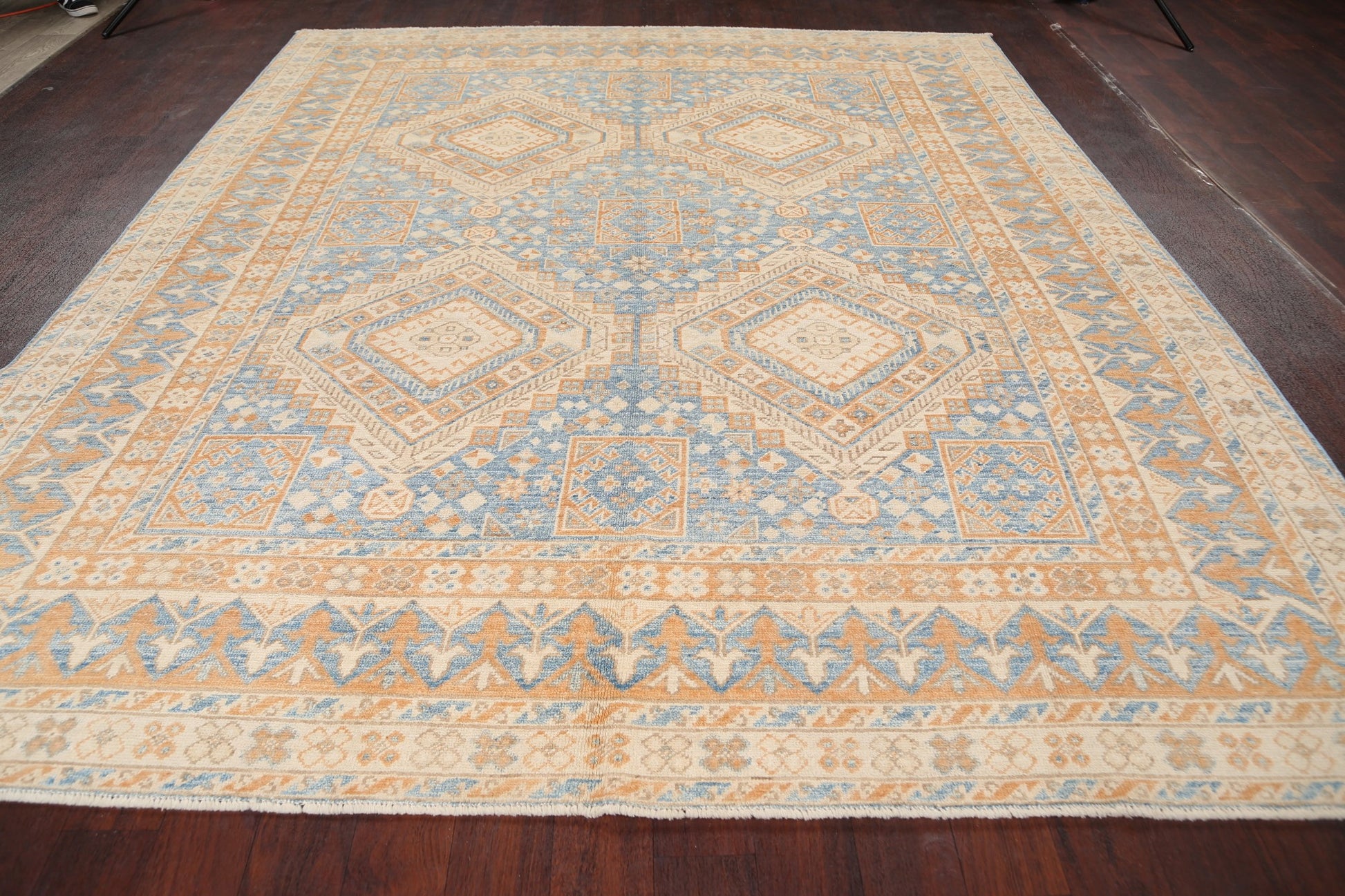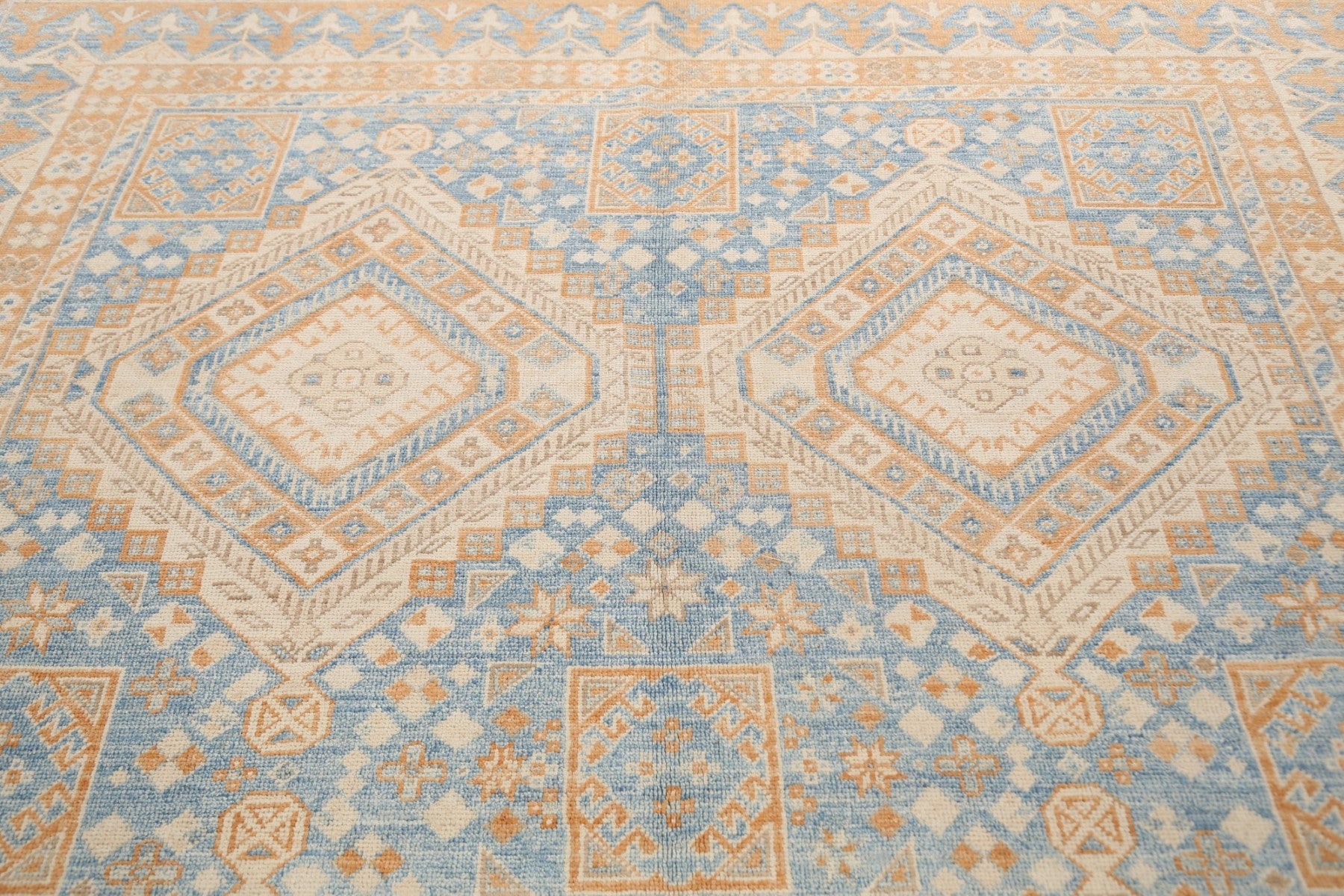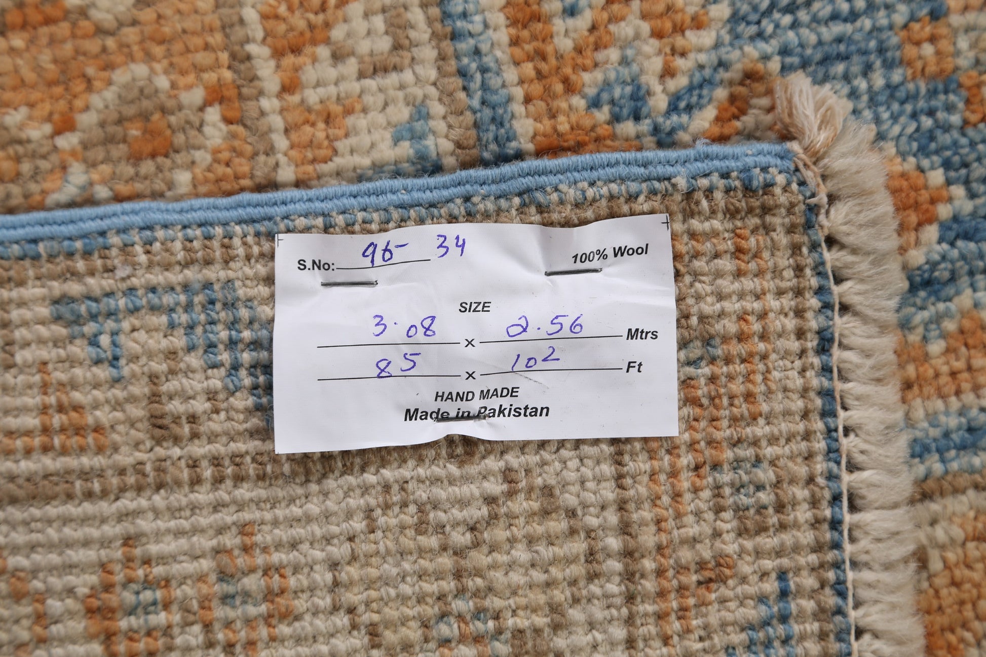 A Beautiful Genuine Pakistan Khotan rug is Hand Knotted by skillful weavers in Pakistan with 100% Wool Material. This rug is in New, First Quality condition. dimensions are 10' 2'' X 8' 5'' in foot and 310 X 257 in centimeter. the primary color is Navy Blue & Blues.