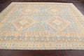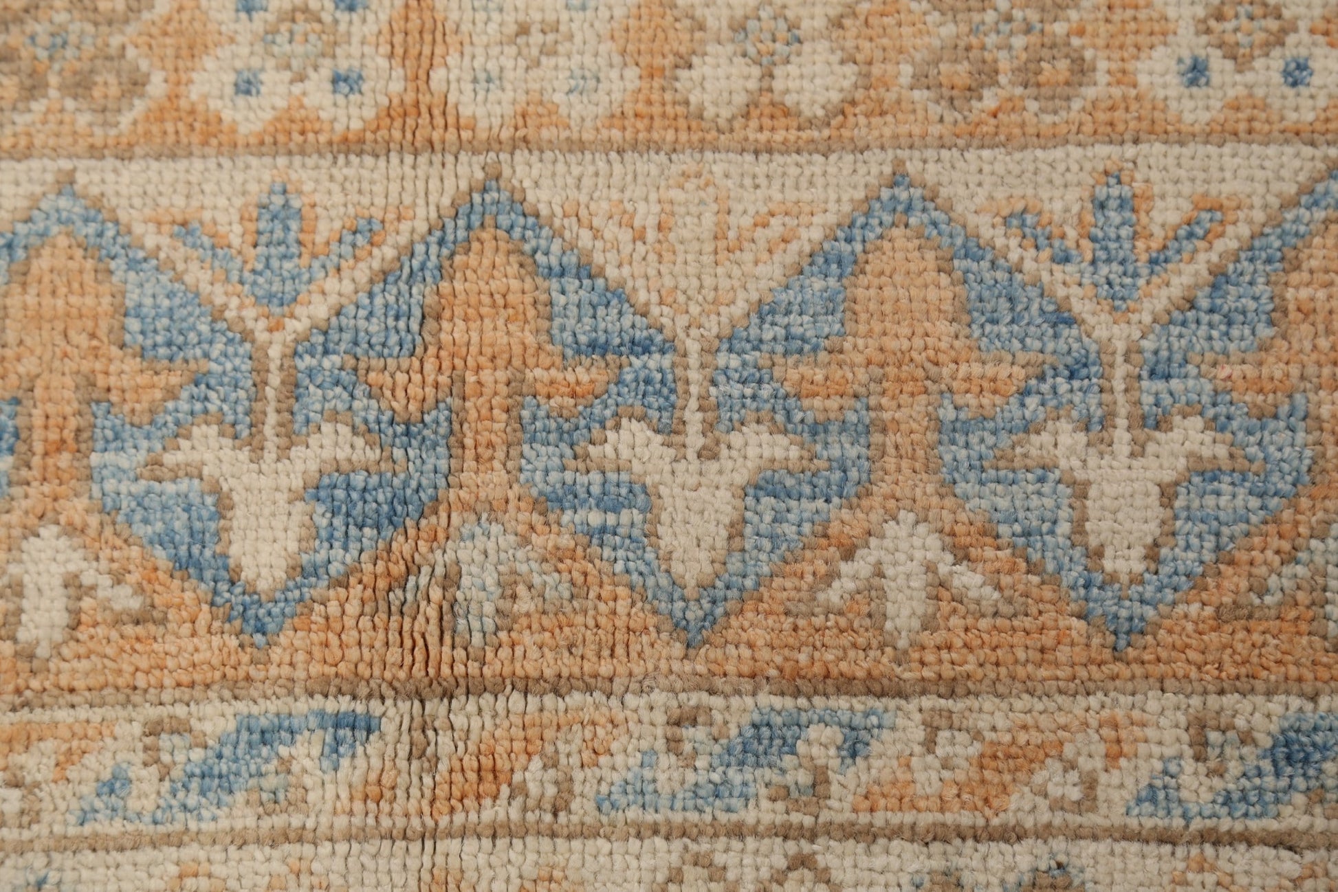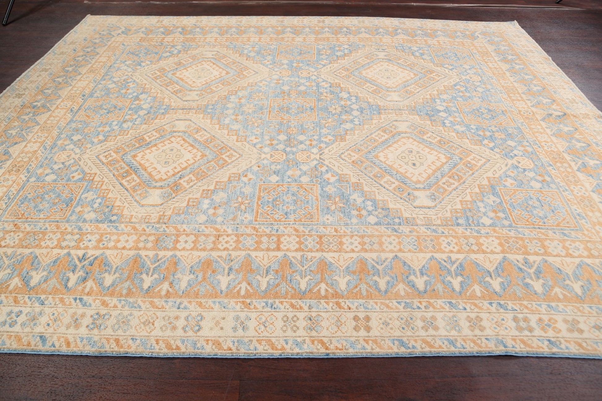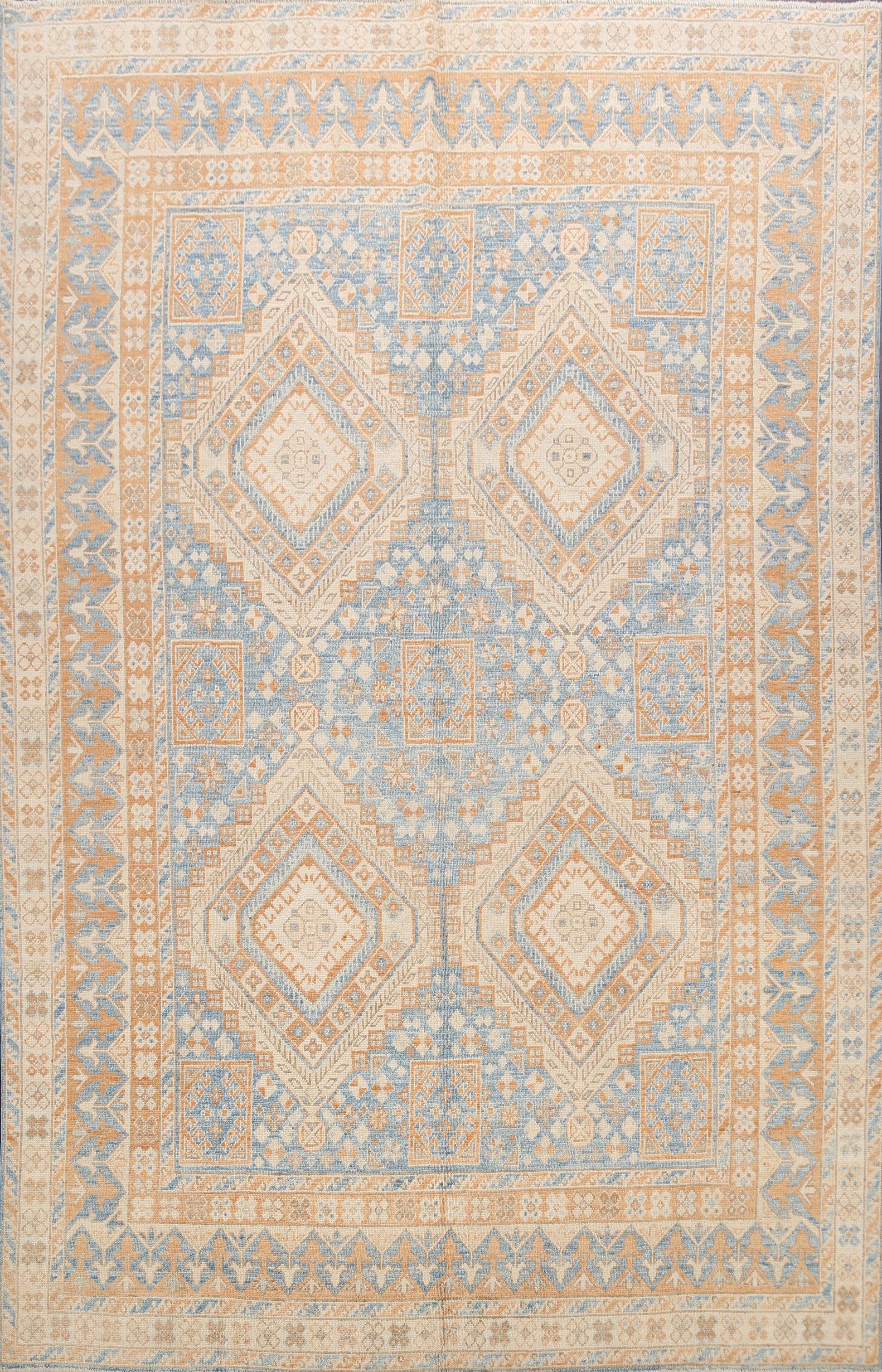 A Beautiful Genuine Pakistan Khotan rug is Hand Knotted by skillful weavers in Pakistan with 100% Wool Material. This rug is in New, First Quality condition. dimensions are 10' 2'' X 8' 5'' in foot and 310 X 257 in centimeter. the primary color is Navy Blue & Blues.