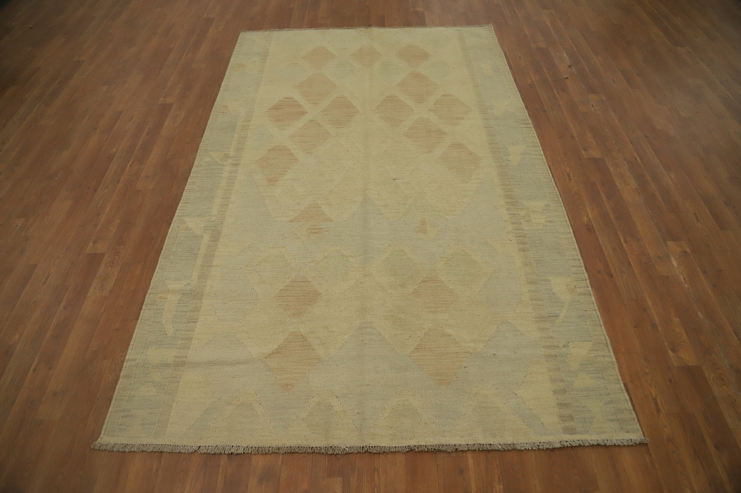 A Beautiful Genuine Pakistan Kilim rug is Hand Woven by skillful weavers in Pakistan with 100% Wool Material. This rug is in New, First Quality condition. dimensions are 8' 1'' X 4' 11'' in foot and 246 X 150 in centimeter. the primary color is Yellow & Gold.