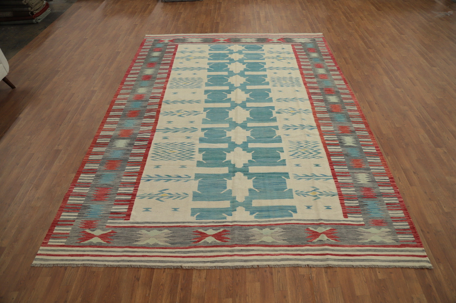 A Beautiful Genuine Pakistan Kilim rug is Hand Woven by skillful weavers in Pakistan with 100% Wool Material. This rug is in New, First Quality condition. dimensions are 11' 10'' X 8' 8'' in foot and 361 X 264 in centimeter. the primary color is Beige & Ivories.