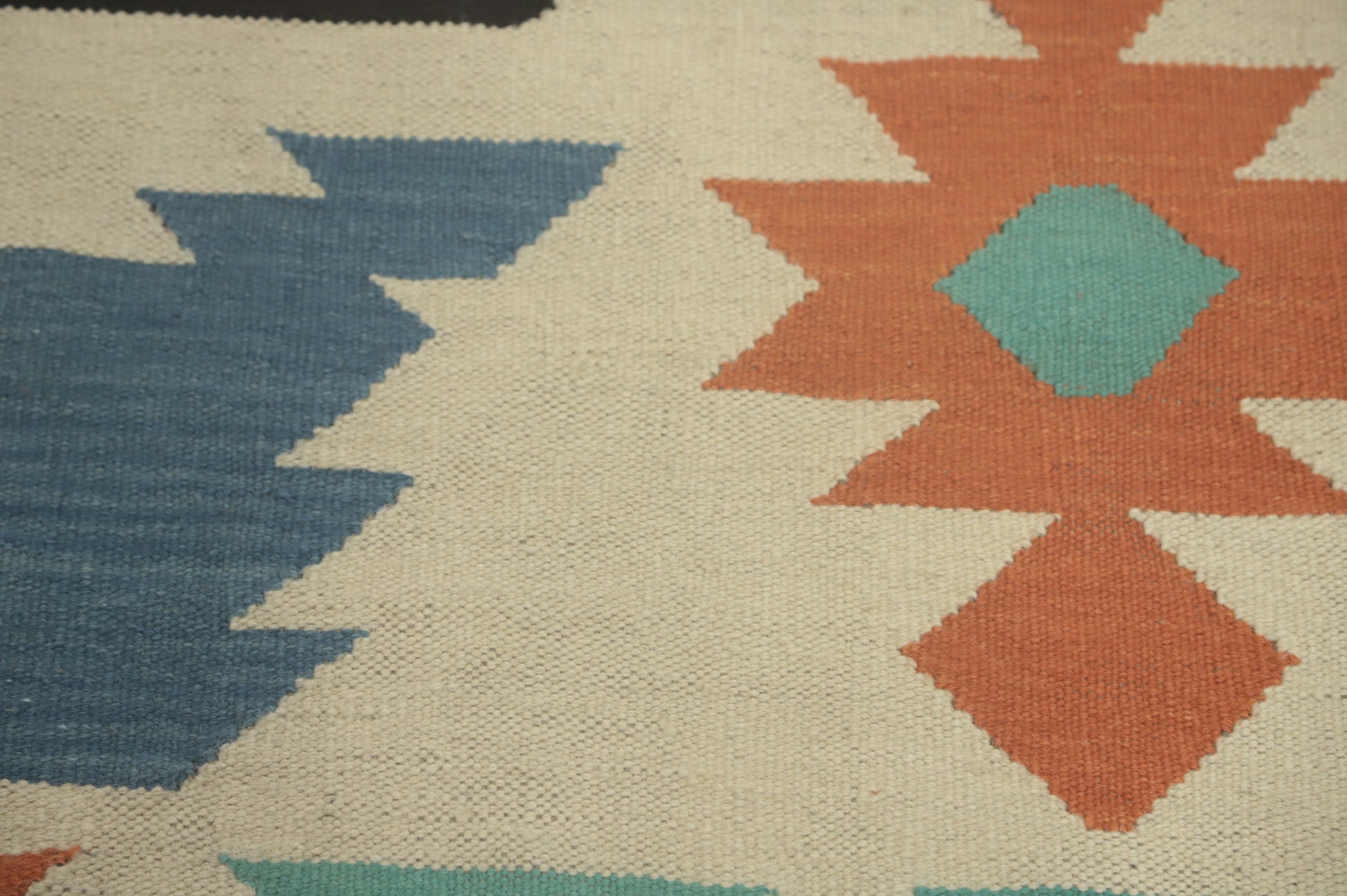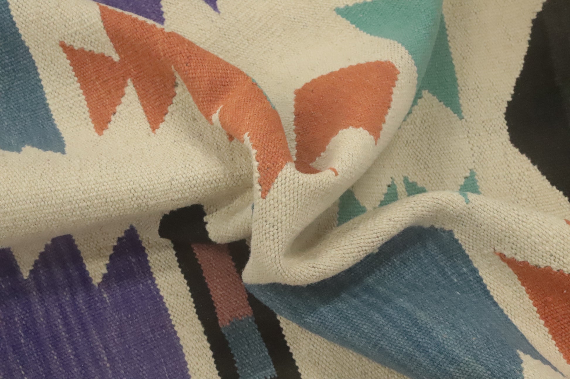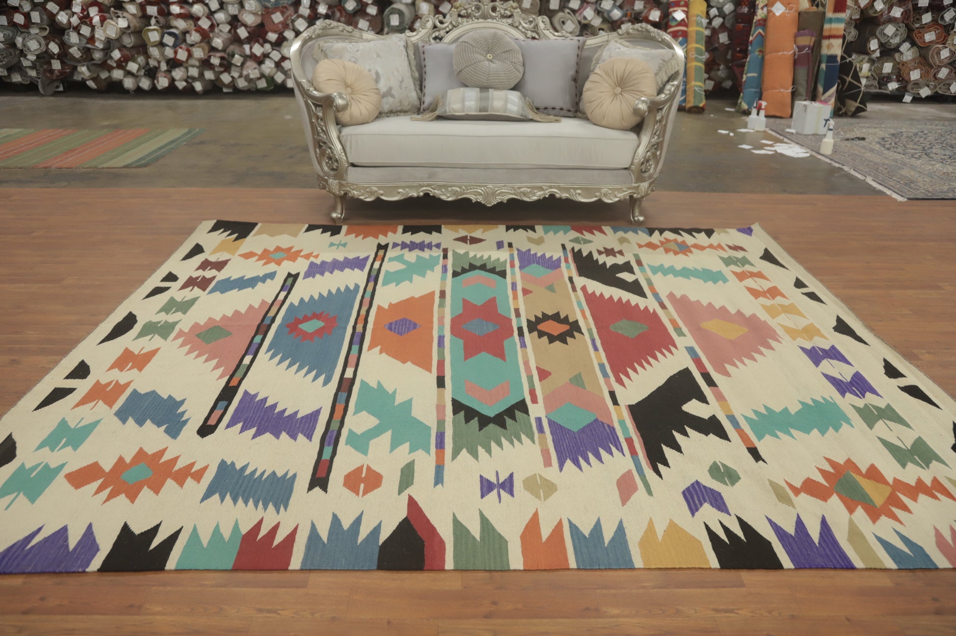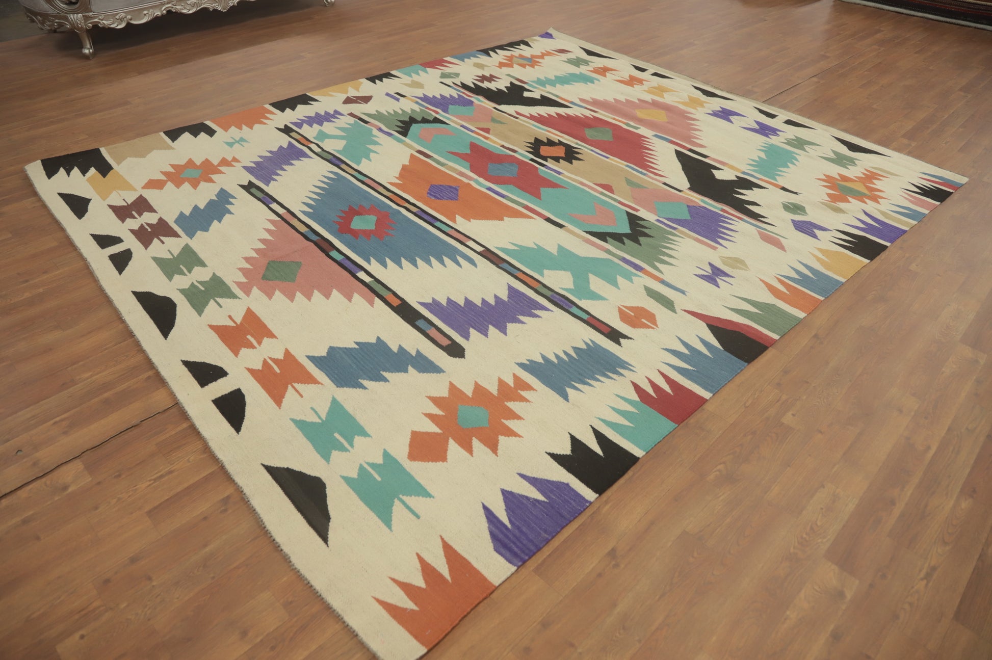 A Beautiful Genuine Pakistan Kilim rug is Hand Woven by skillful weavers in Pakistan with 100% Wool Material. This rug is in New, First Quality condition. dimensions are 10' 0'' X 8' 4'' in foot and 305 X 254 in centimeter. the primary color is Beige & Ivories.