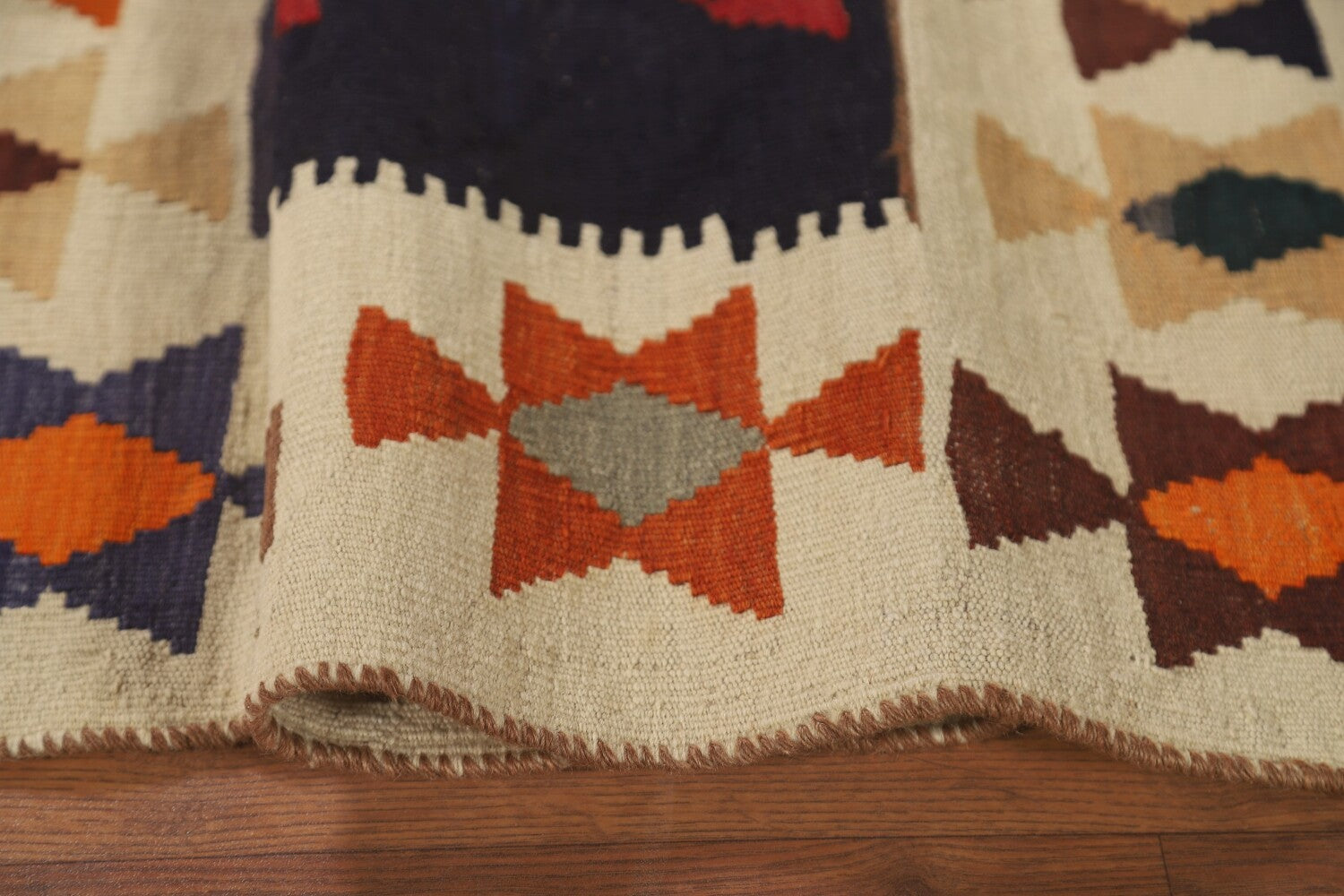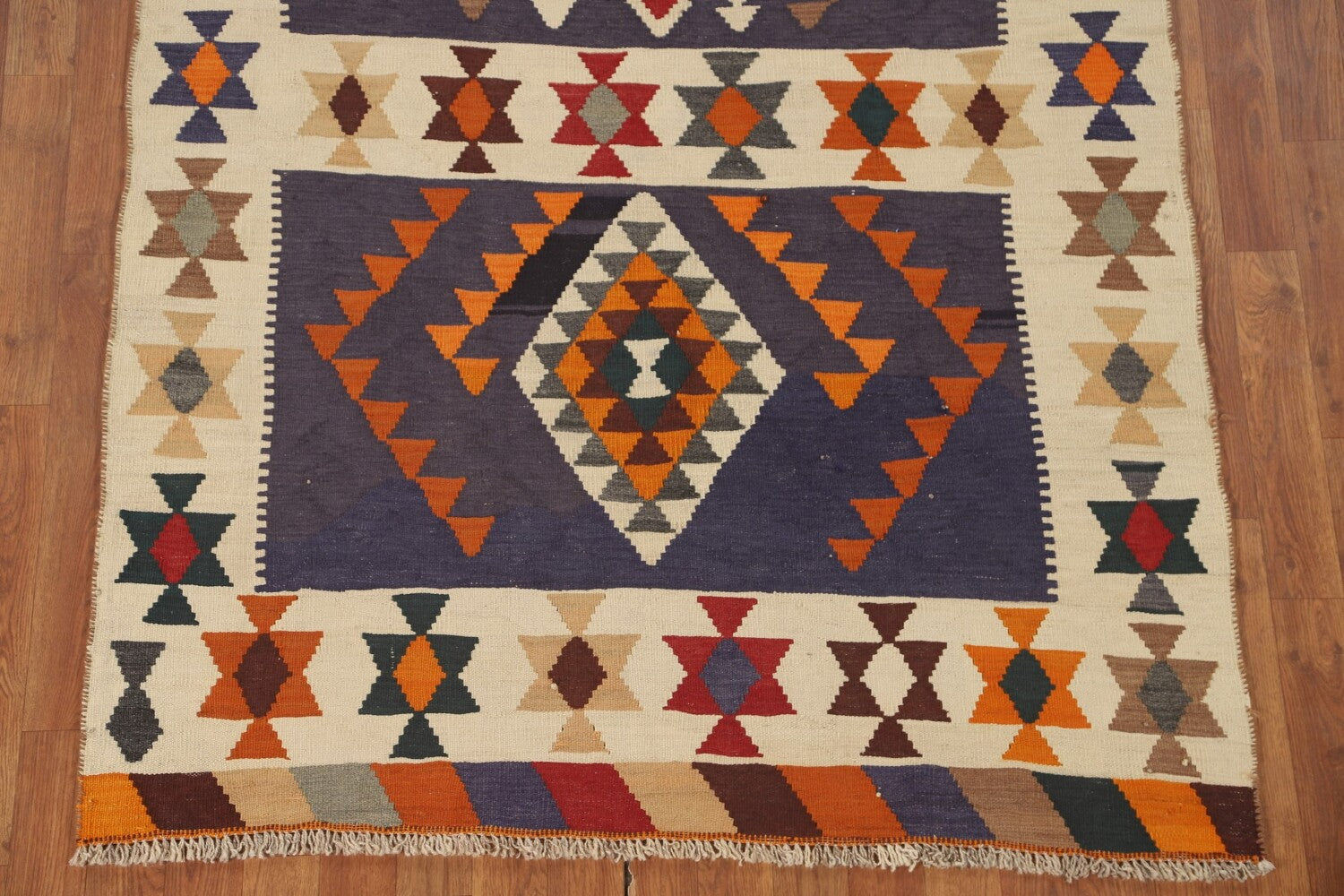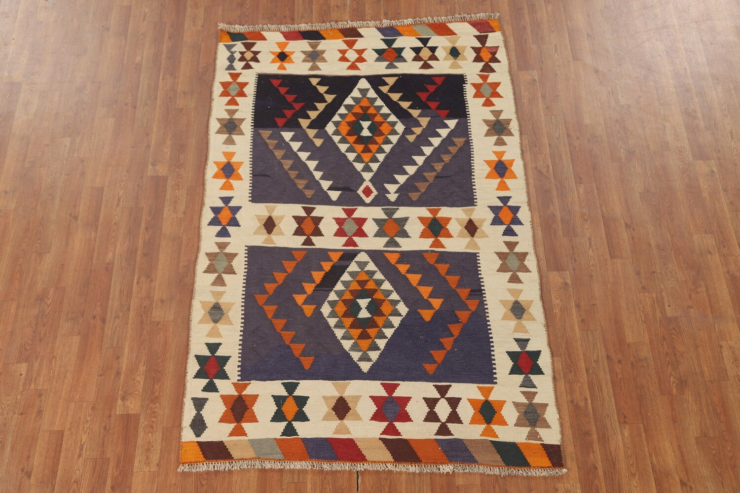 A Beautiful Genuine Persia ( Persia ) Kilim (Qashqai) rug is Hand Woven by skillful weavers in Persia ( Persia ) with 100% Wool Material. This rug is in New, First Quality condition. dimensions are 6' 6'' X 4' 4'' in foot and 198 X 132 in centimeter. the primary color is Navy Blue & Blues.