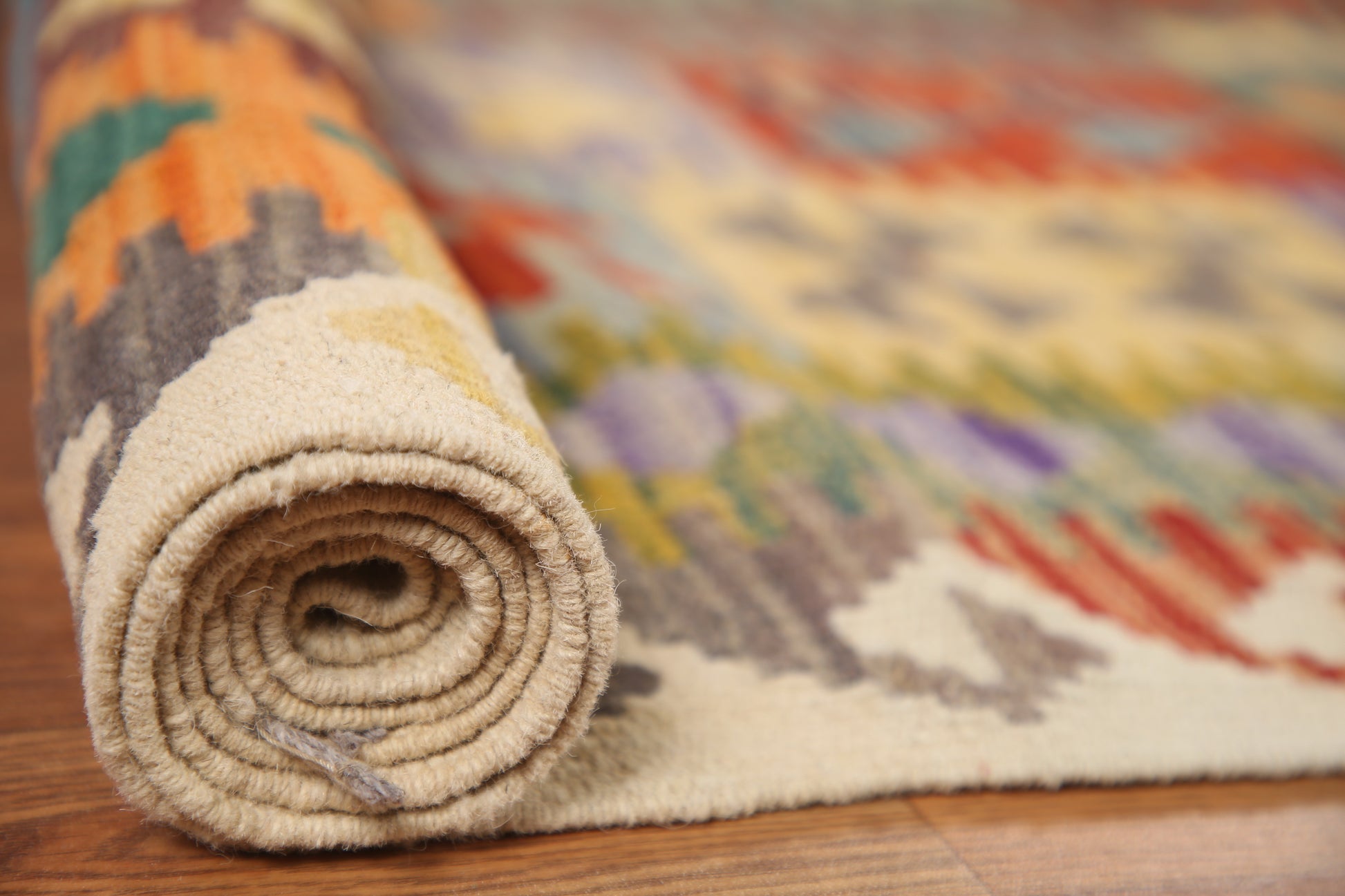 A Beautiful Genuine Pakistan Kilim rug is Hand Woven by skillful weavers in Pakistan with 100% Wool Material. This rug is in New, First Quality condition. dimensions are 13' 1'' X 9' 7'' in foot and 399 X 292 in centimeter. the primary color is Multi-Colored.