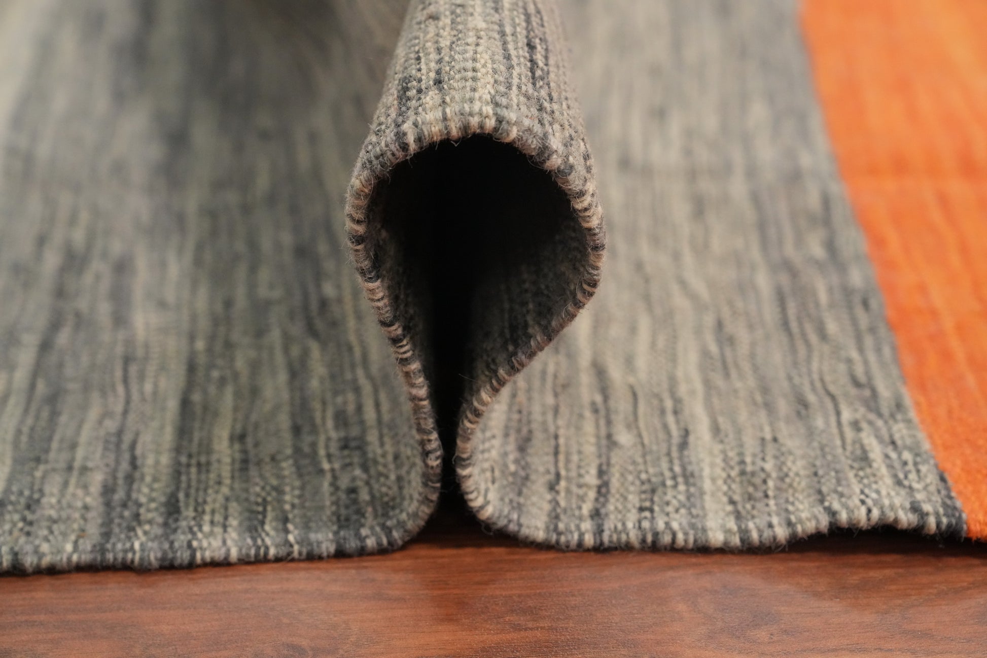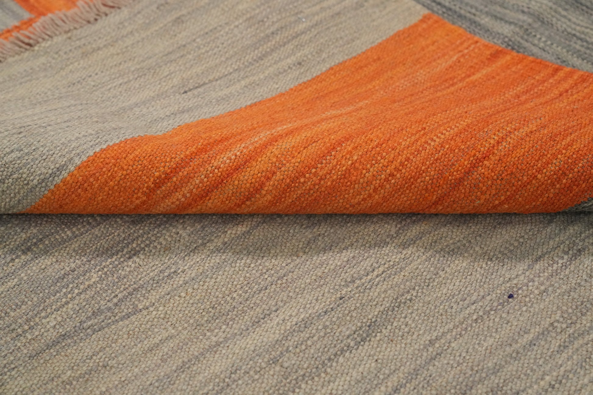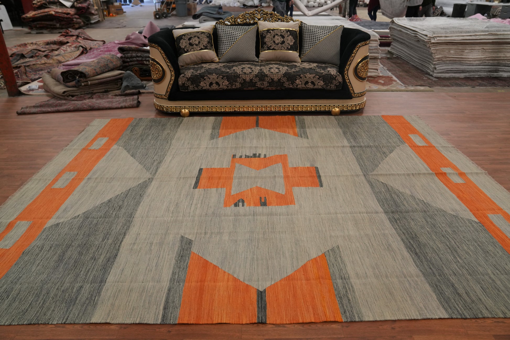 A Beautiful Genuine Pakistan Kilim rug is Hand Woven by skillful weavers in Pakistan with 100% Wool Material. This rug is in New, First Quality condition. dimensions are 11' 10'' X 9' 4'' in foot and 361 X 284 in centimeter. the primary color is Greys & Charcoal.