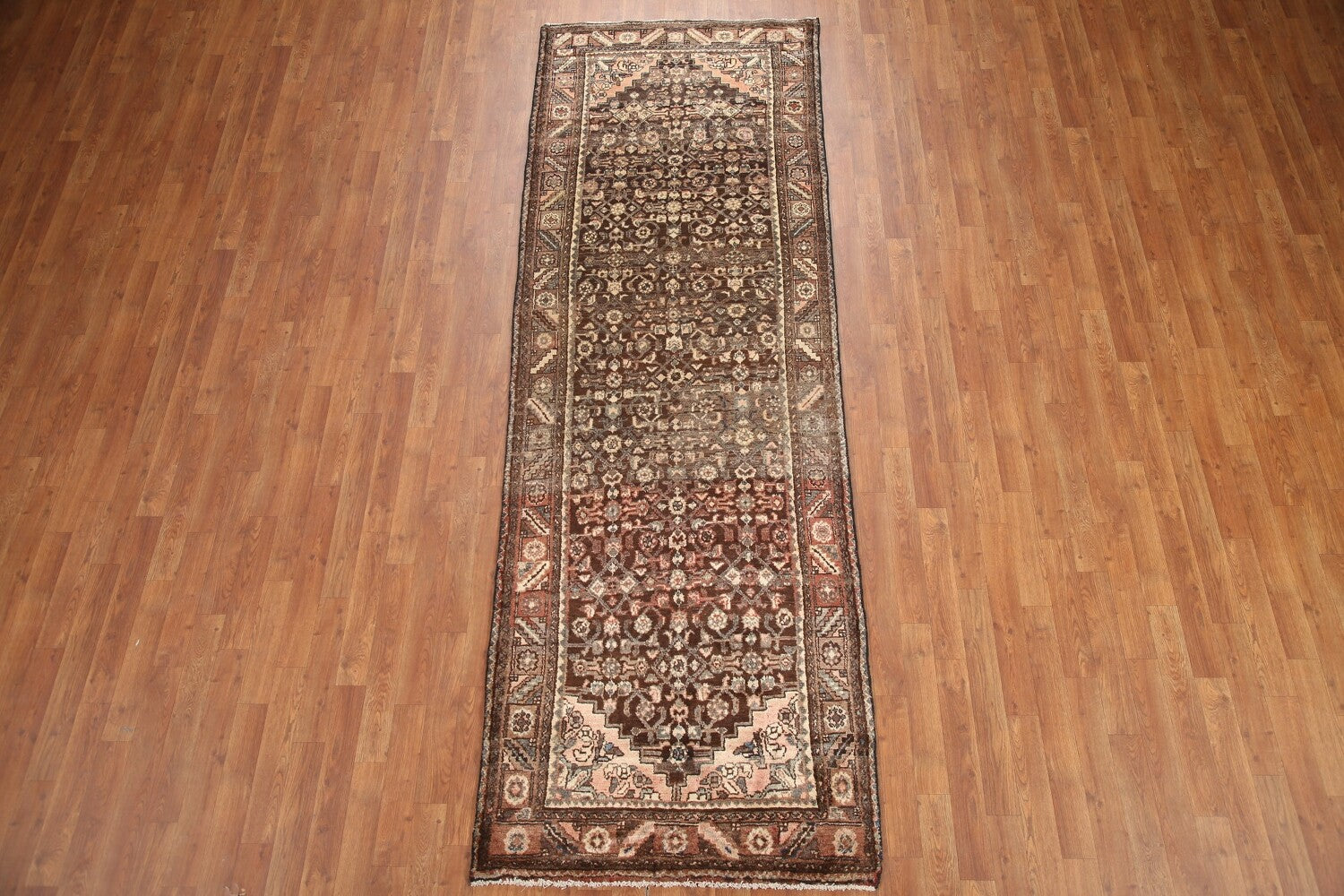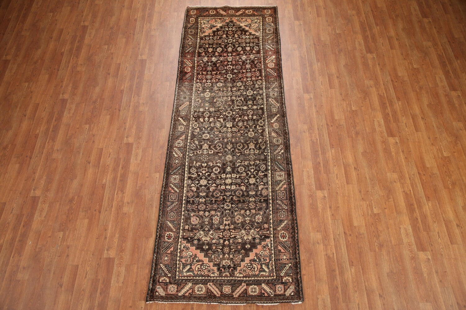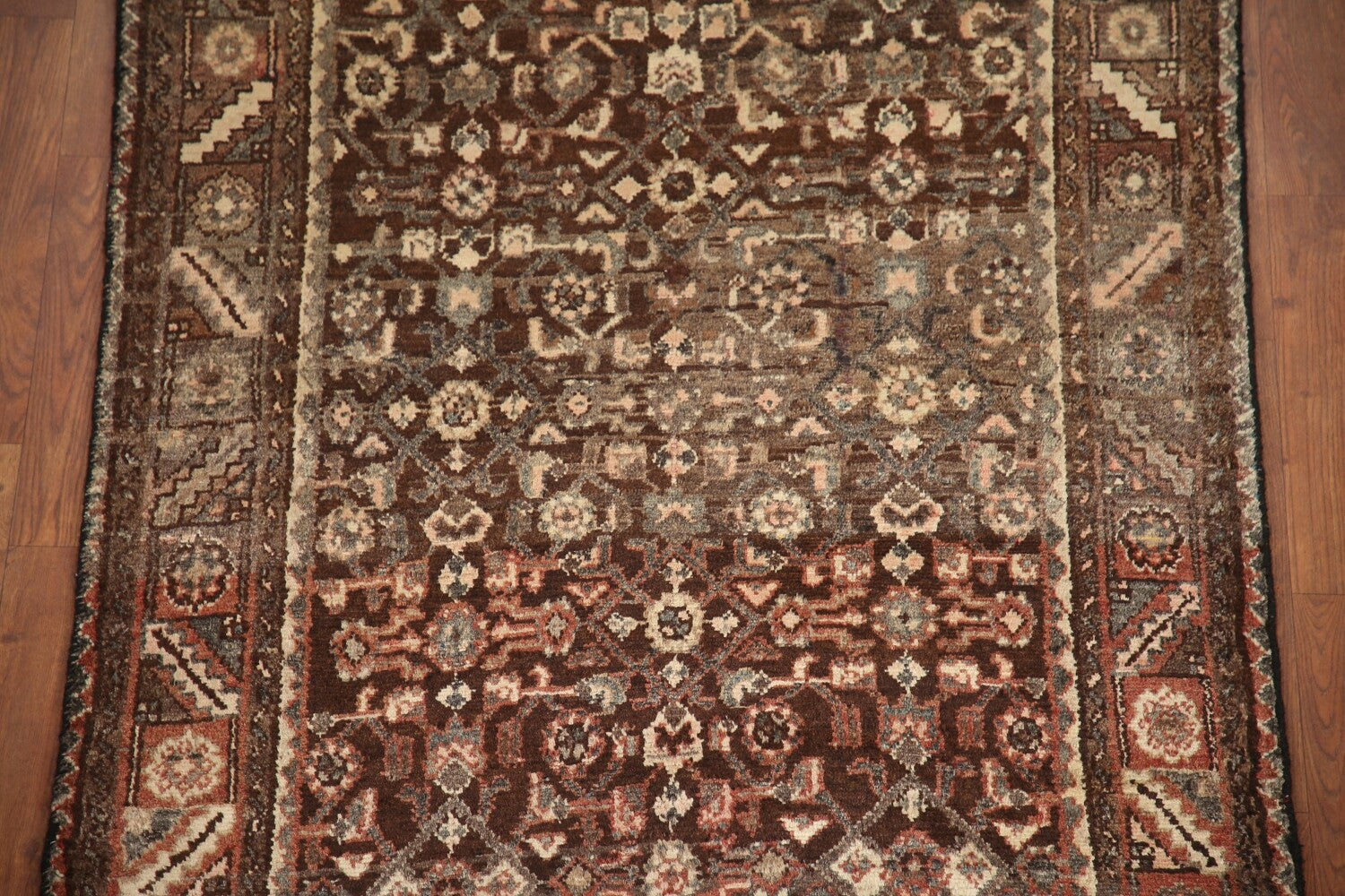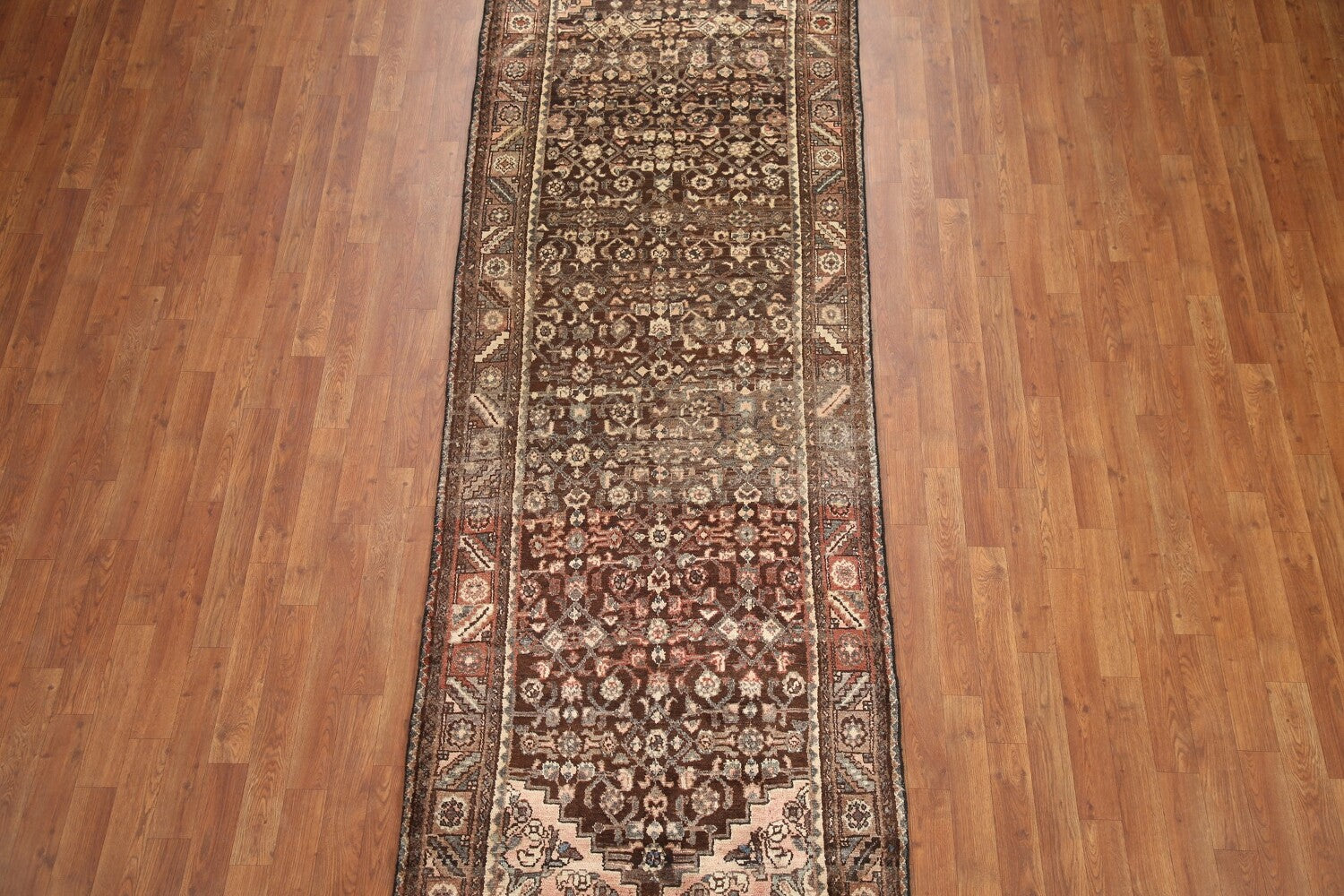 A Beautiful Genuine Persia ( Persia ) Malayer rug is Hand Knotted by skillful weavers in Persia ( Persia ) with 100% Wool Material. This rug is in Very Good (Abrash) condition. dimensions are 10' 2'' X 3' 3'' in foot and 310 X 99 in centimeter. the primary color is Brown.
