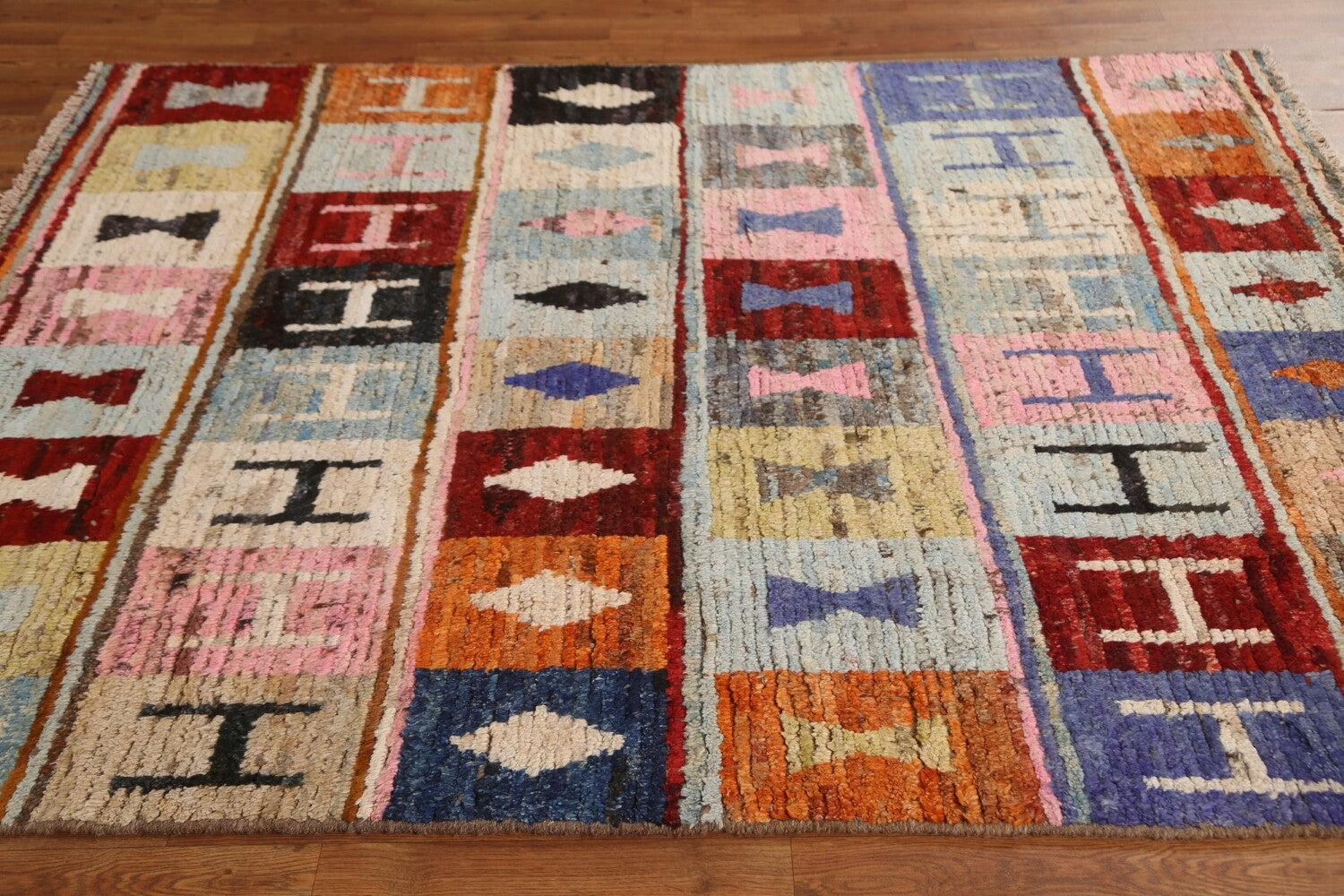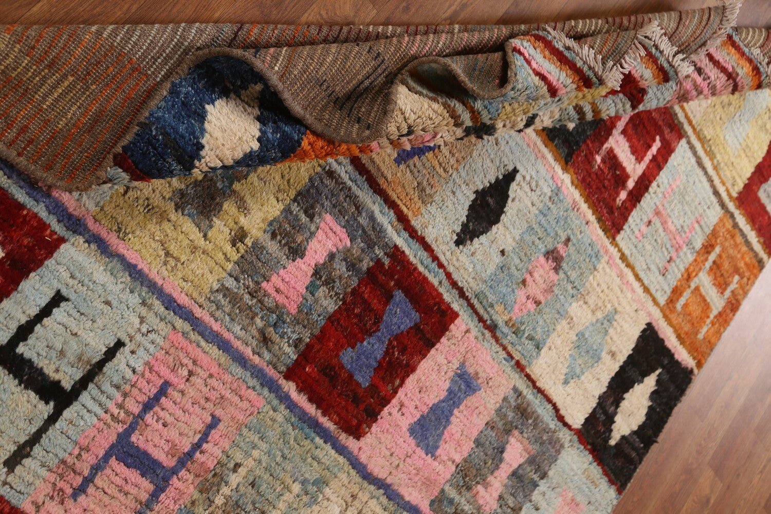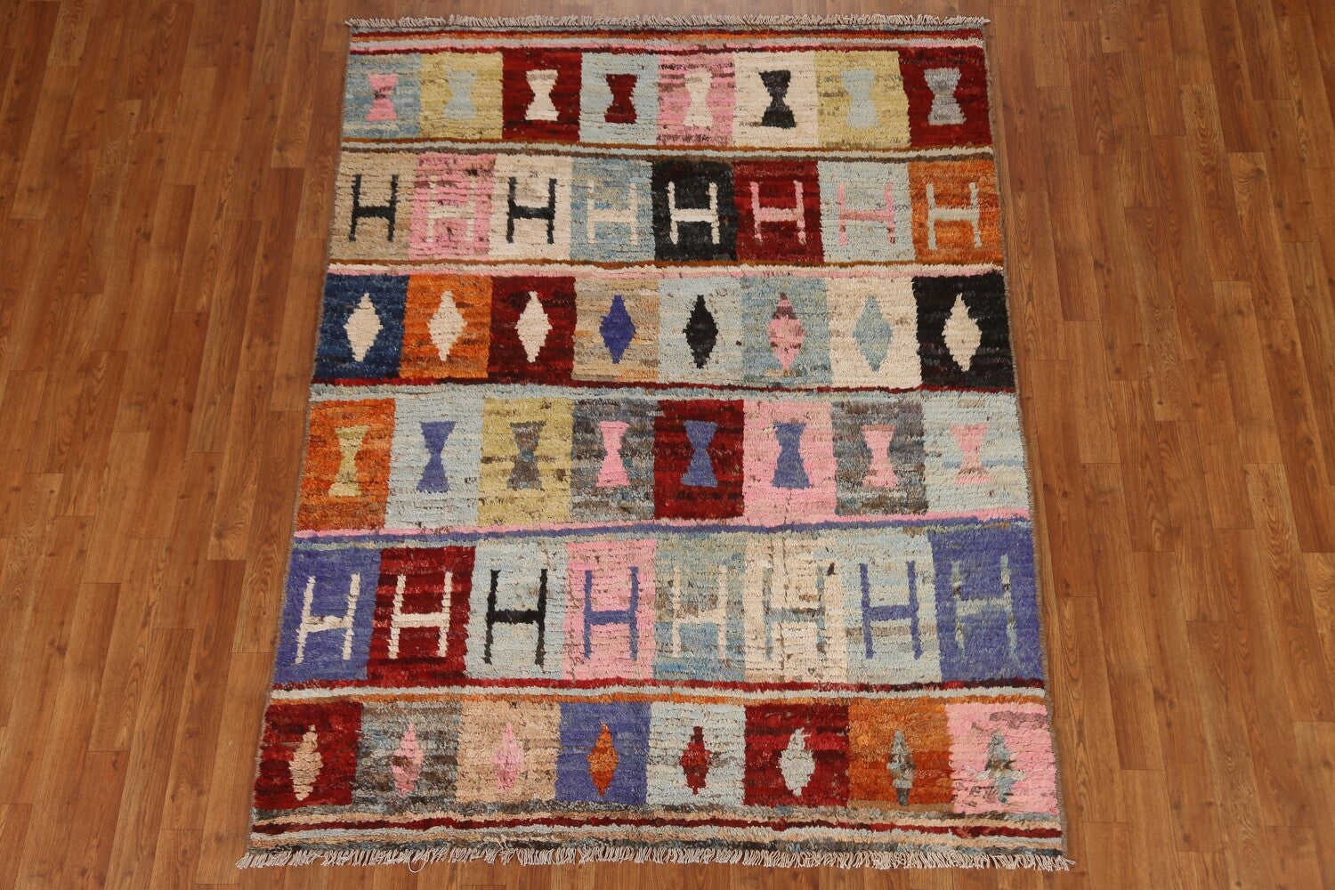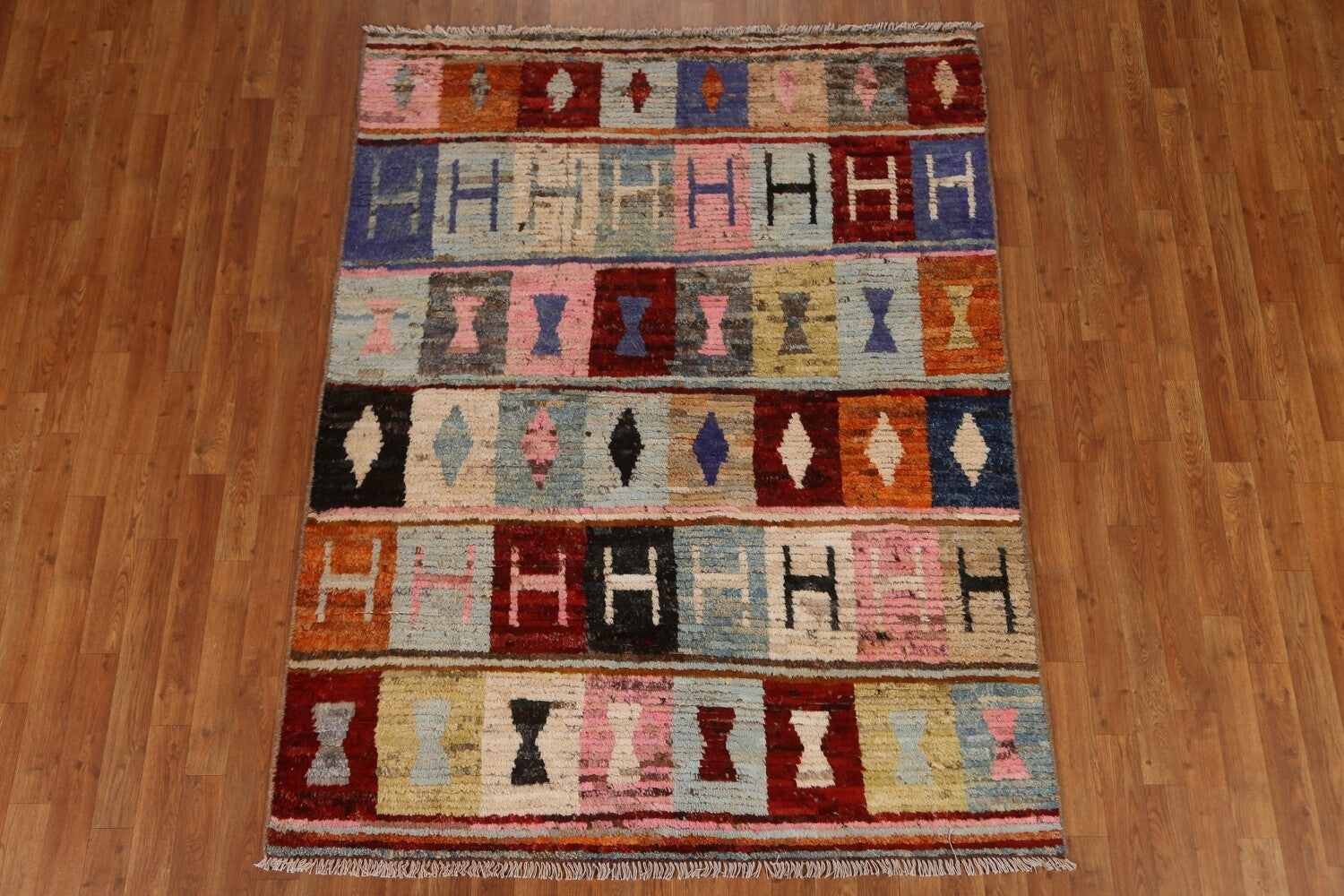 A Beautiful Genuine Pakistan Moroccan rug is Hand Knotted by skillful weavers in Pakistan with 100% Wool Material. This rug is in condition. dimensions are 6' 7'' X 5' 1'' in foot and 201 X 155 in centimeter. the primary color is Multi-Colored.