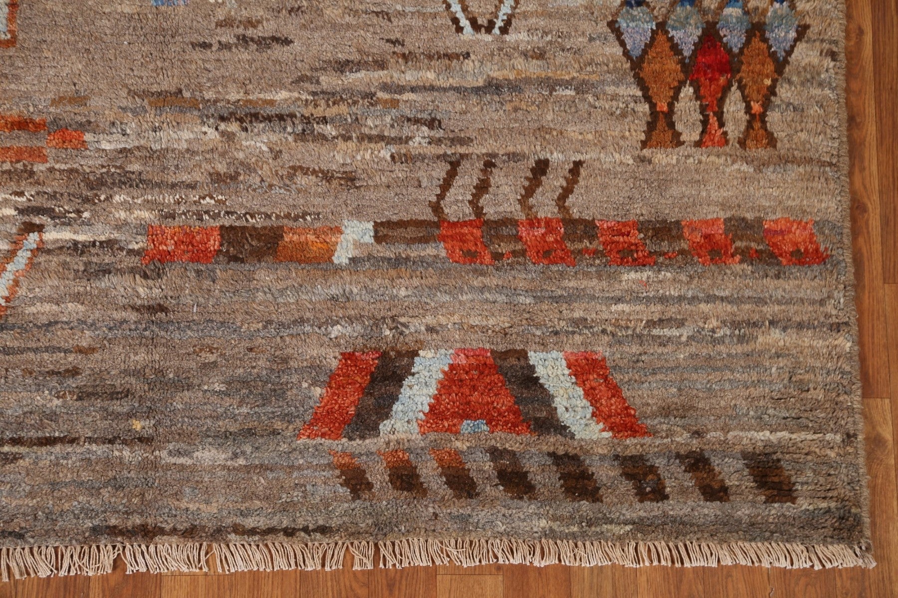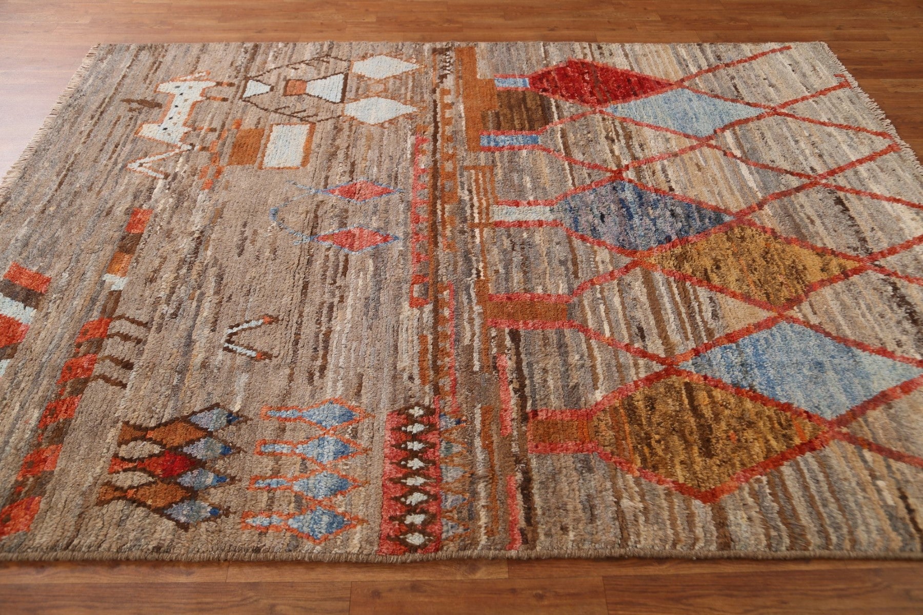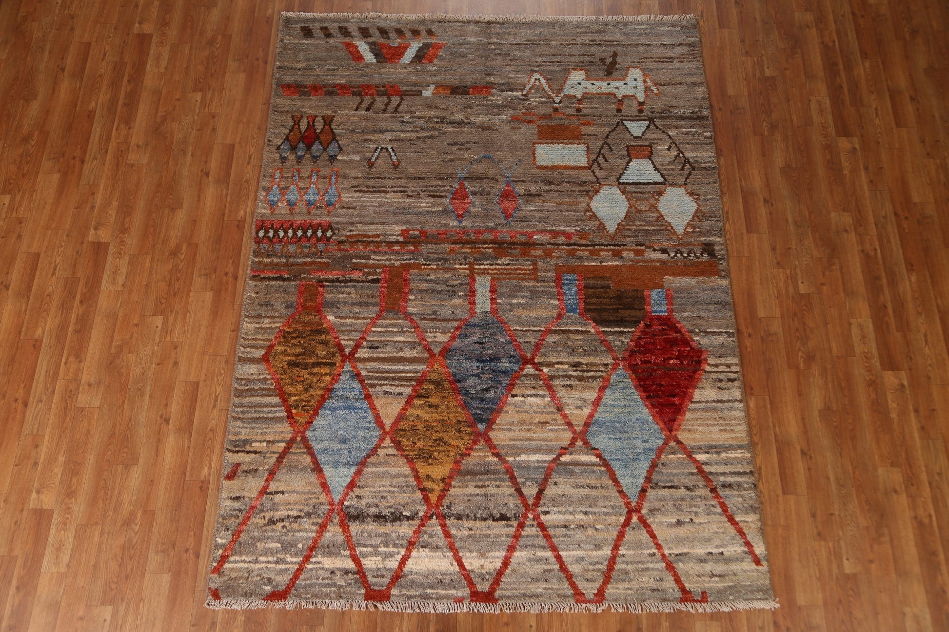 A Beautiful Genuine Pakistan Moroccan rug is Hand Knotted by skillful weavers in Pakistan with 100% Wool Material. This rug is in condition. dimensions are 7' 10'' X 5' 10'' in foot and 239 X 178 in centimeter. the primary color is Brown.