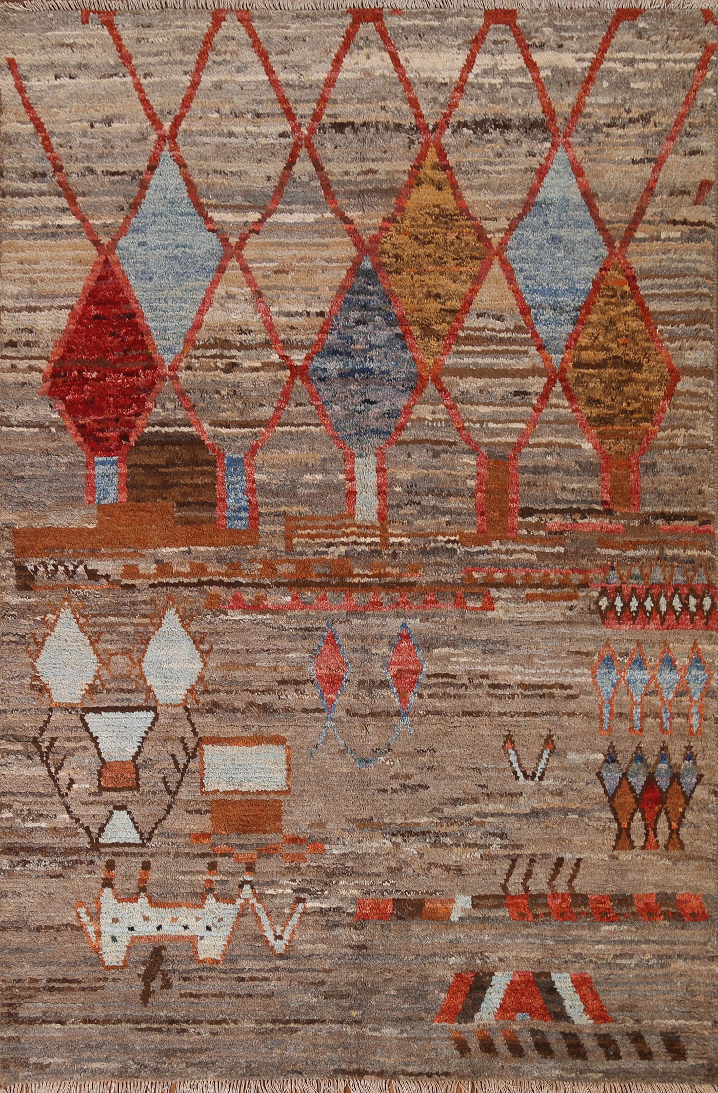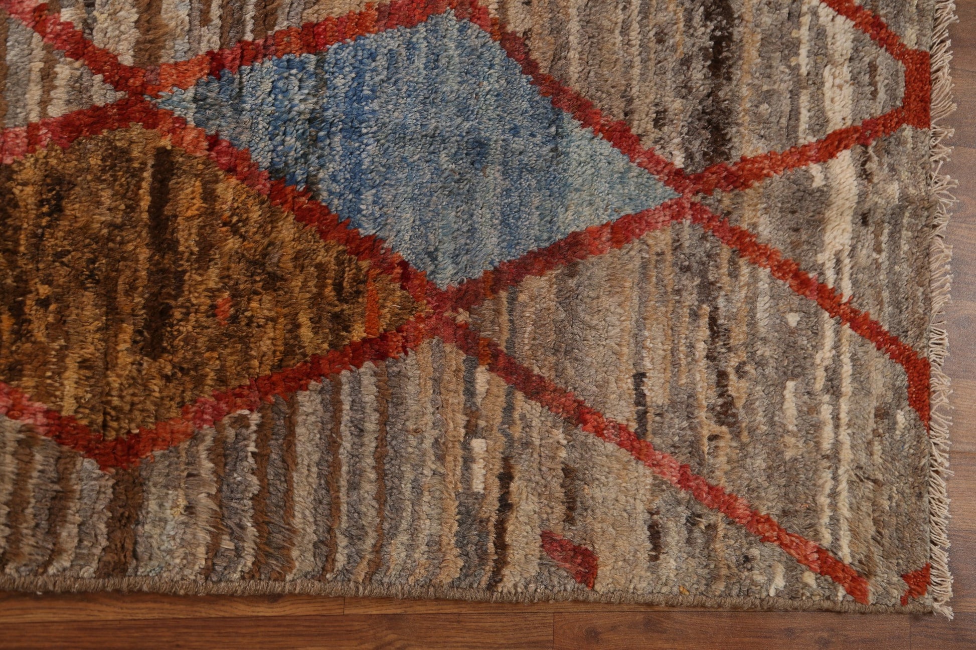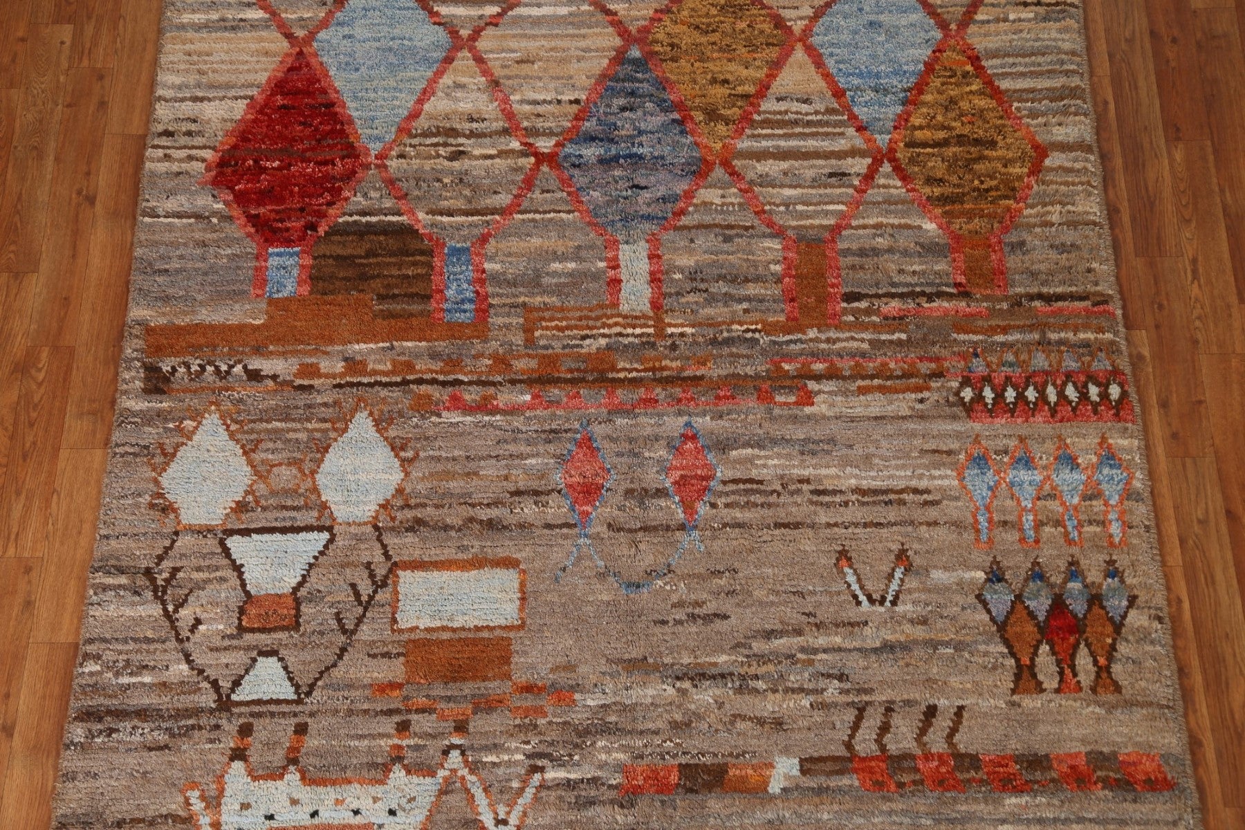 A Beautiful Genuine Pakistan Moroccan rug is Hand Knotted by skillful weavers in Pakistan with 100% Wool Material. This rug is in condition. dimensions are 7' 10'' X 5' 10'' in foot and 239 X 178 in centimeter. the primary color is Brown.