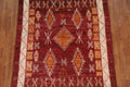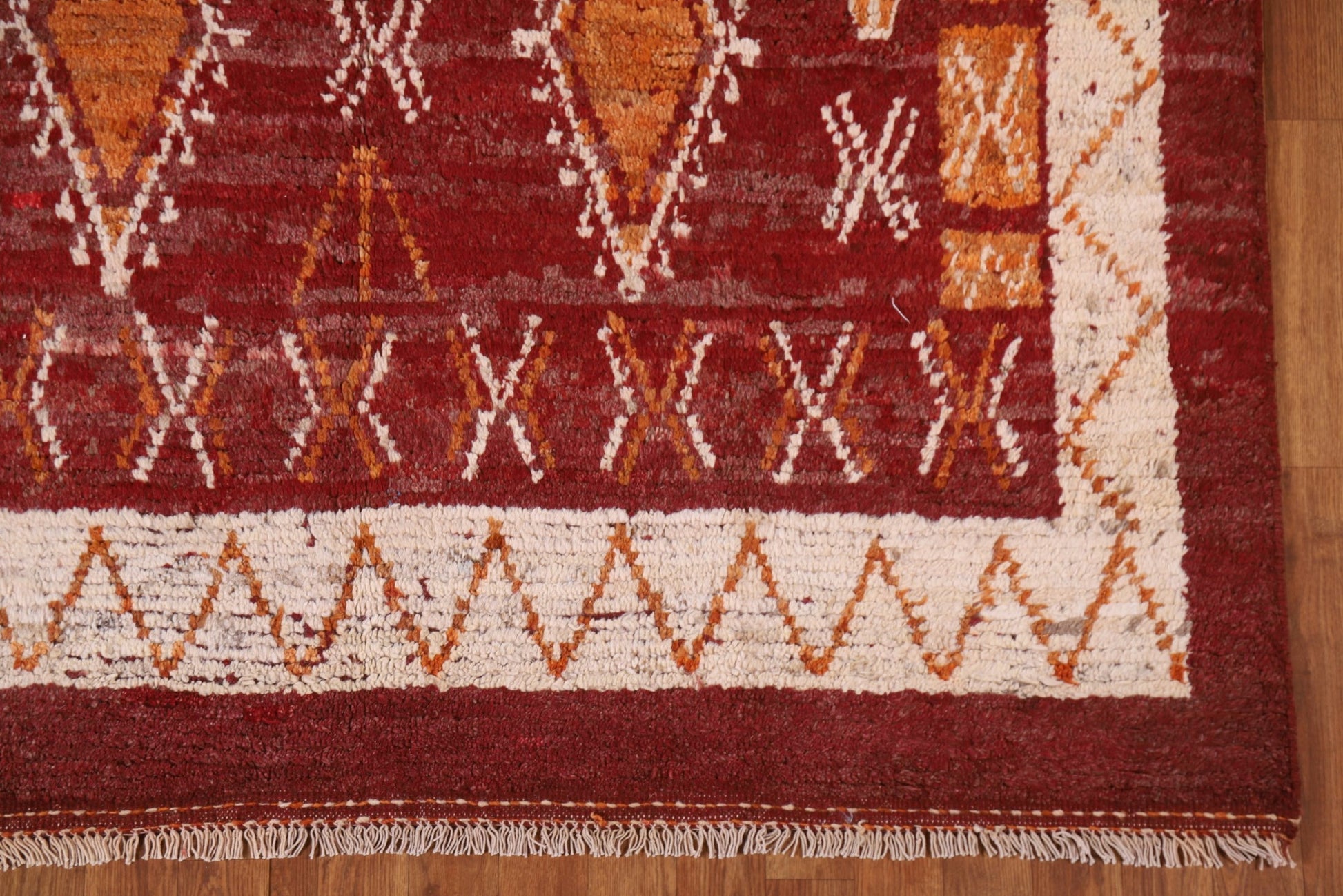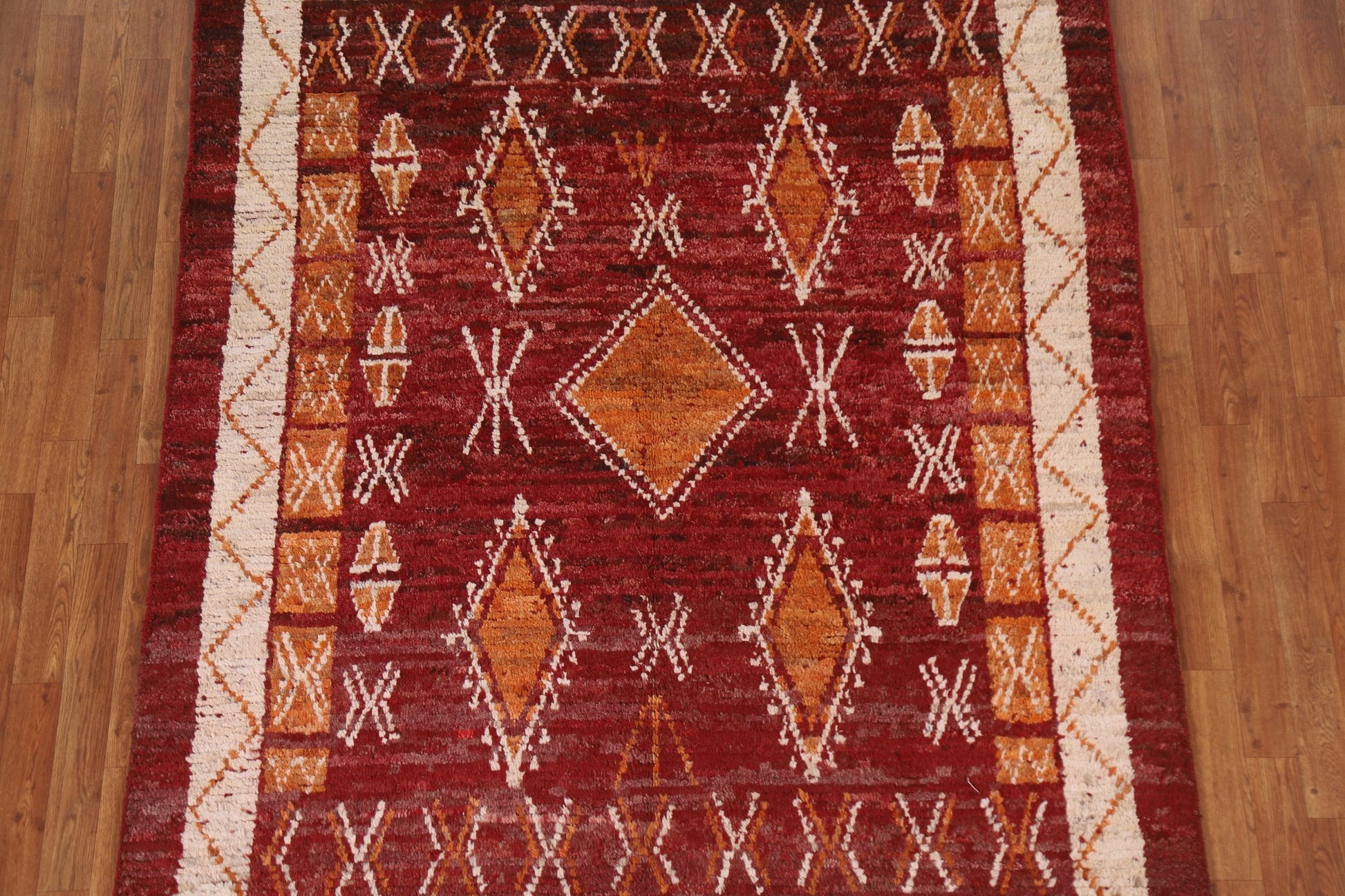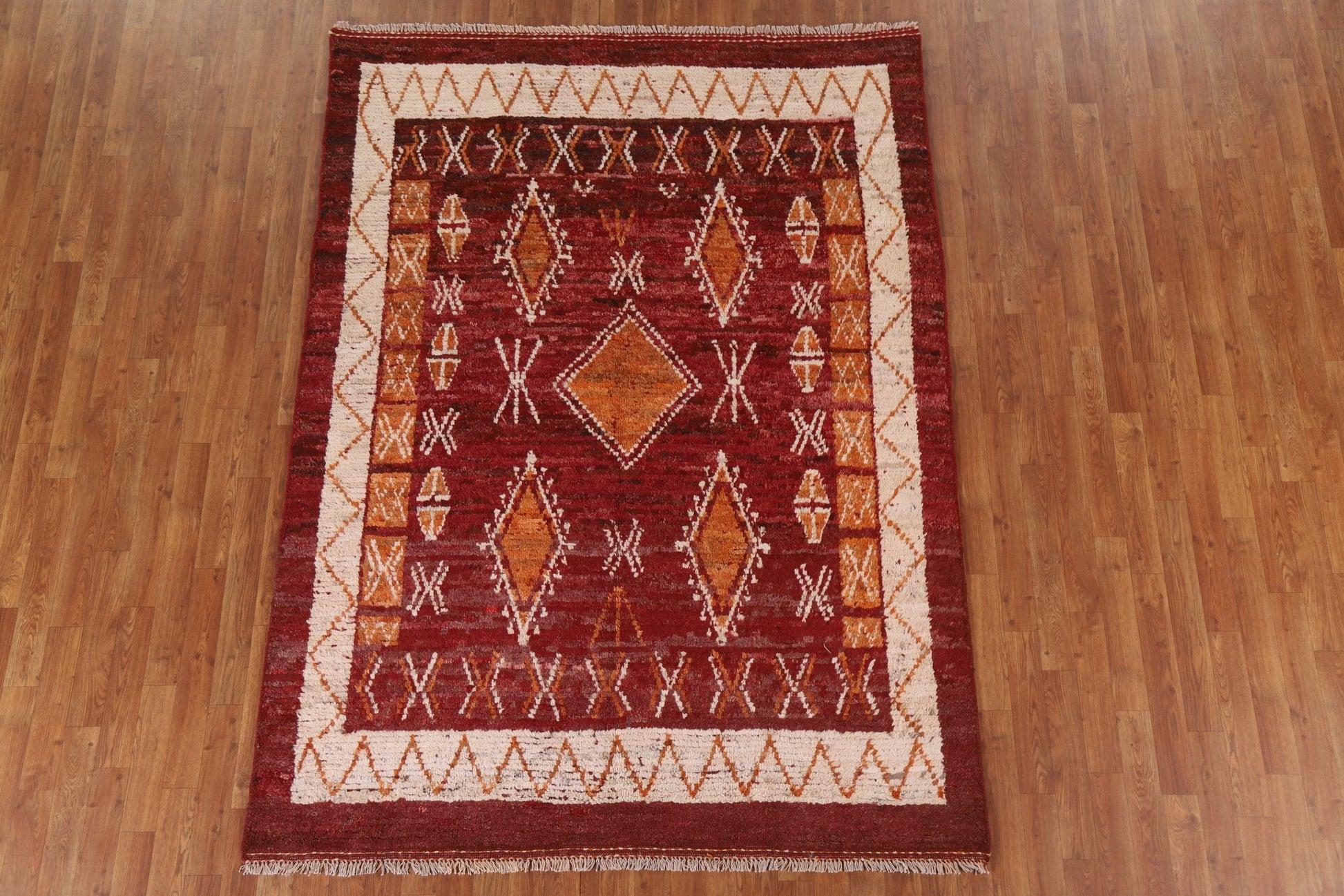 A Beautiful Genuine Pakistan Moroccan rug is Hand Knotted by skillful weavers in Pakistan with 100% Wool Material. This rug is in condition. dimensions are 7' 11'' X 5' 9'' in foot and 241 X 175 in centimeter. the primary color is Red.