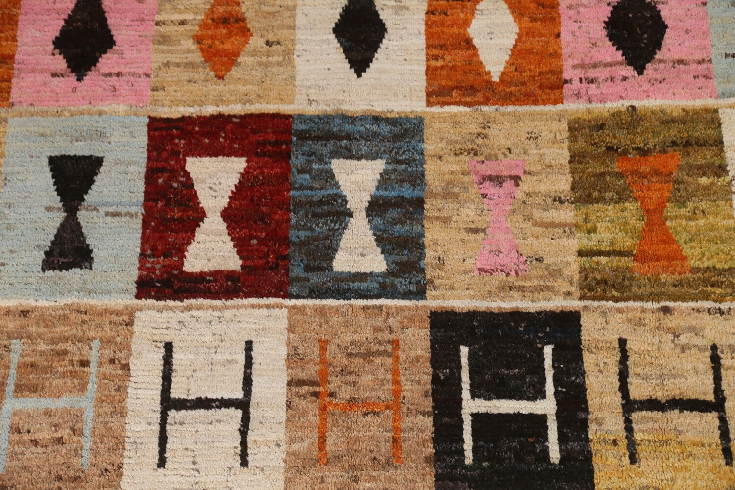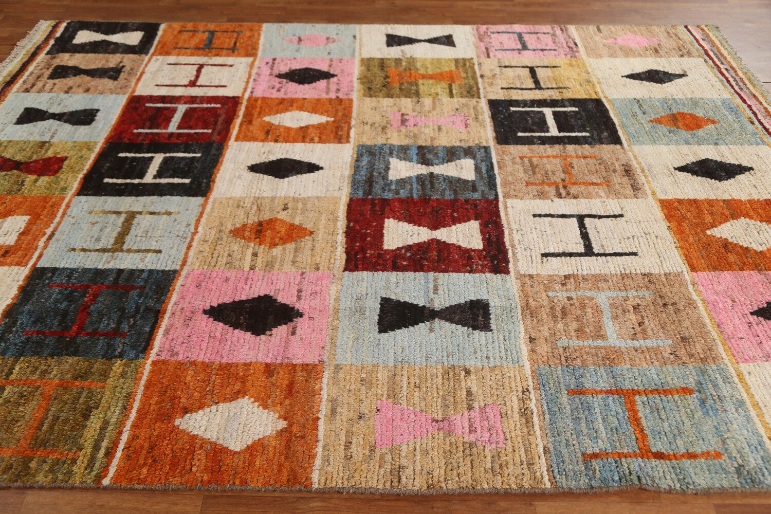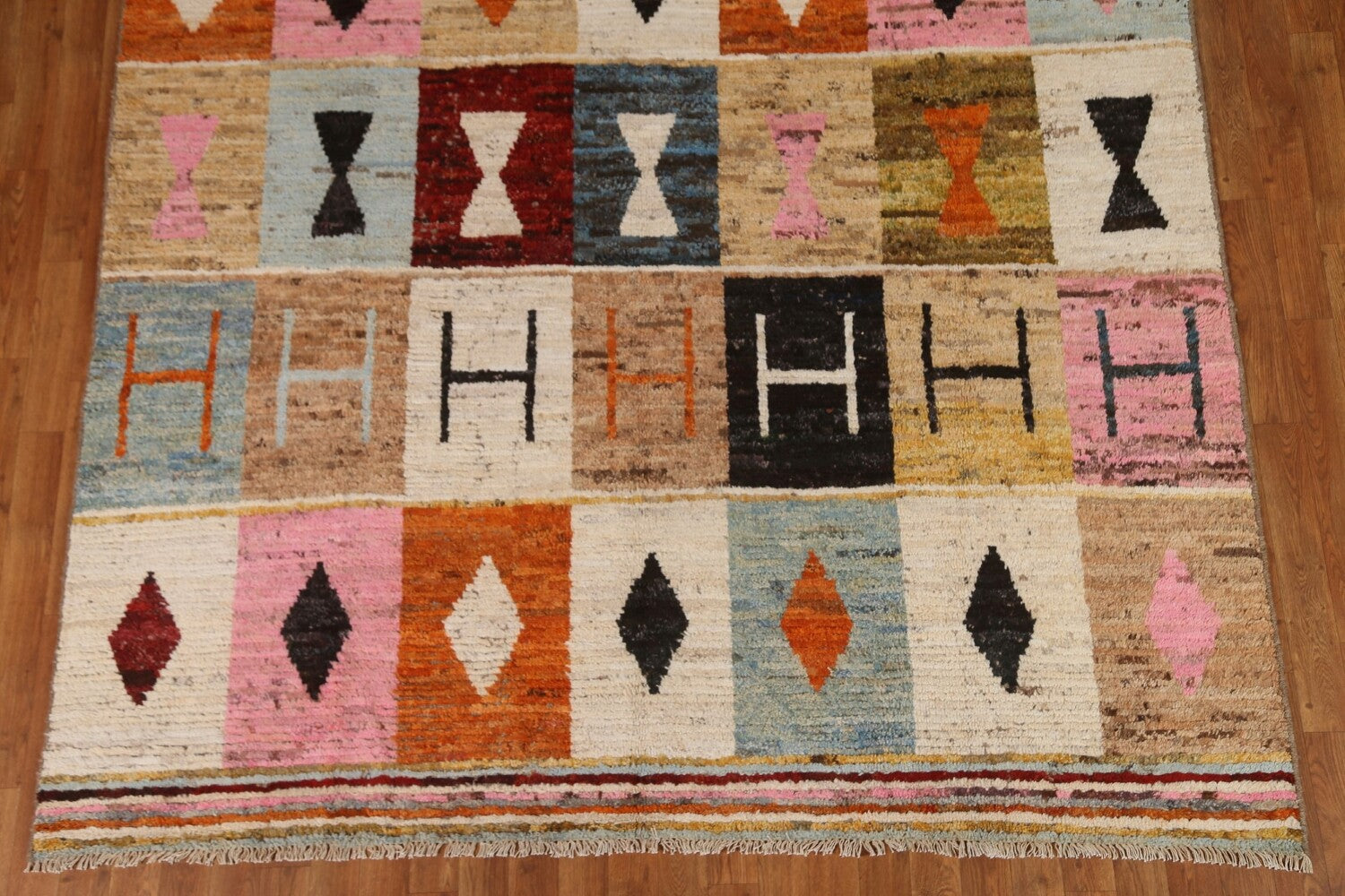 A Beautiful Genuine Pakistan Moroccan rug is Hand Knotted by skillful weavers in Pakistan with 100% Wool Material. This rug is in condition. dimensions are 9' 7'' X 7' 0'' in foot and 292 X 213 in centimeter. the primary color is Multi-Colored.