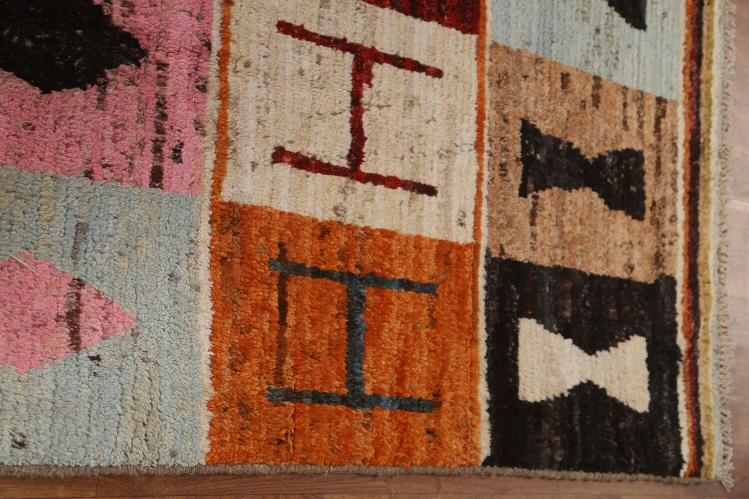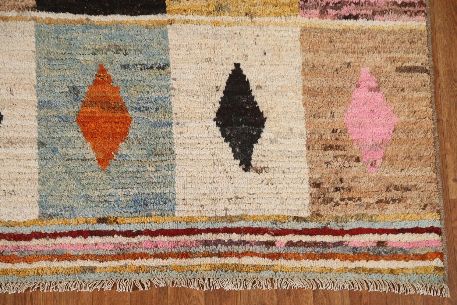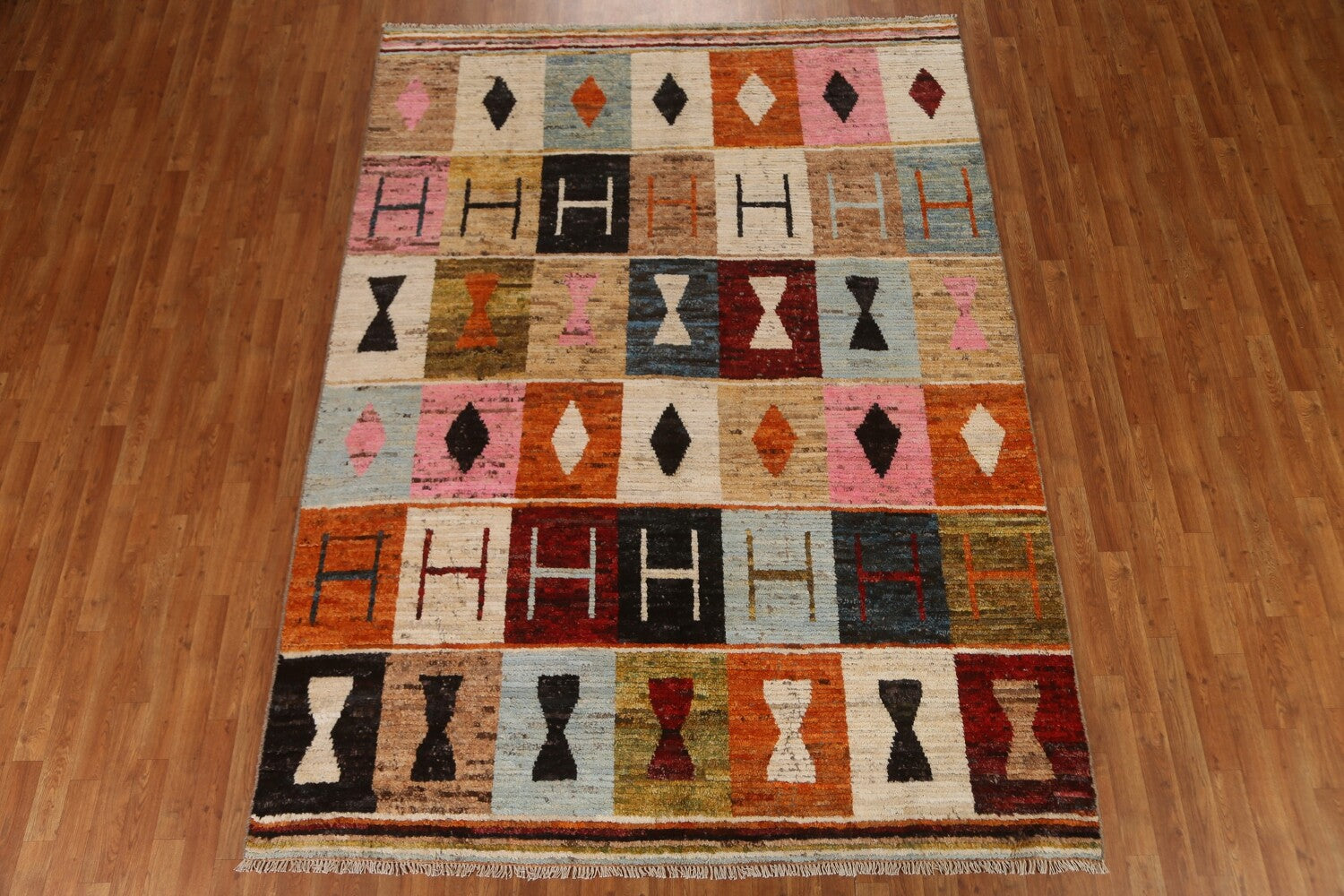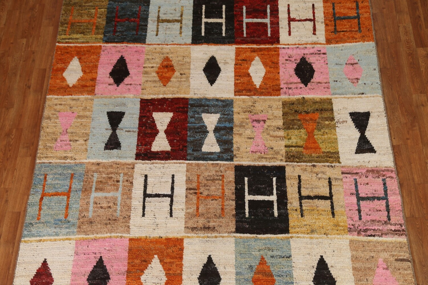 A Beautiful Genuine Pakistan Moroccan rug is Hand Knotted by skillful weavers in Pakistan with 100% Wool Material. This rug is in condition. dimensions are 9' 7'' X 7' 0'' in foot and 292 X 213 in centimeter. the primary color is Multi-Colored.