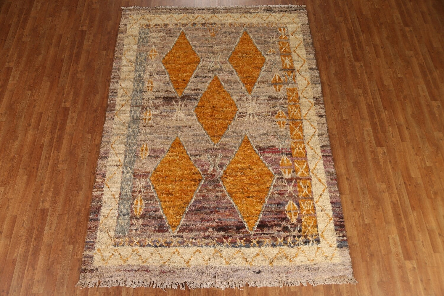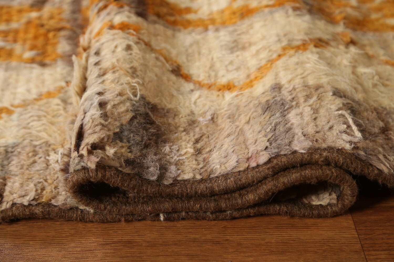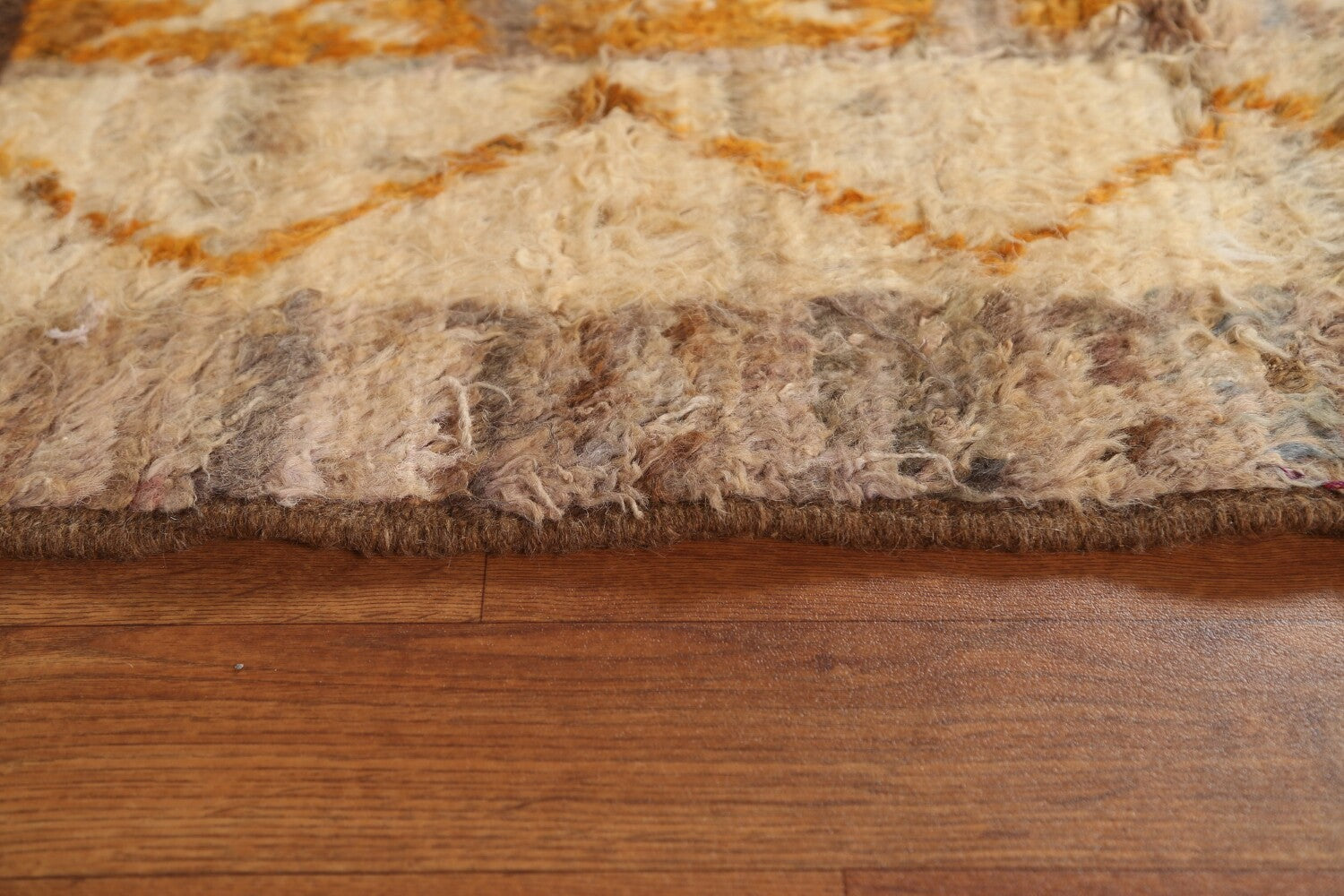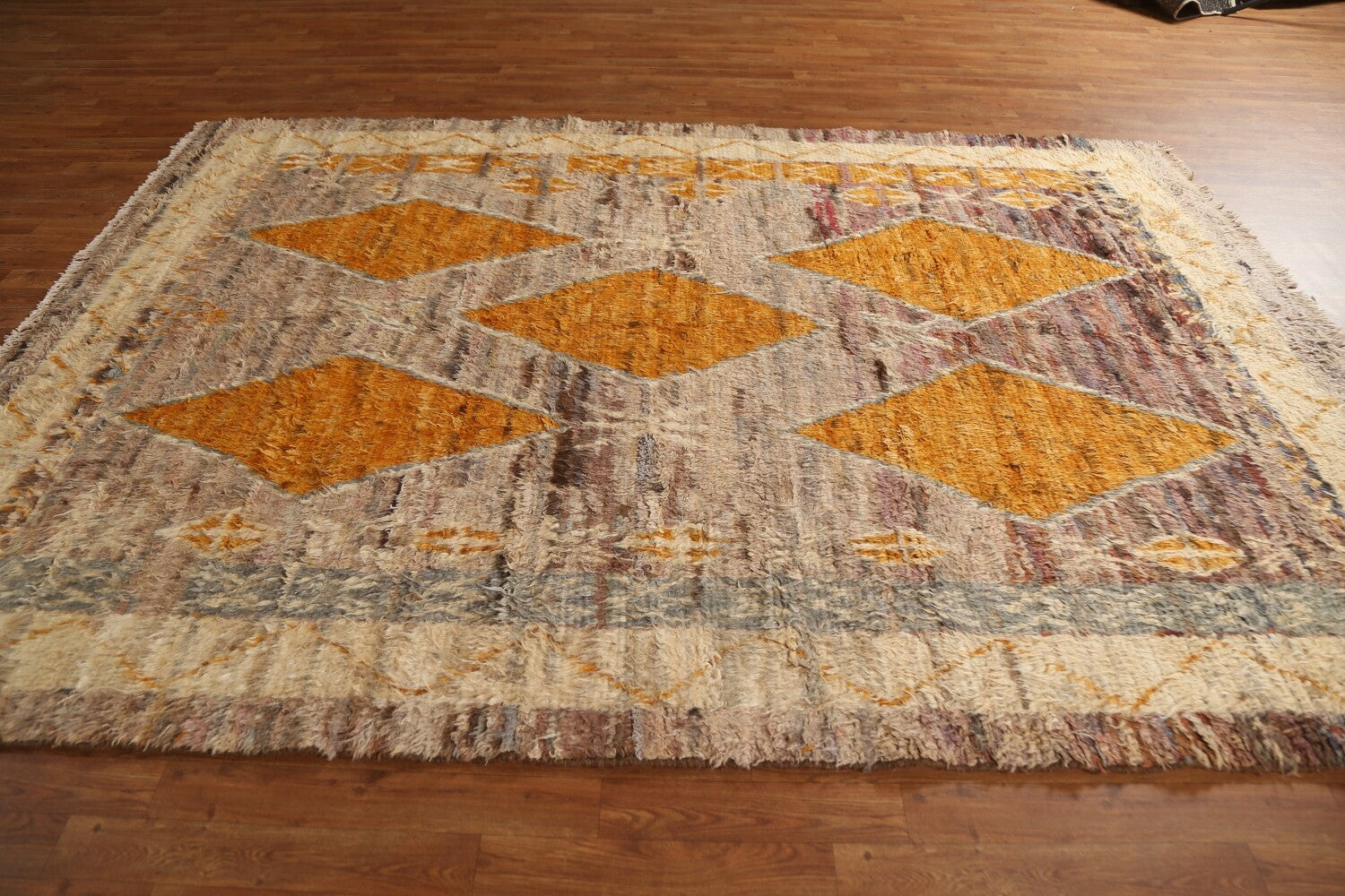 A Beautiful Genuine Pakistan Moroccan rug is Hand Knotted by skillful weavers in Pakistan with 100% Wool Material. This rug is in condition. dimensions are 9' 6'' X 6' 9'' in foot and 290 X 206 in centimeter. the primary color is Beige & Ivories.