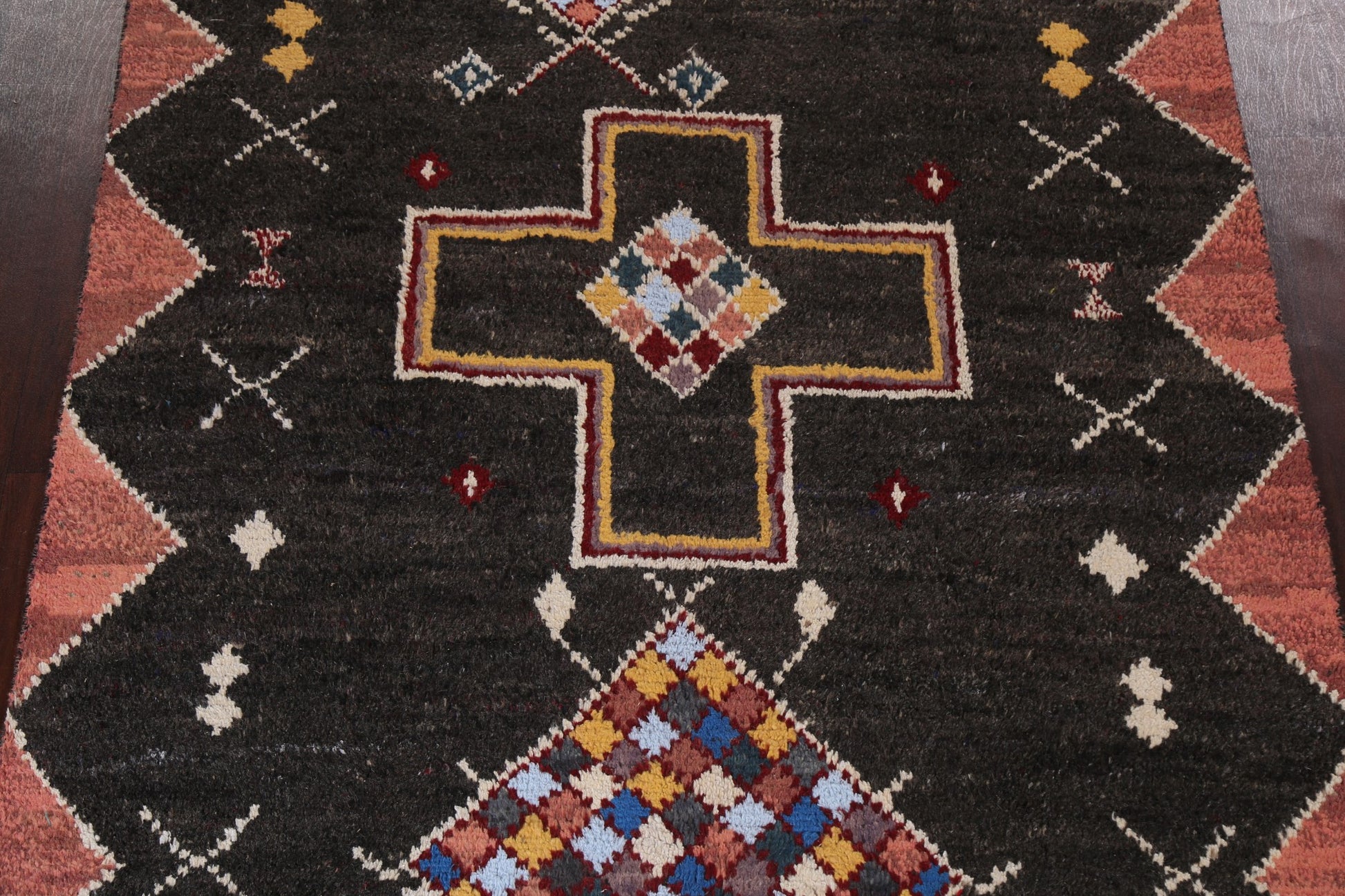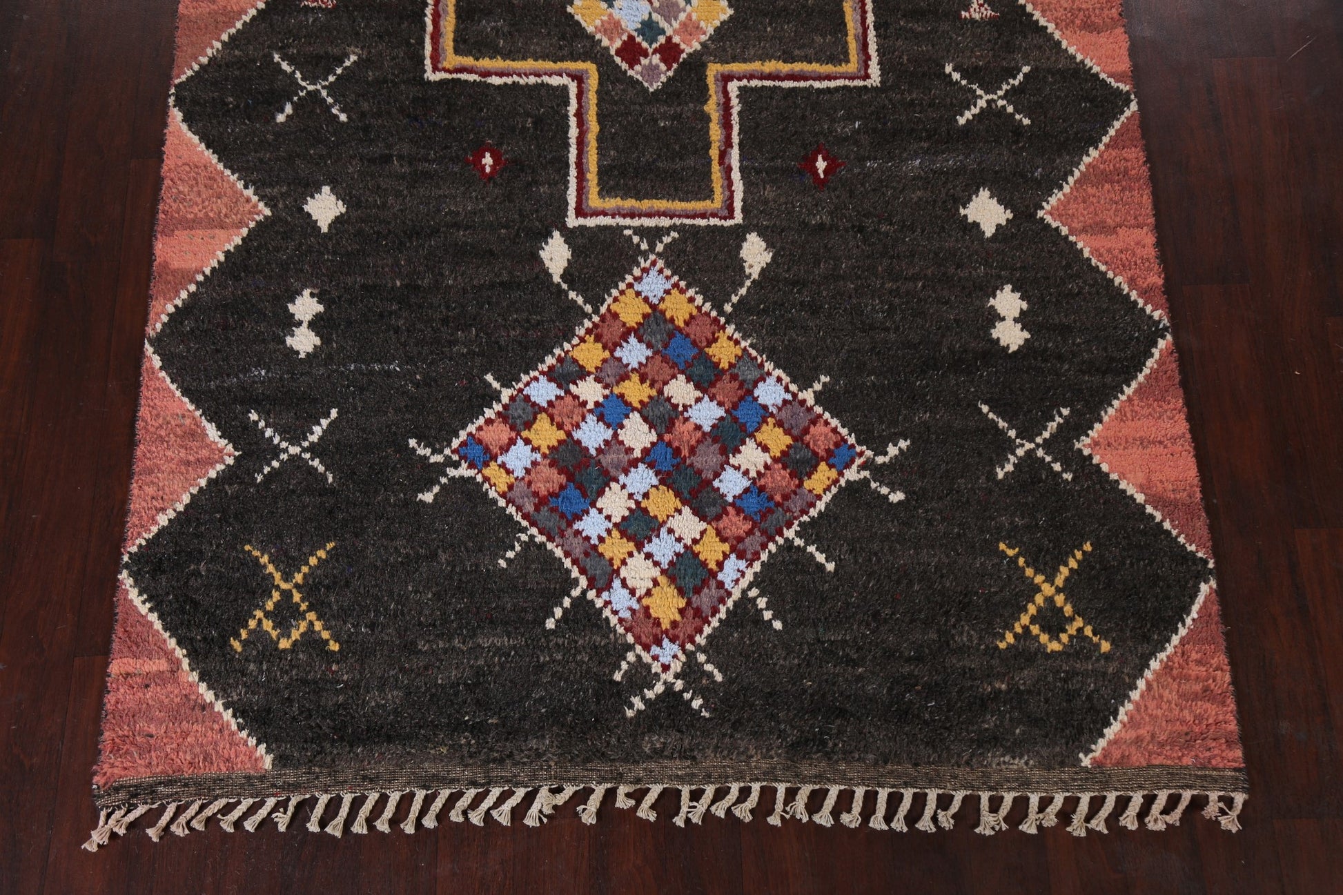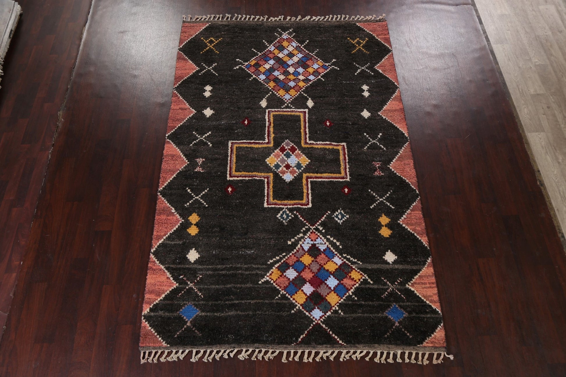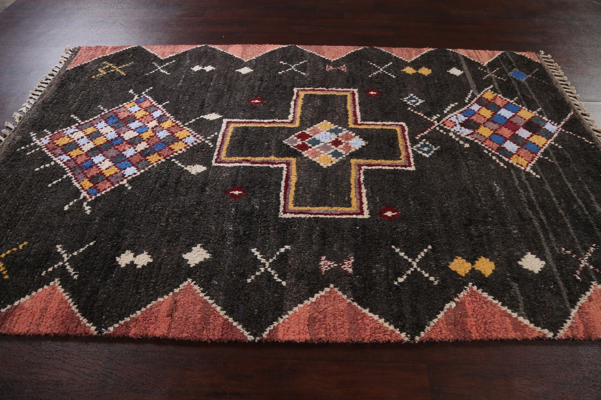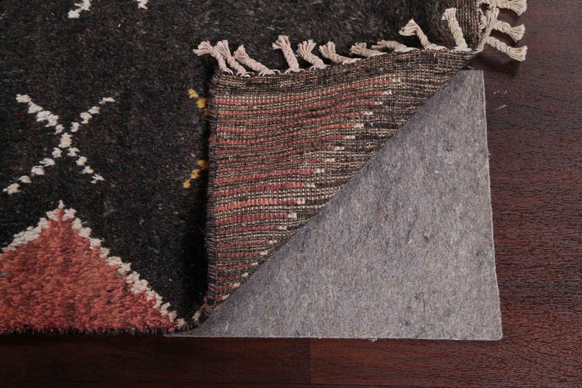 A Beautiful Genuine Morocco Moroccan rug is Hand Knotted by skillful weavers in Morocco with 100% Wool Material. This rug is in New, First Quality condition. dimensions are 9' 9'' X 6' 3'' in foot and 297 X 191 in centimeter. the primary color is Black.