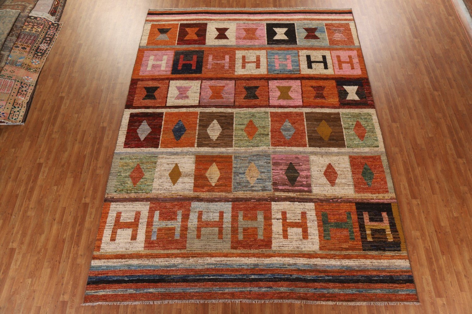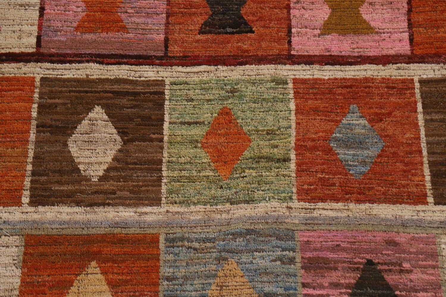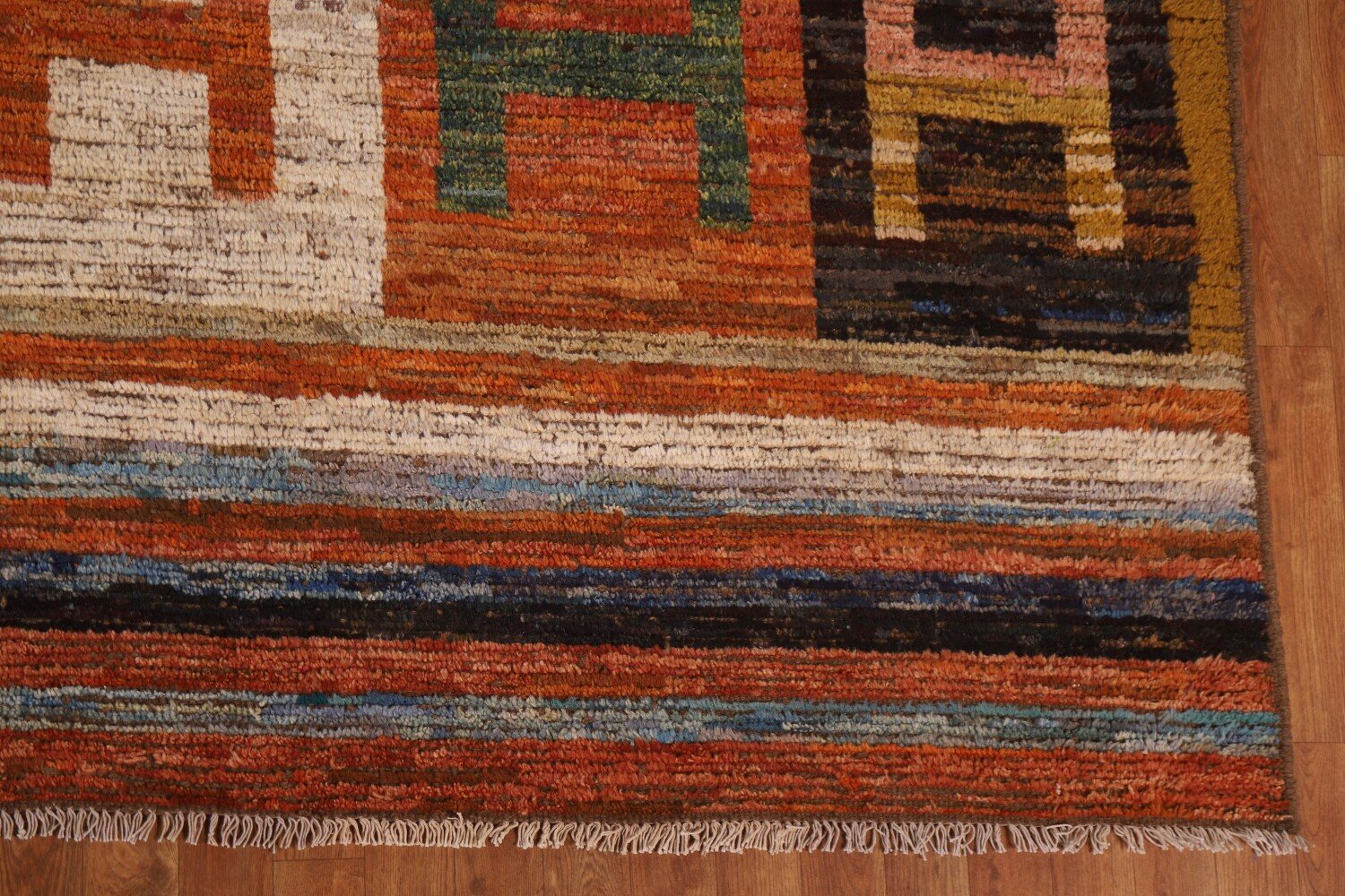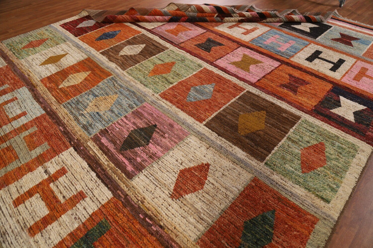 A Beautiful Genuine Pakistan Moroccan rug is Hand Knotted by skillful weavers in Pakistan with 100% Wool Material. This rug is in condition. dimensions are 13' 7'' X 10' 5'' in foot and 414 X 318 in centimeter. the primary color is Multi-Colored.