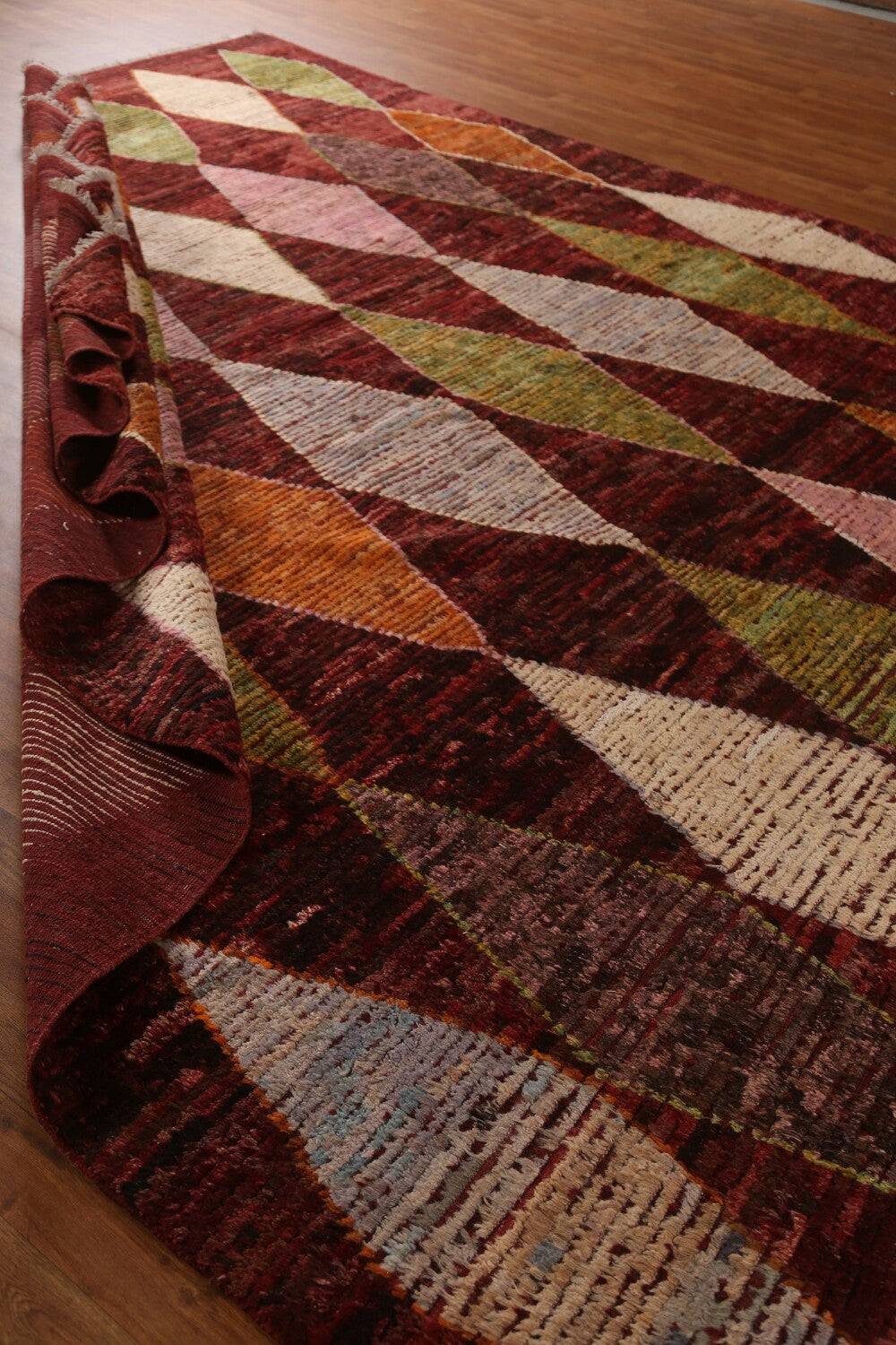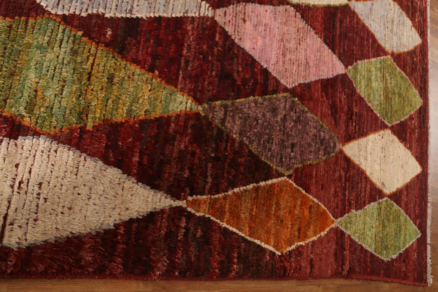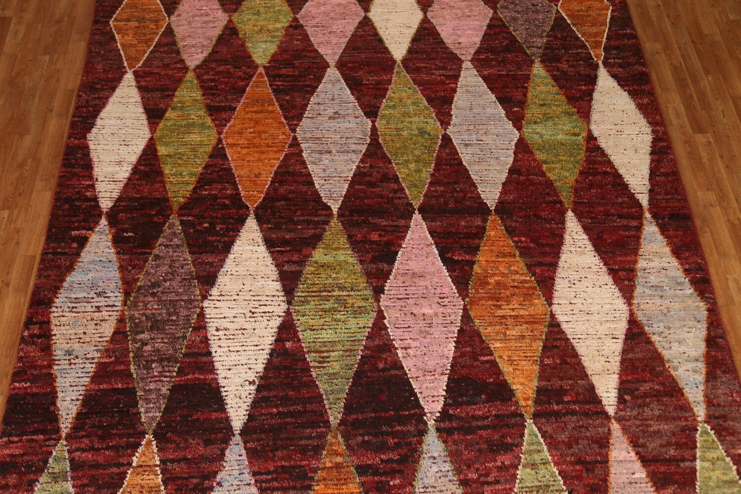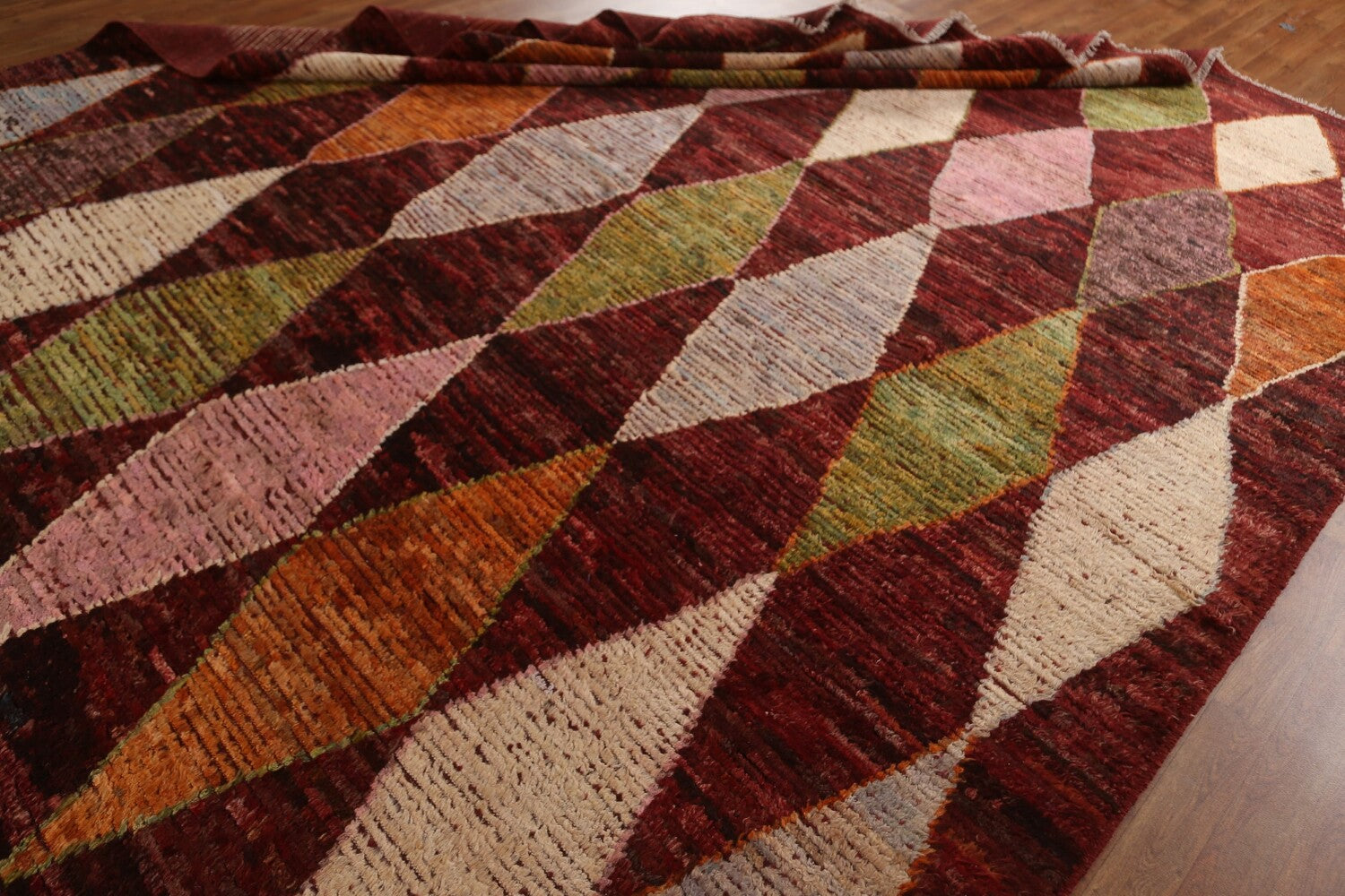 A Beautiful Genuine Pakistan Moroccan rug is Hand Knotted by skillful weavers in Pakistan with 100% Wool Material. This rug is in condition. dimensions are 13' 0'' X 9' 7'' in foot and 396 X 292 in centimeter. the primary color is Red.