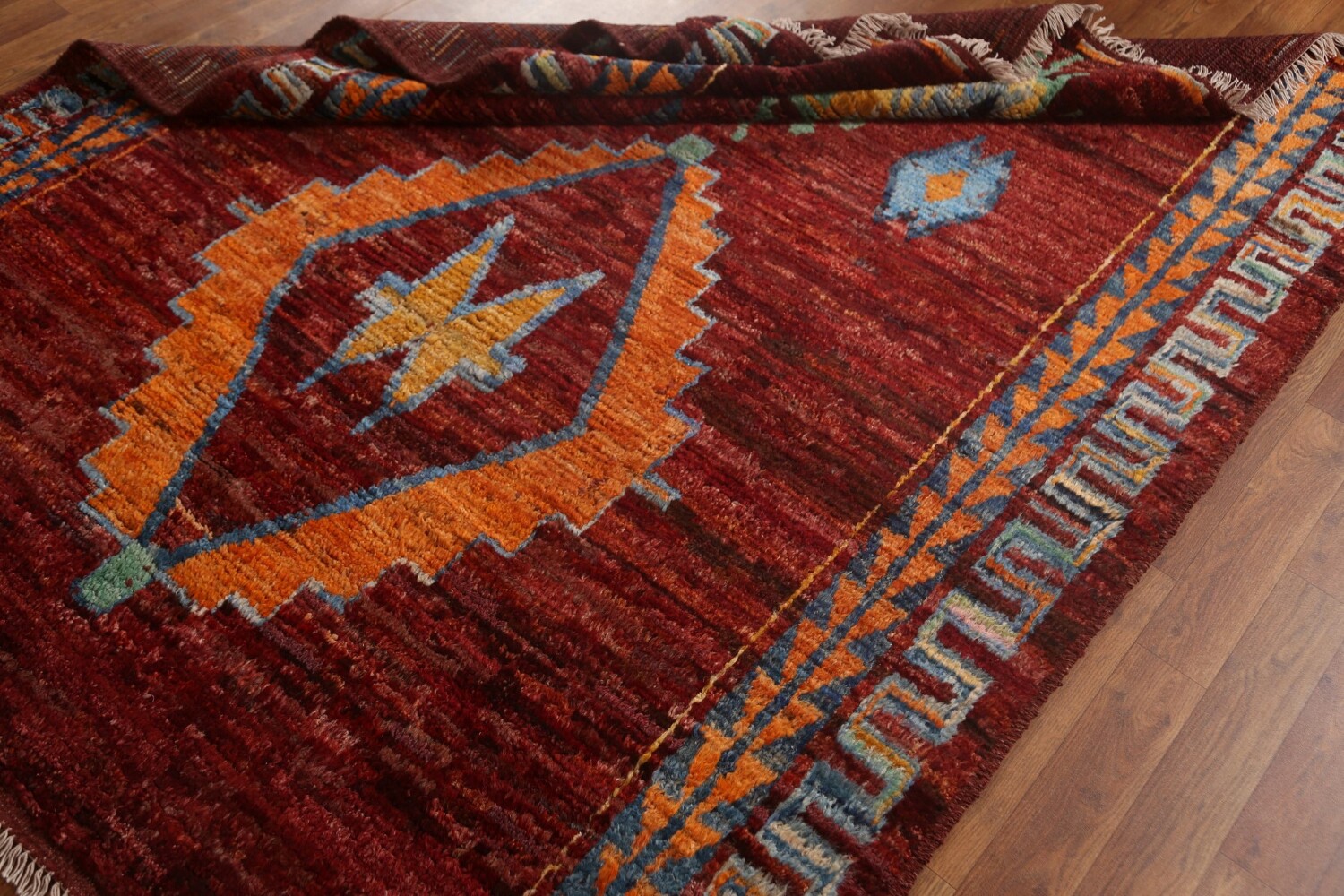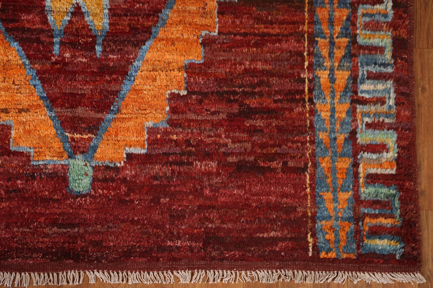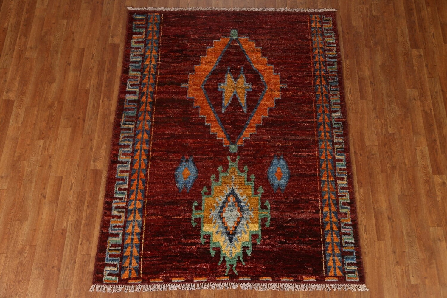 A Beautiful Genuine Pakistan Moroccan rug is Hand Knotted by skillful weavers in Pakistan with 100% Wool Material. This rug is in condition. dimensions are 6' 8'' X 5' 3'' in foot and 203 X 160 in centimeter. the primary color is Red.