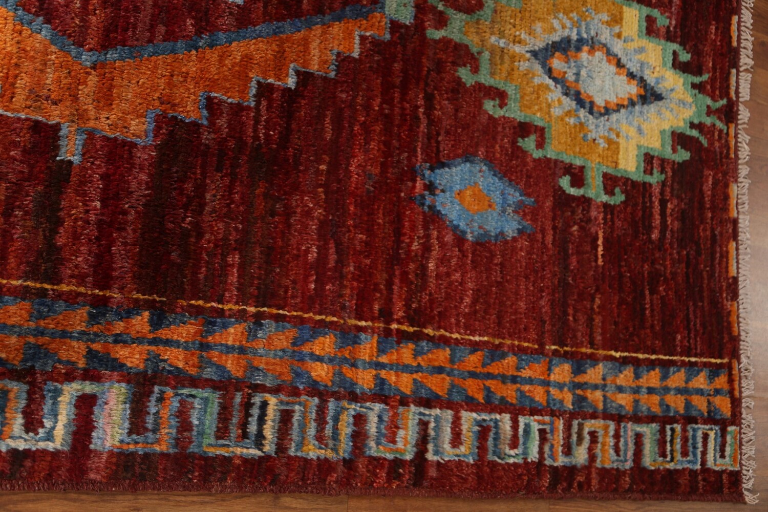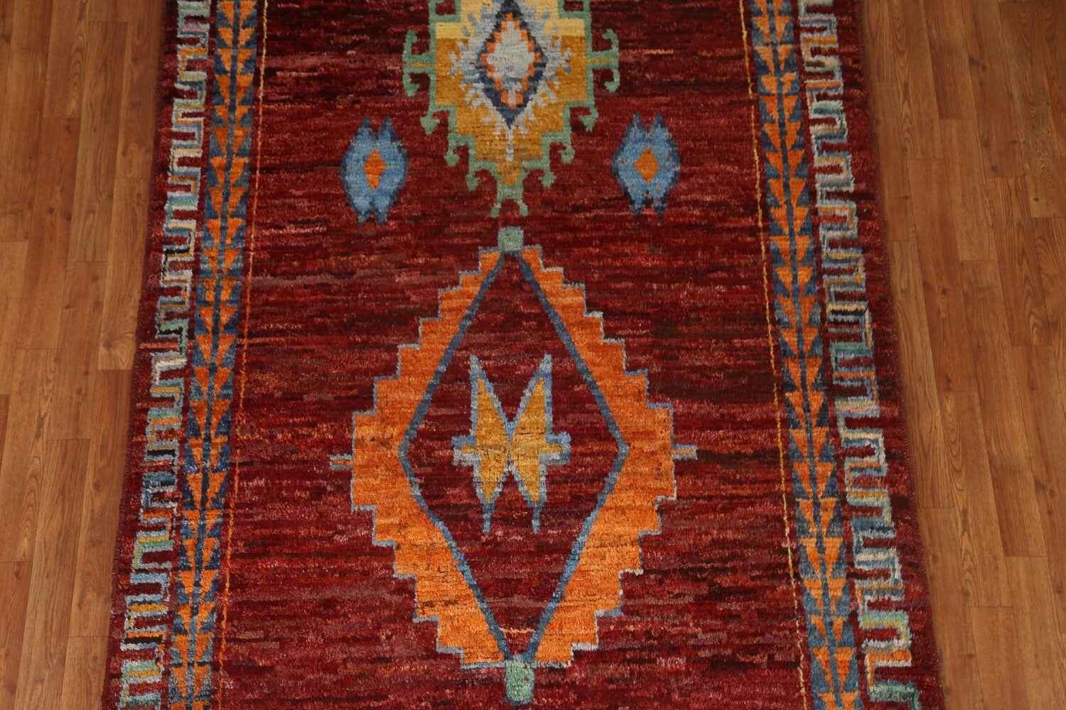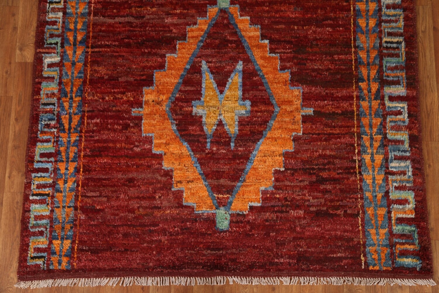 A Beautiful Genuine Pakistan Moroccan rug is Hand Knotted by skillful weavers in Pakistan with 100% Wool Material. This rug is in condition. dimensions are 6' 8'' X 5' 3'' in foot and 203 X 160 in centimeter. the primary color is Red.