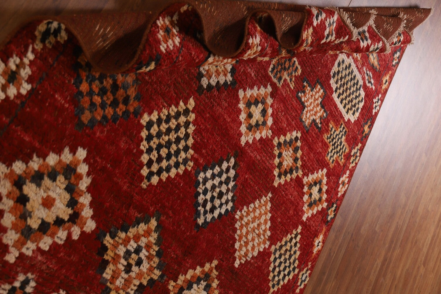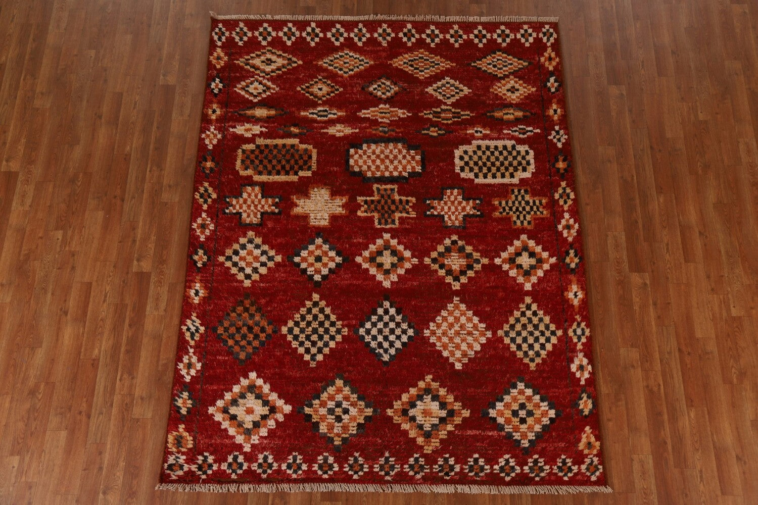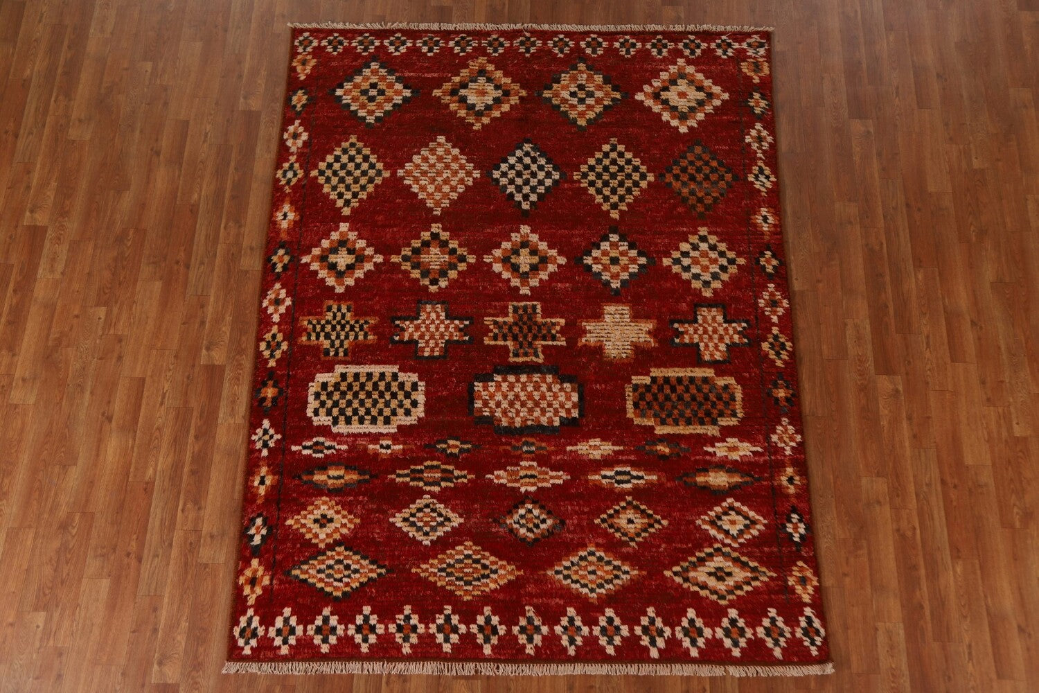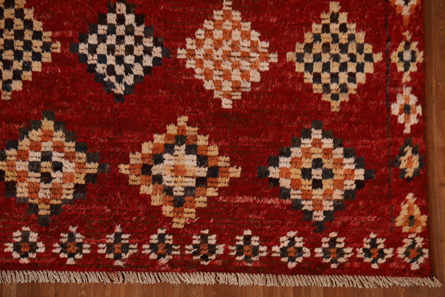 A Beautiful Genuine Pakistan Moroccan rug is Hand Knotted by skillful weavers in Pakistan with 100% Wool Material. This rug is in condition. dimensions are 7' 6'' X 5' 11'' in foot and 229 X 180 in centimeter. the primary color is Red.