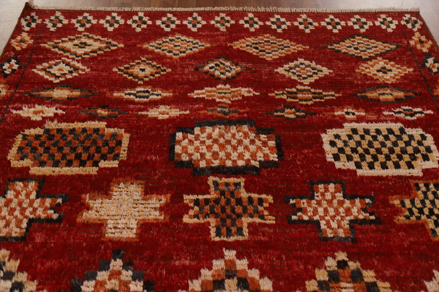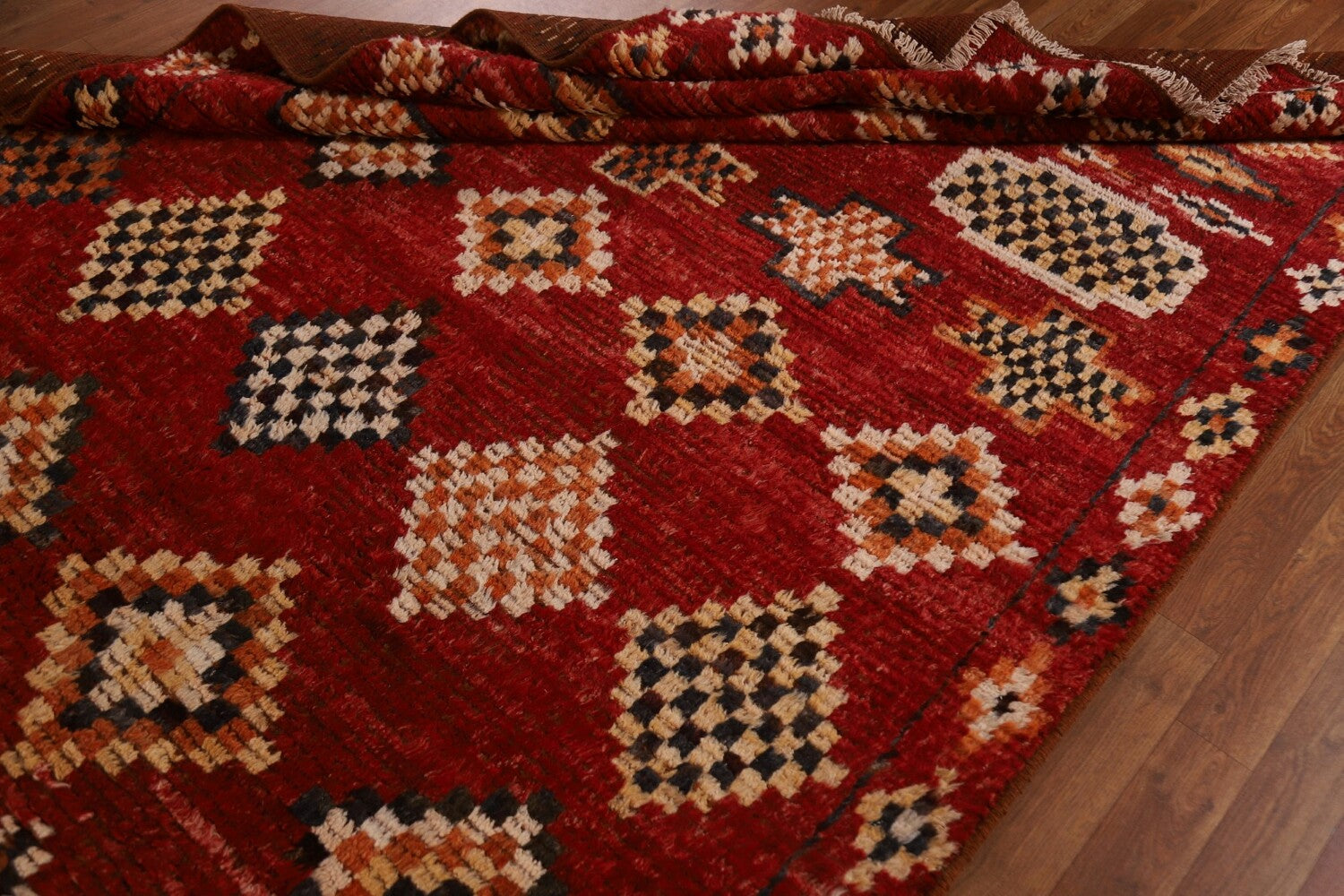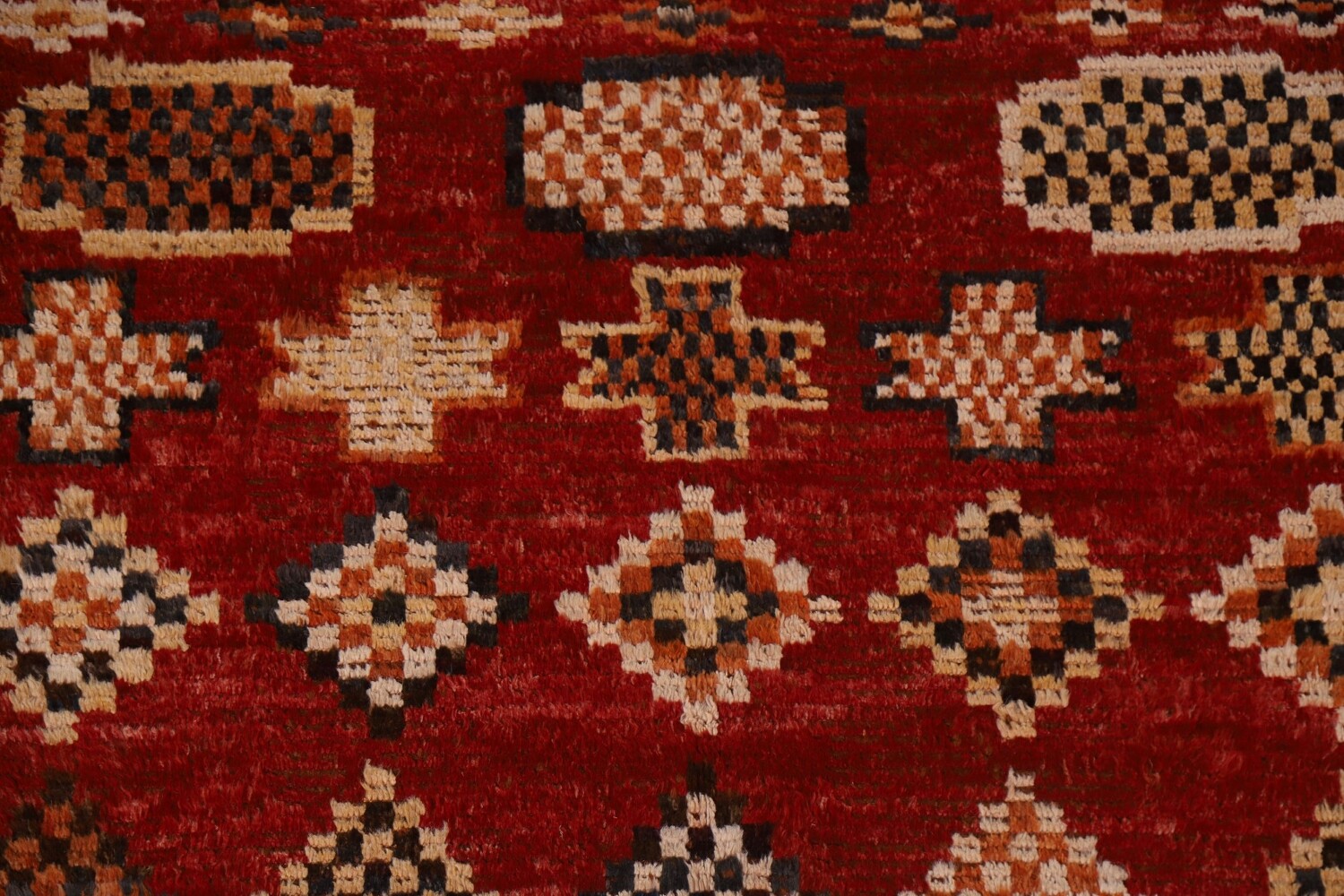 A Beautiful Genuine Pakistan Moroccan rug is Hand Knotted by skillful weavers in Pakistan with 100% Wool Material. This rug is in condition. dimensions are 7' 6'' X 5' 11'' in foot and 229 X 180 in centimeter. the primary color is Red.