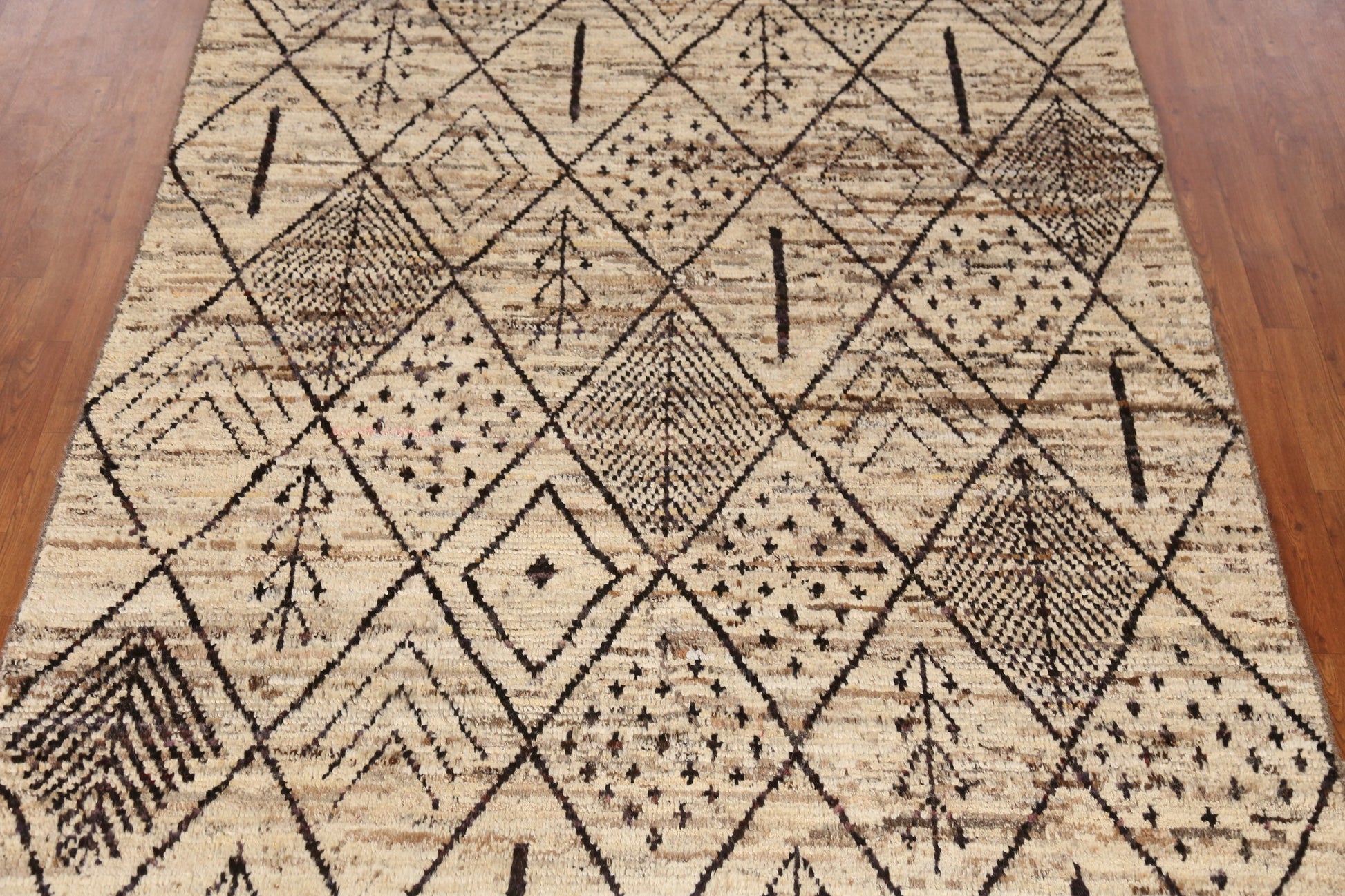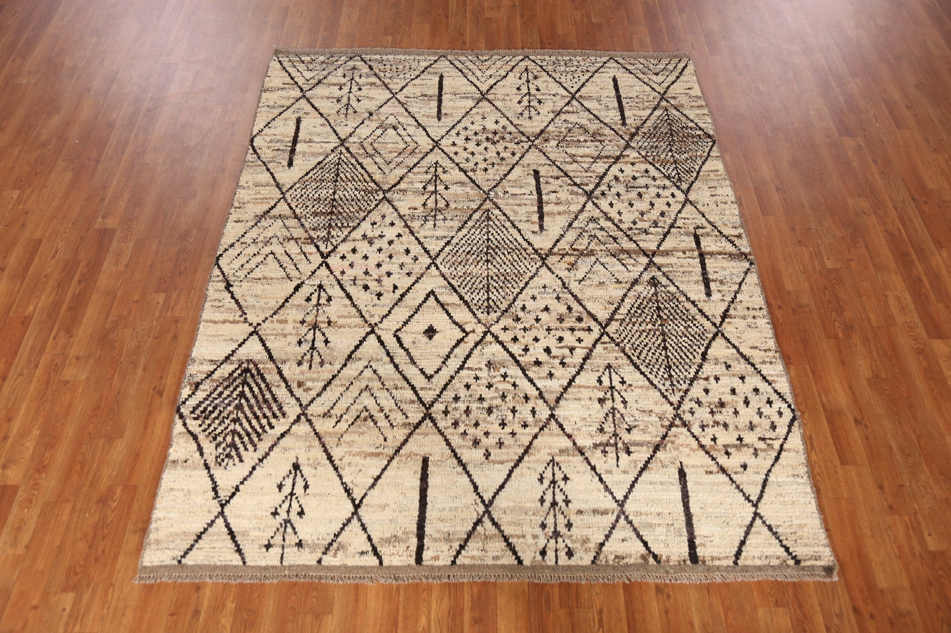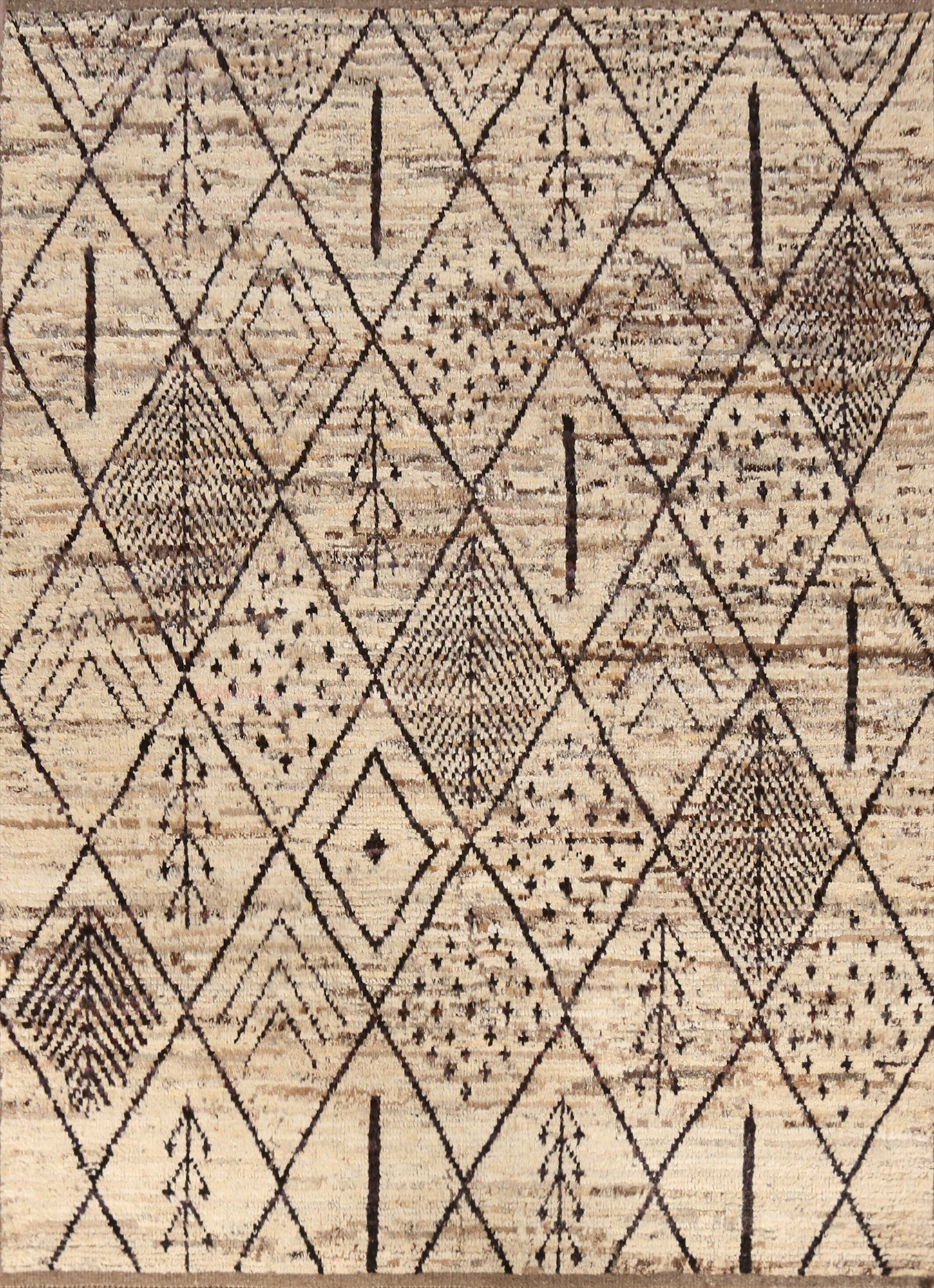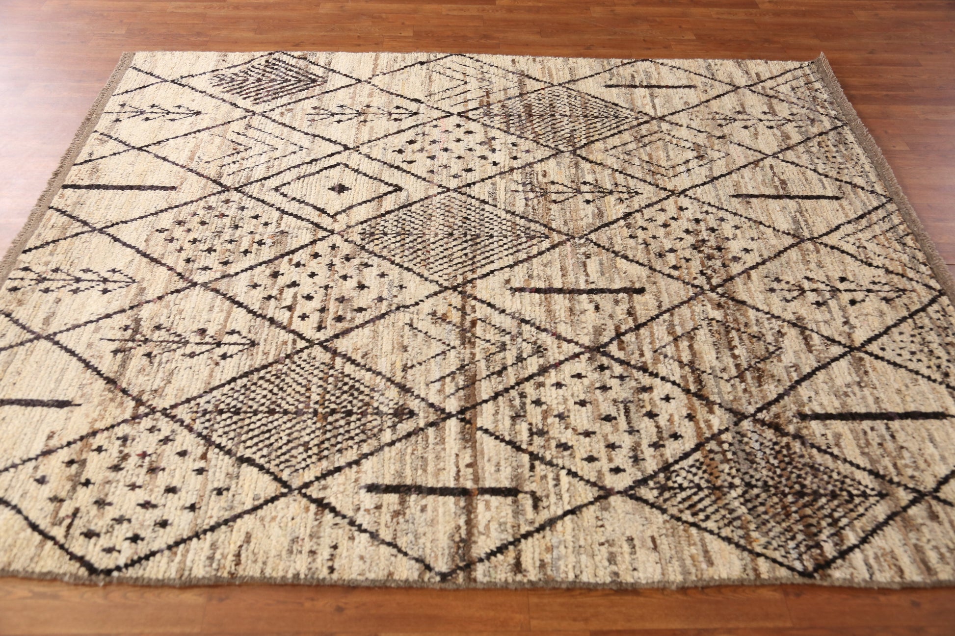 A Beautiful Genuine Pakistan Moroccan rug is Hand Knotted by skillful weavers in Pakistan with 100% Wool Material. This rug is in New, First Quality condition. dimensions are 7' 7'' X 6' 1'' in foot and 231 X 185 in centimeter. the primary color is Beige & Ivories.