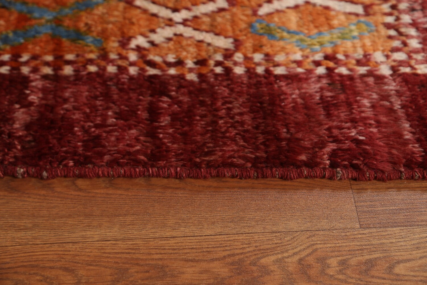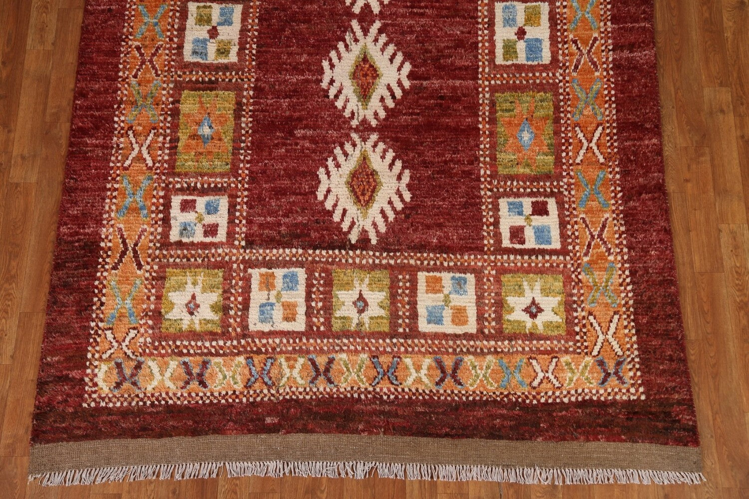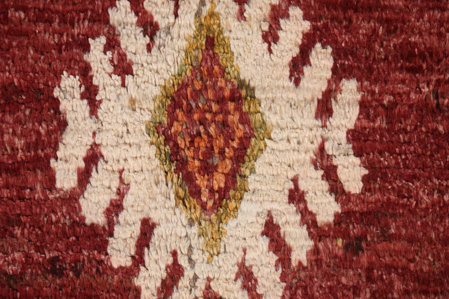 A Beautiful Genuine Pakistan Moroccan rug is Hand Knotted by skillful weavers in Pakistan with 100% Wool Material. This rug is in condition. dimensions are 8' 8'' X 5' 10'' in foot and 264 X 178 in centimeter. the primary color is Red.