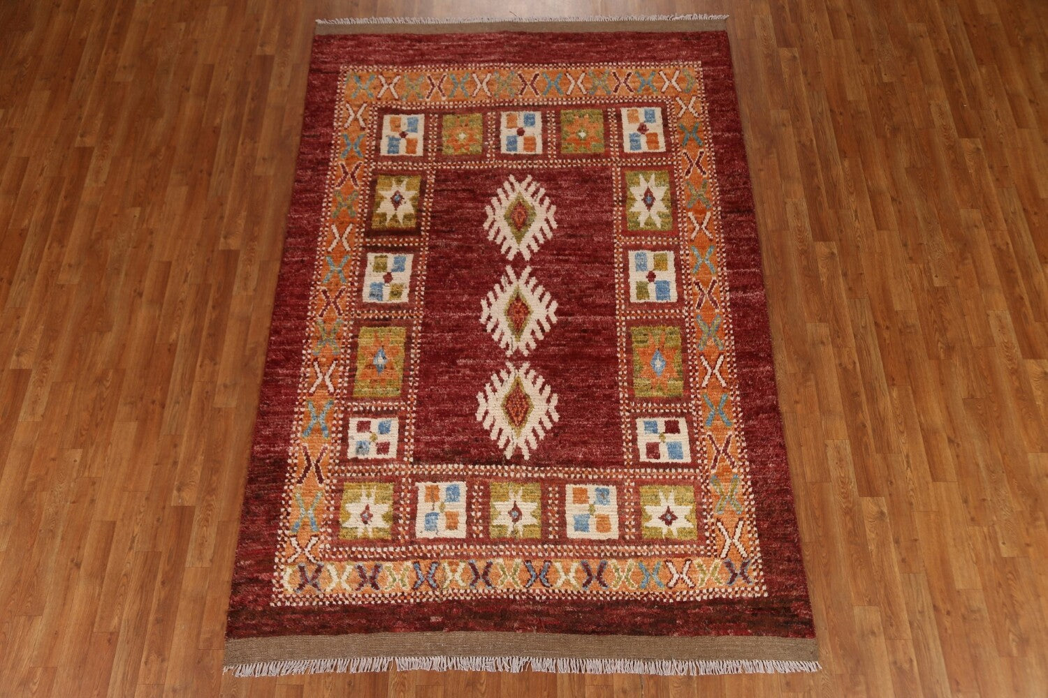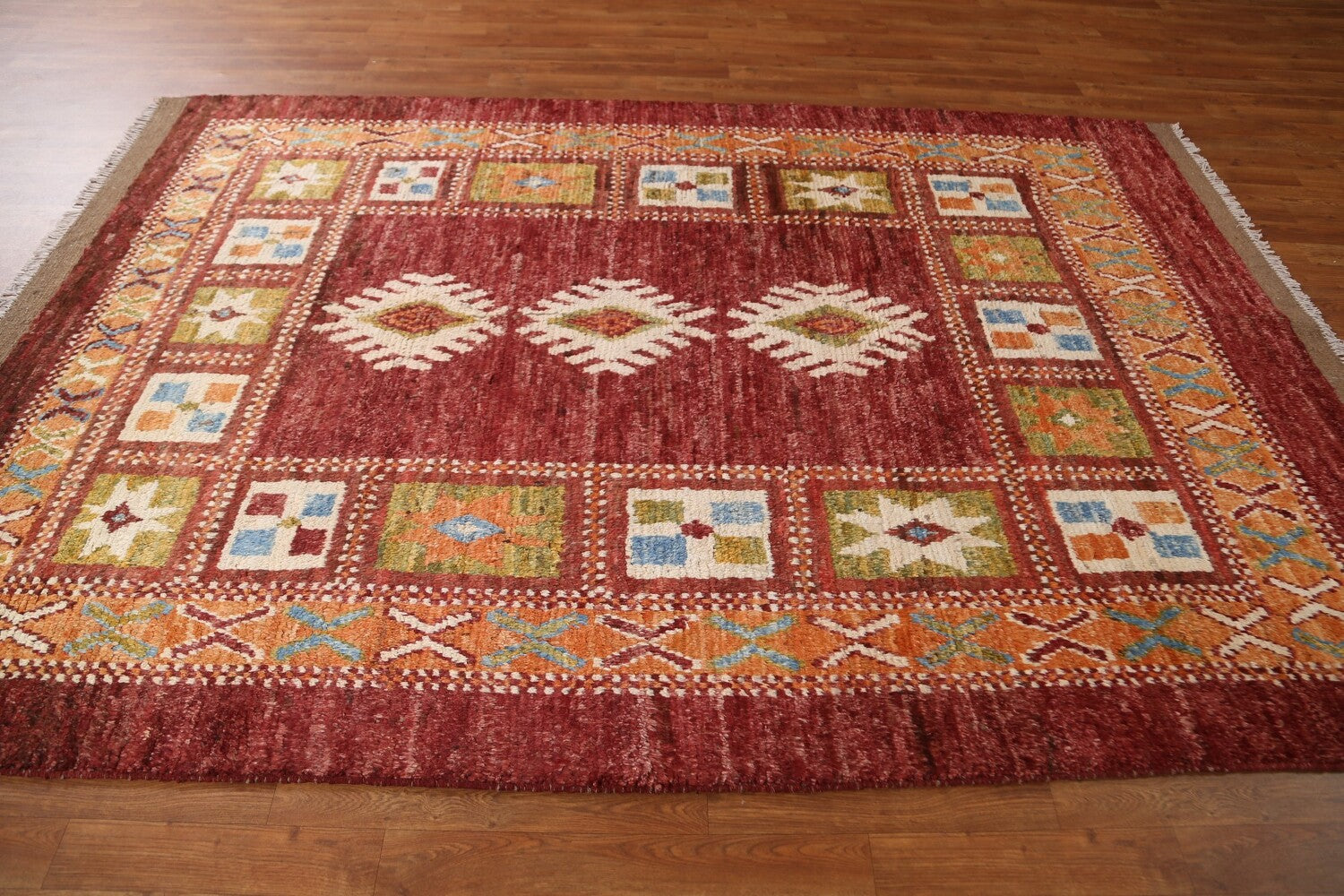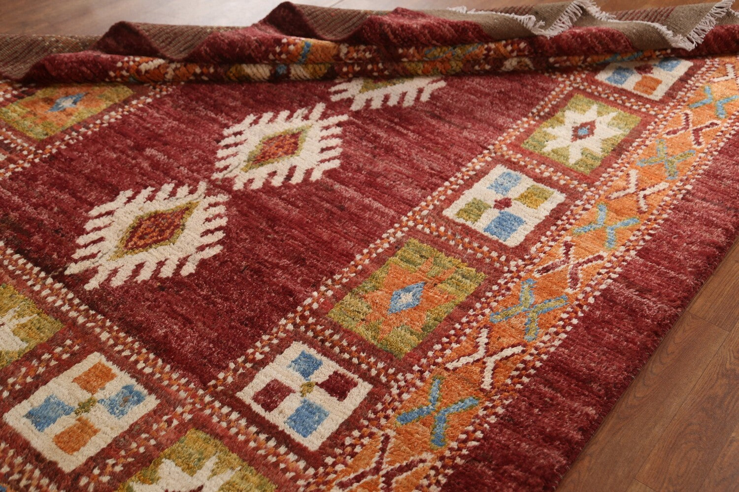 A Beautiful Genuine Pakistan Moroccan rug is Hand Knotted by skillful weavers in Pakistan with 100% Wool Material. This rug is in condition. dimensions are 8' 8'' X 5' 10'' in foot and 264 X 178 in centimeter. the primary color is Red.