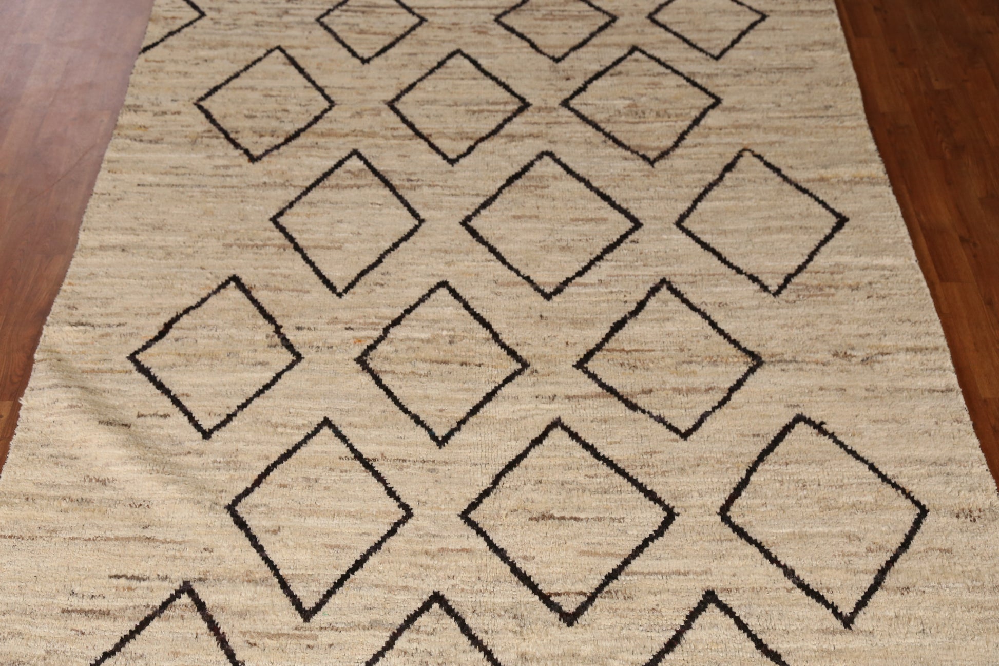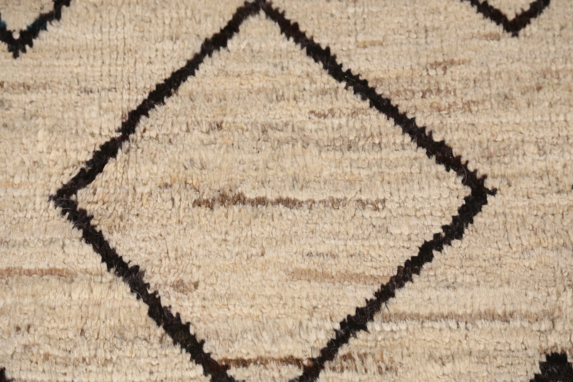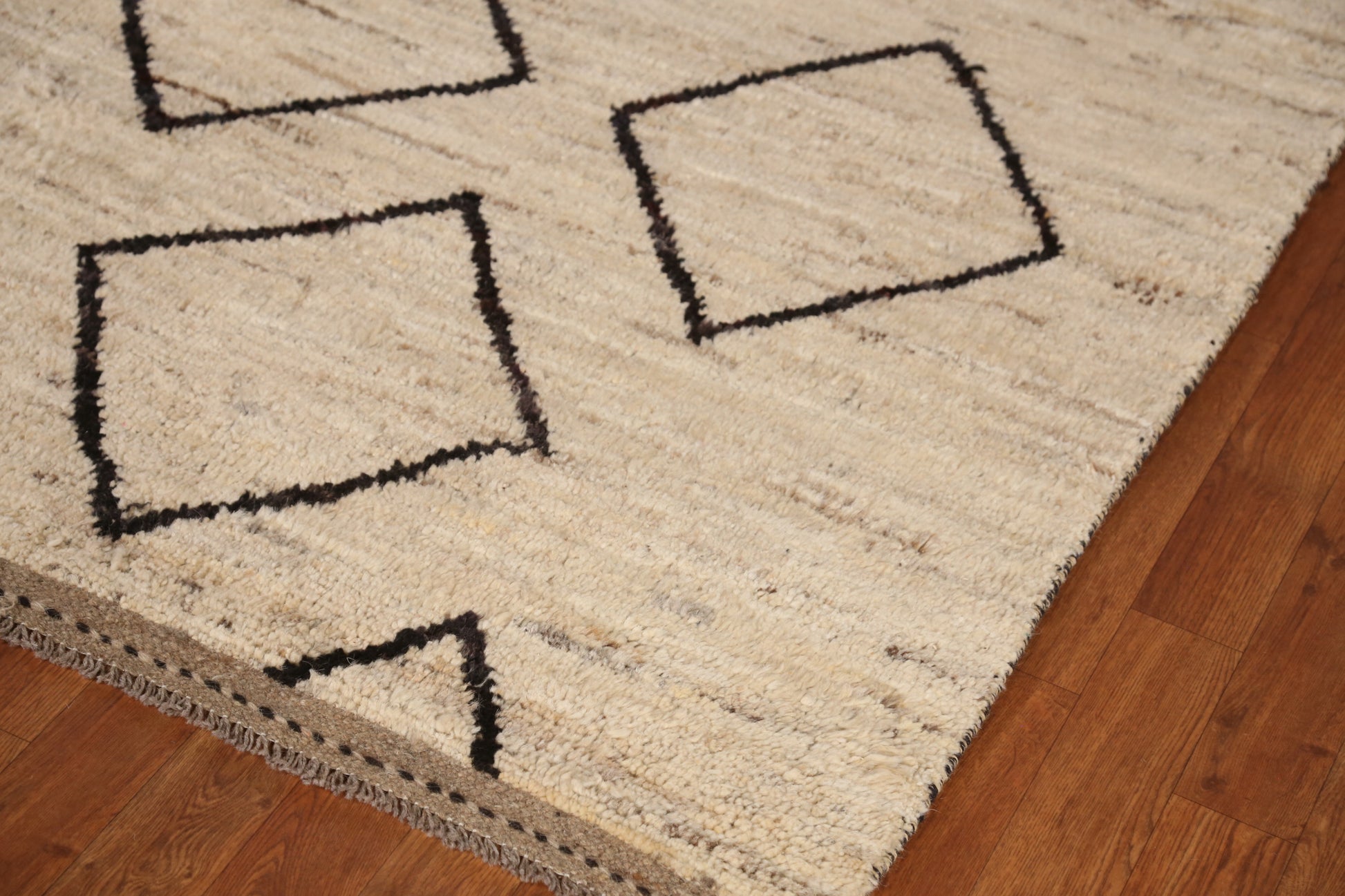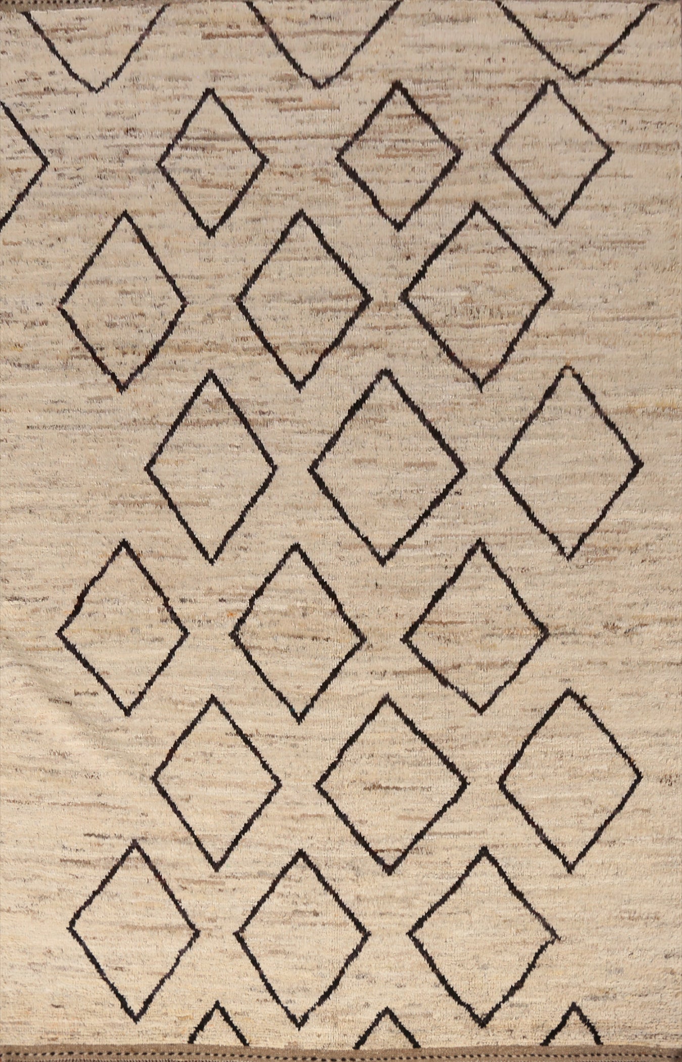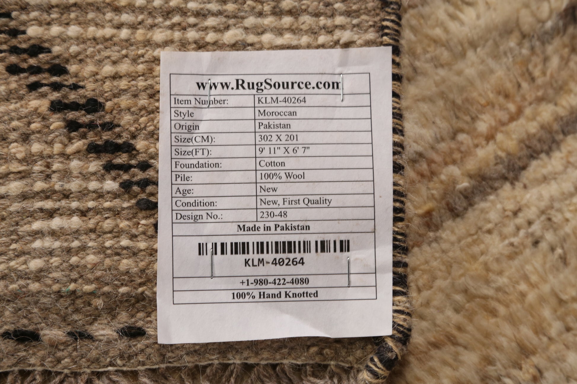 A Beautiful Genuine Pakistan Moroccan rug is Hand Knotted by skillful weavers in Pakistan with 100% Wool Material. This rug is in New, First Quality condition. dimensions are 9' 11'' X 6' 7'' in foot and 302 X 201 in centimeter. the primary color is Beige & Ivories.