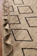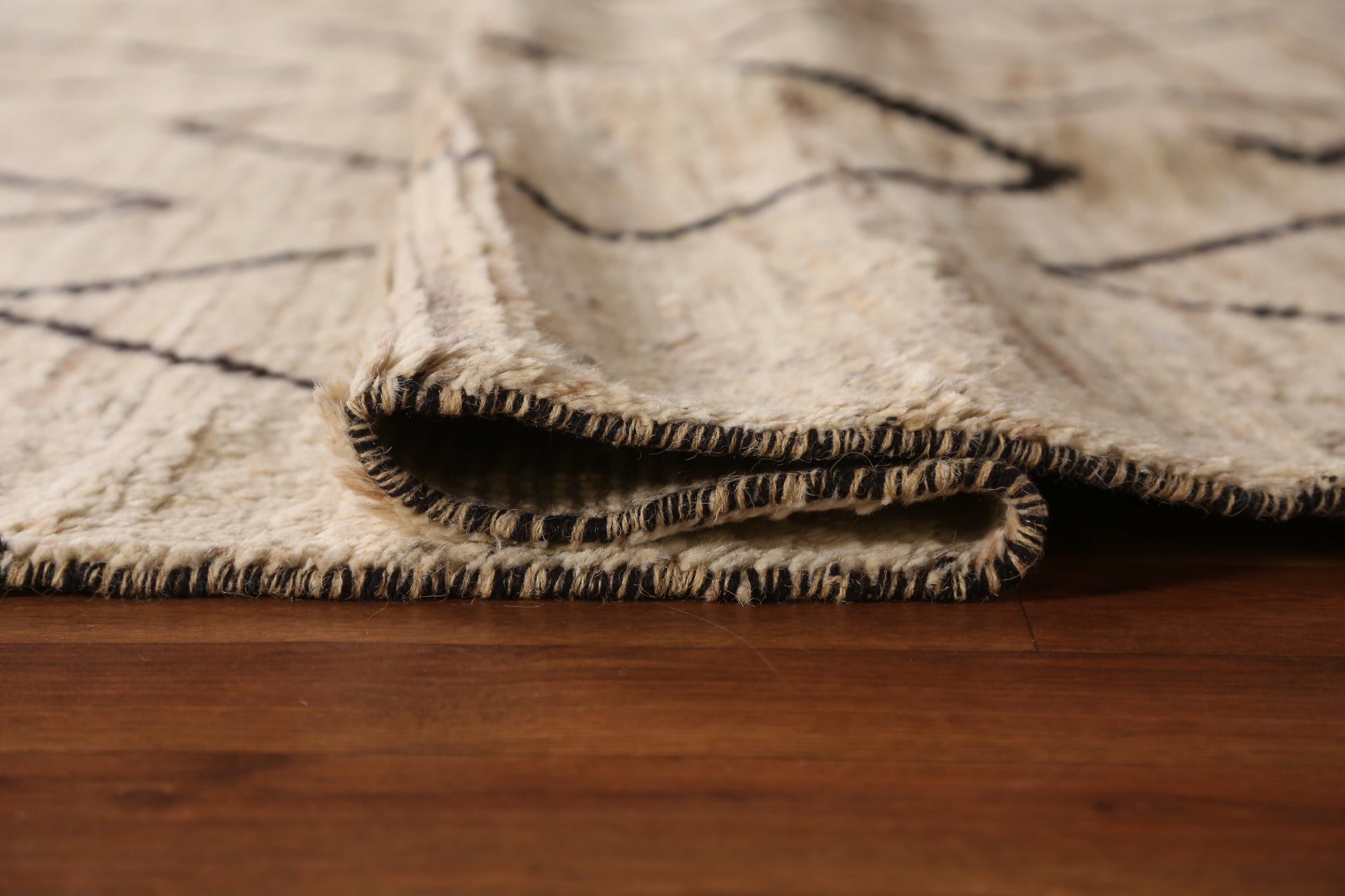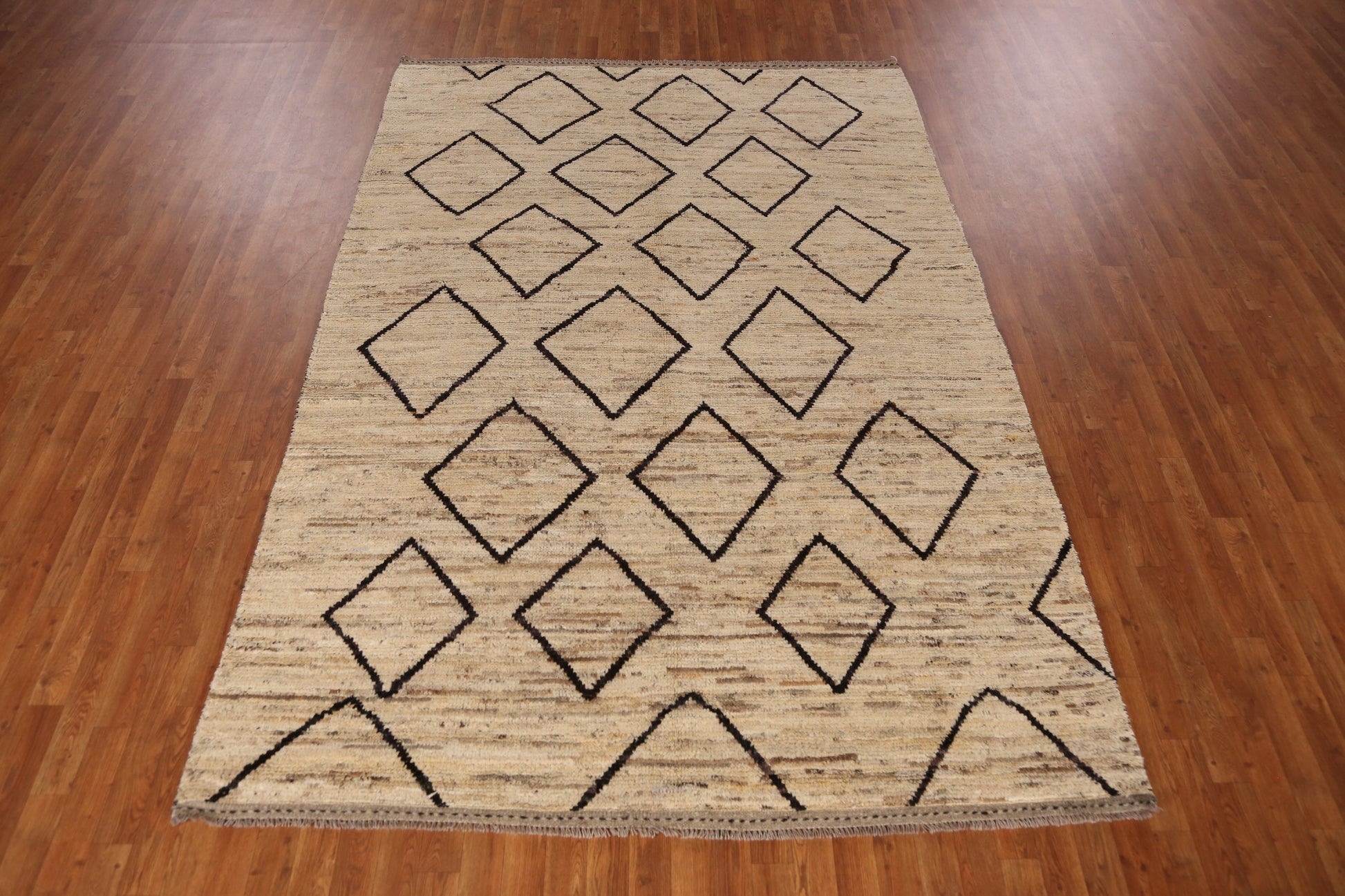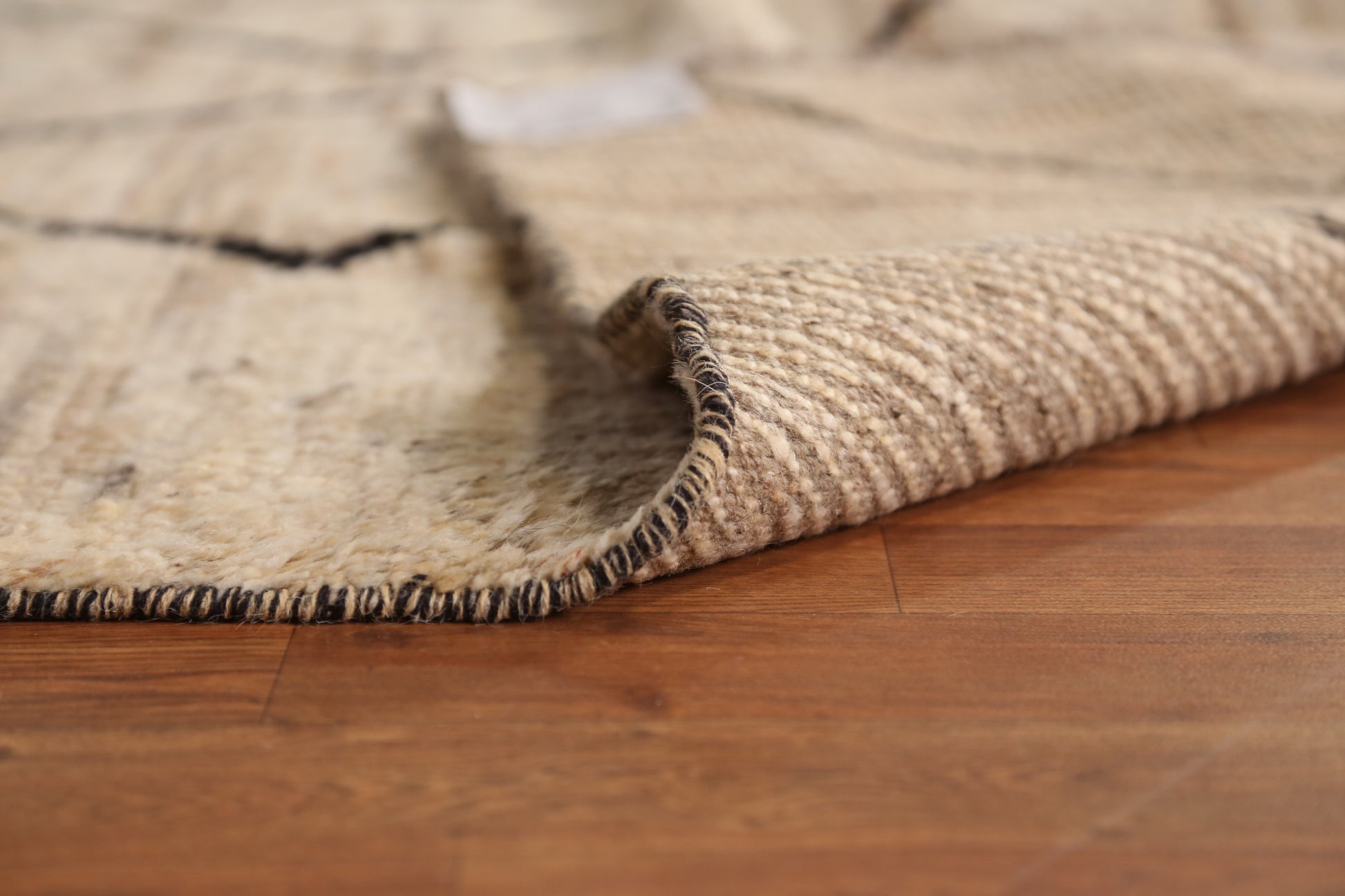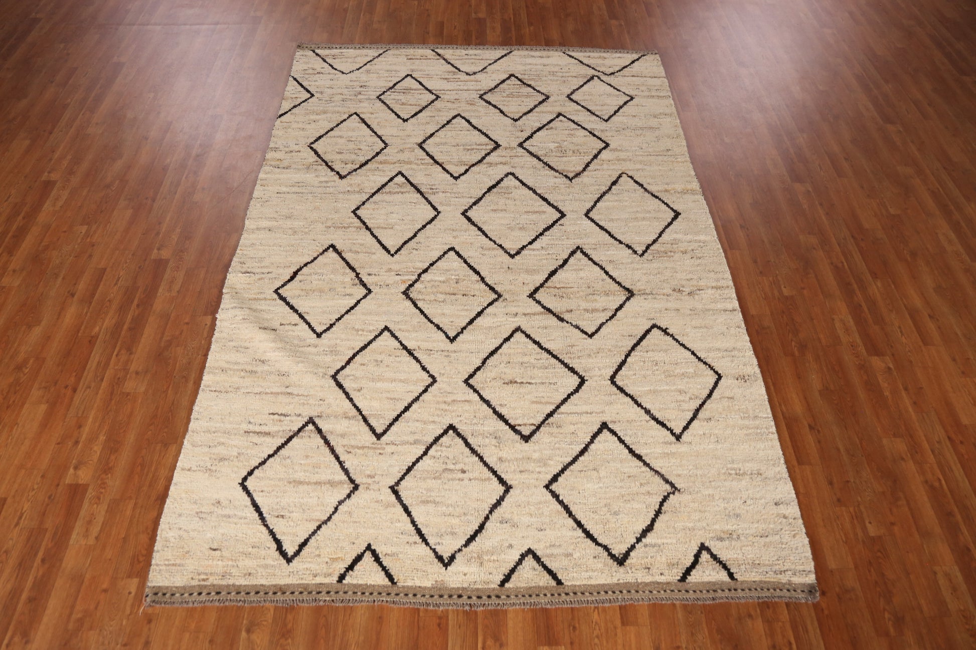 A Beautiful Genuine Pakistan Moroccan rug is Hand Knotted by skillful weavers in Pakistan with 100% Wool Material. This rug is in New, First Quality condition. dimensions are 9' 11'' X 6' 7'' in foot and 302 X 201 in centimeter. the primary color is Beige & Ivories.
