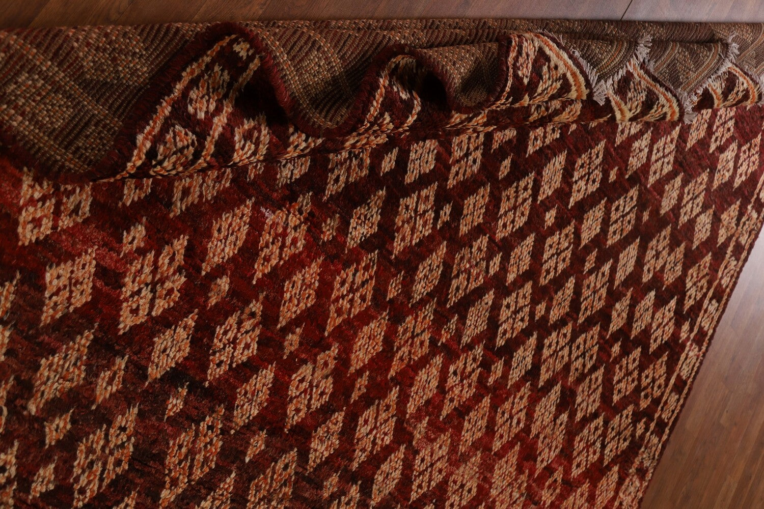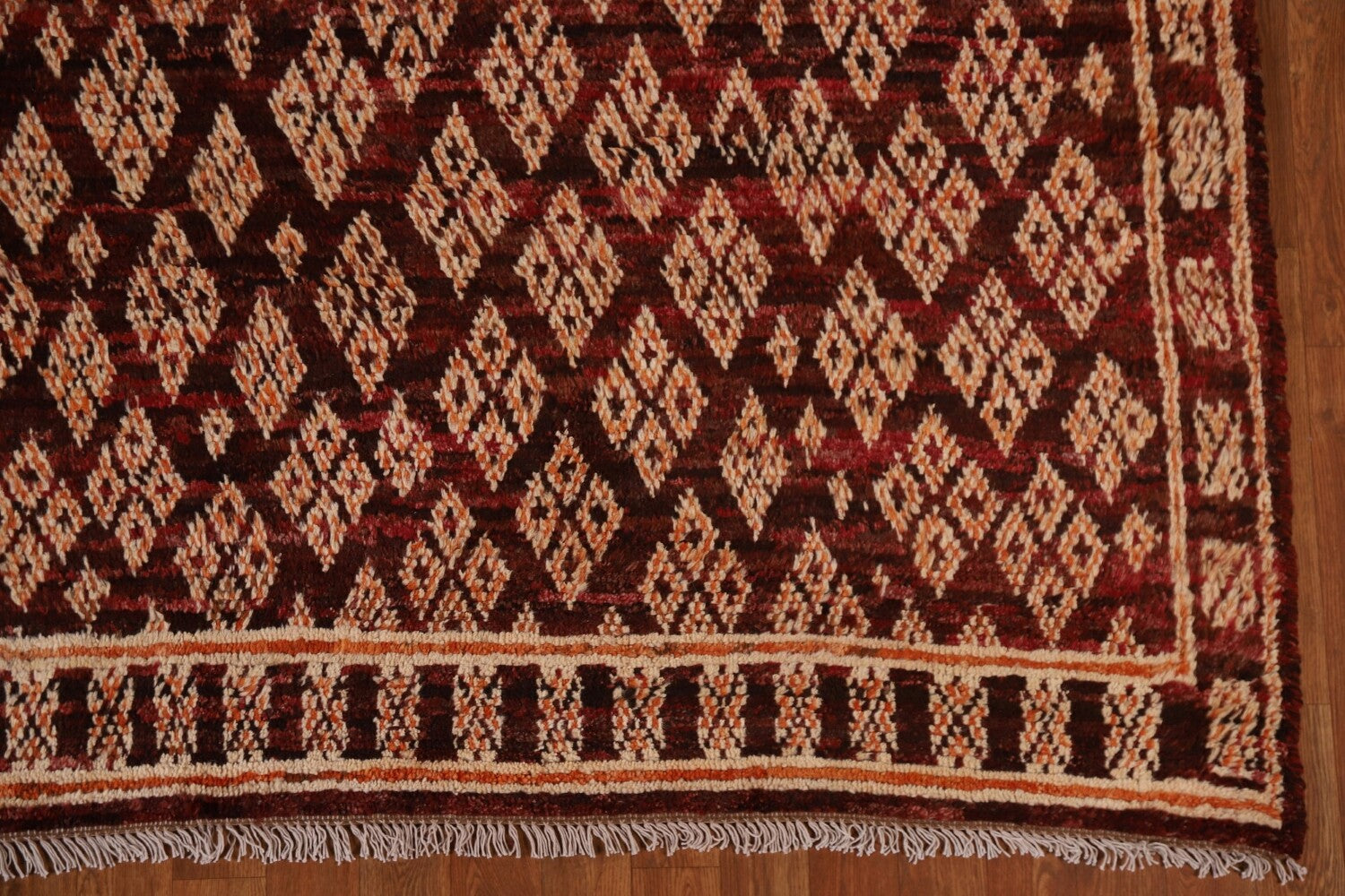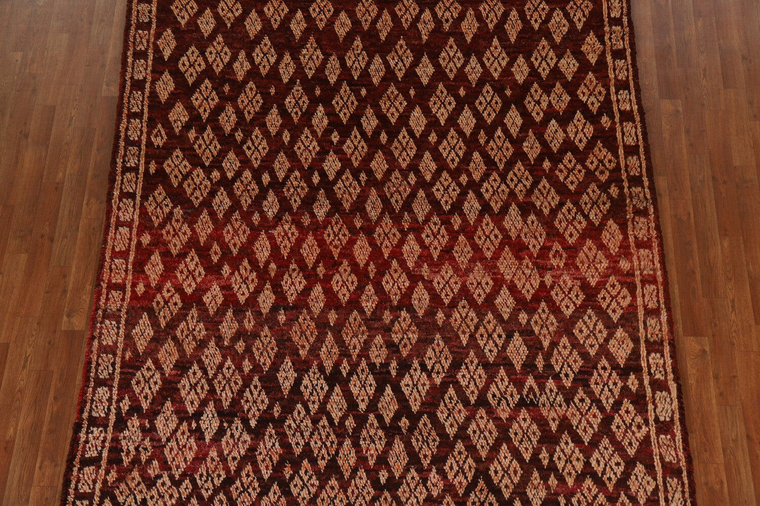 A Beautiful Genuine Pakistan Moroccan rug is Hand Knotted by skillful weavers in Pakistan with 100% Wool Material. This rug is in New, First Quality condition. dimensions are 9' 2'' X 6' 10'' in foot and 279 X 208 in centimeter. the primary color is Red.