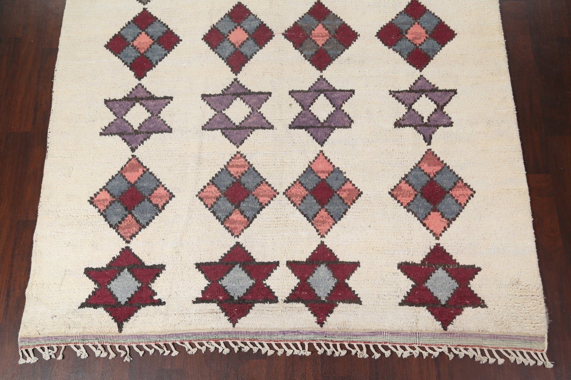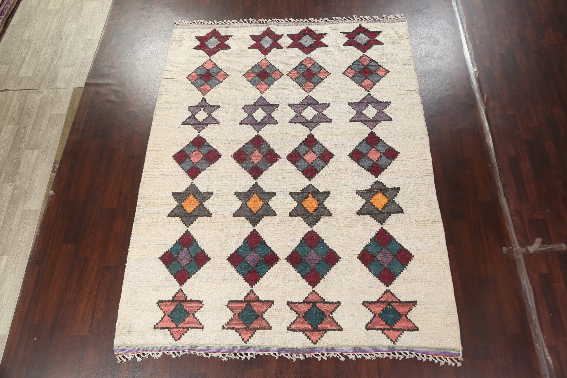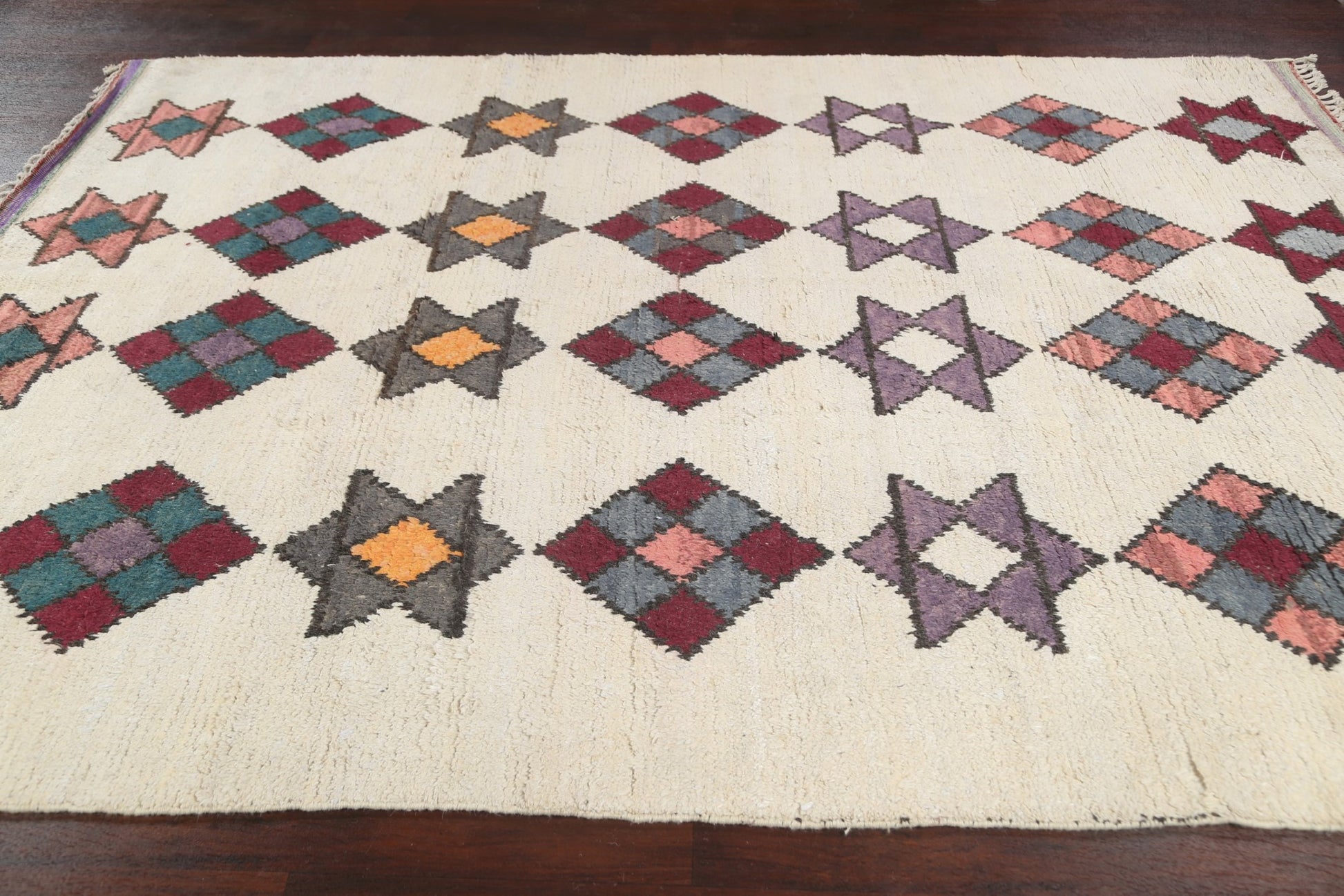 A Beautiful Genuine Morocco Moroccan rug is Hand Knotted by skillful weavers in Morocco with 100% Wool Material. This rug is in New, First Quality condition. dimensions are 10' 7'' X 7' 10'' in foot and 323 X 239 in centimeter. the primary color is Beige & Ivories.