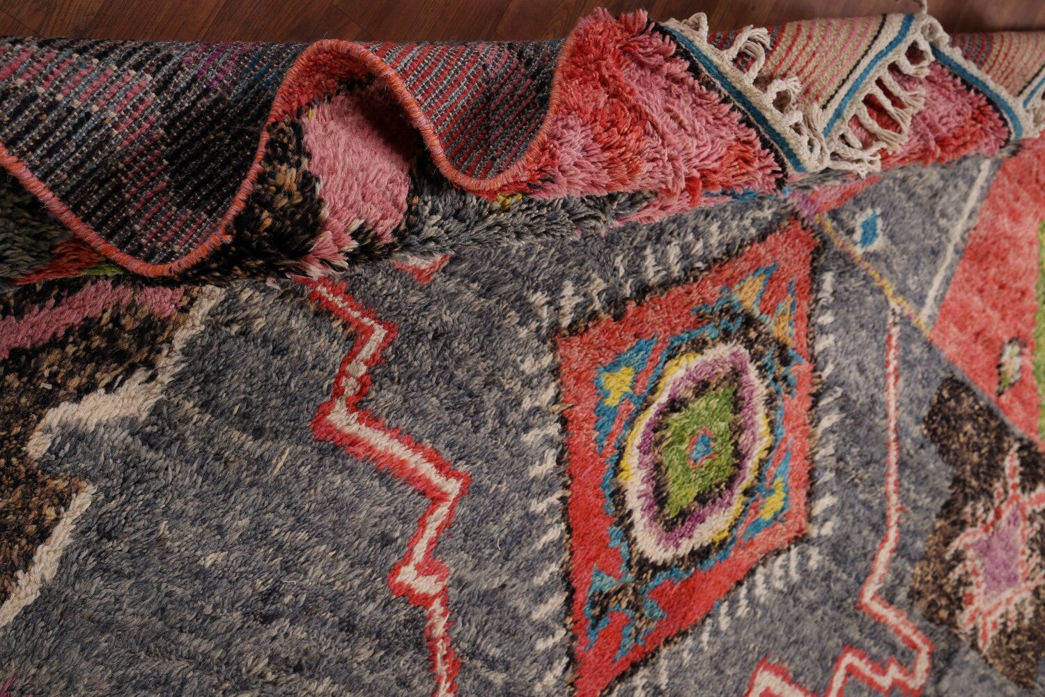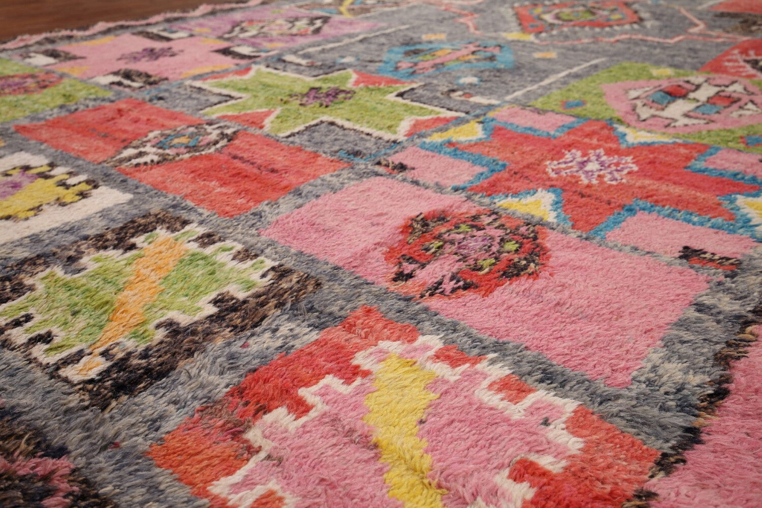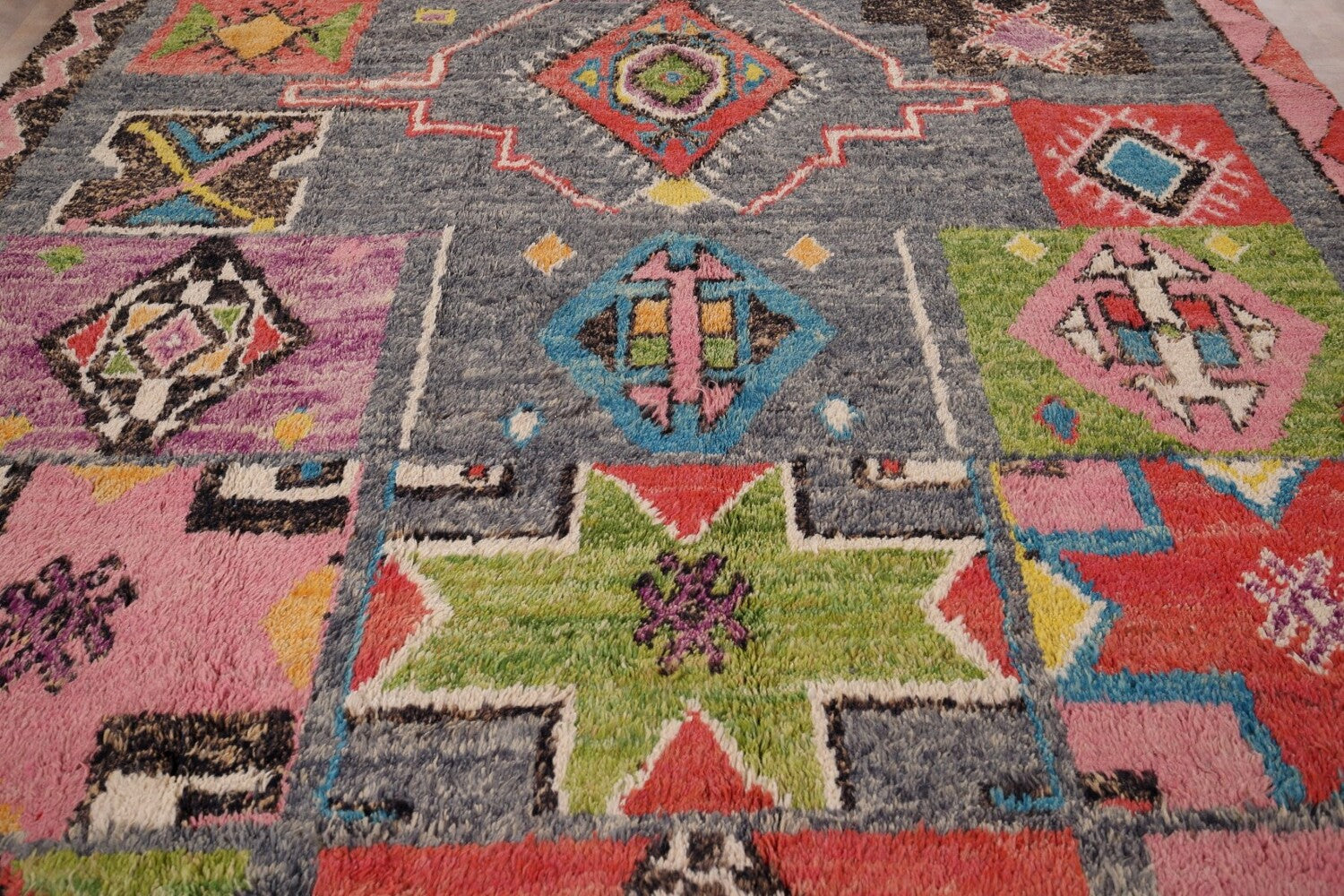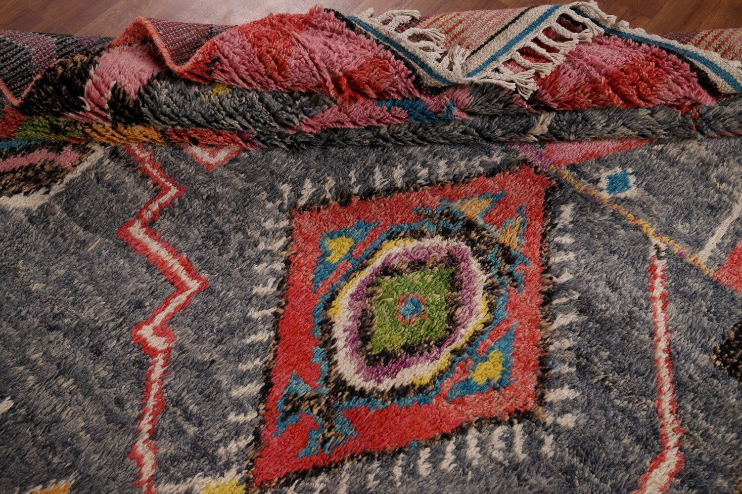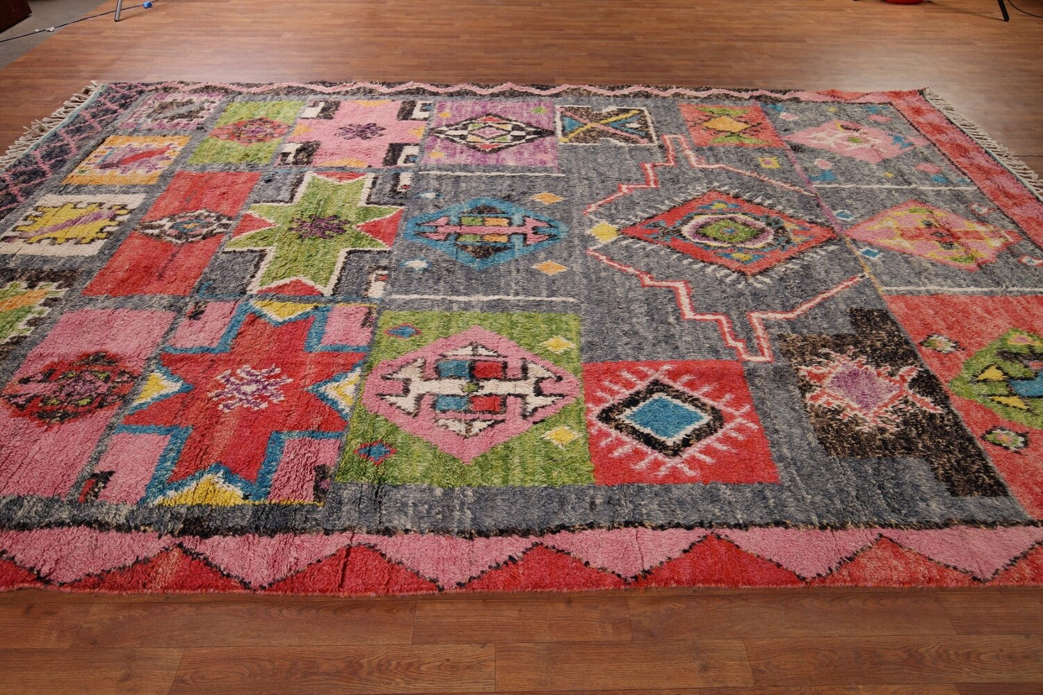 A Beautiful Genuine Pakistan Moroccan rug is Hand Knotted by skillful weavers in Pakistan with 100% Wool Material. This rug is in condition. dimensions are 12' 9'' X 8' 5'' in foot and 389 X 257 in centimeter. the primary color is Greys & Charcoal.