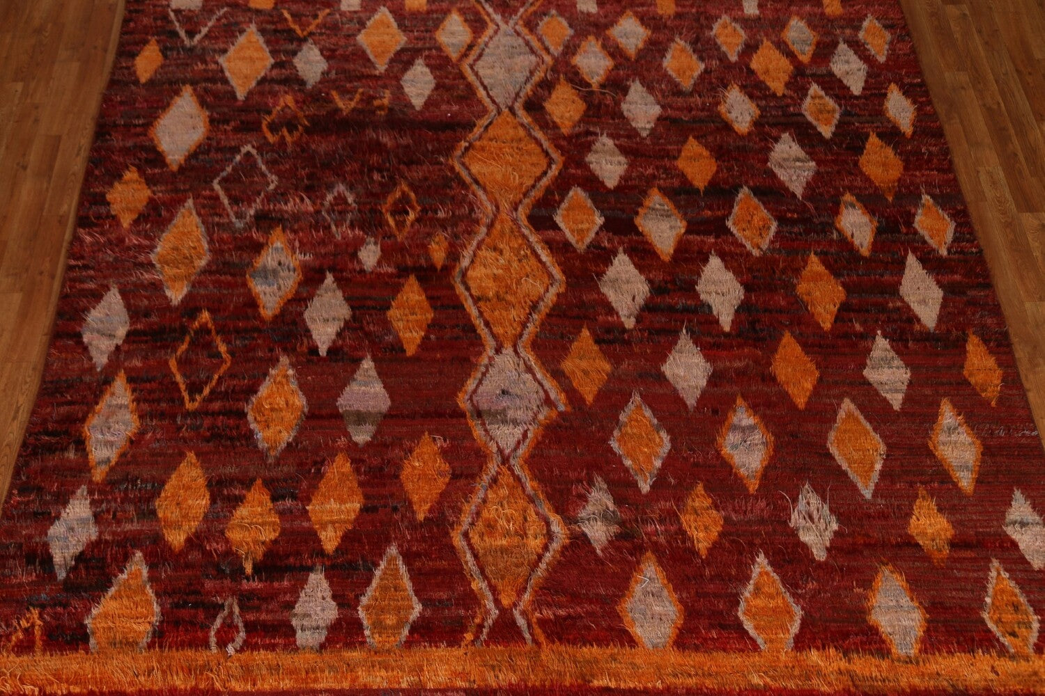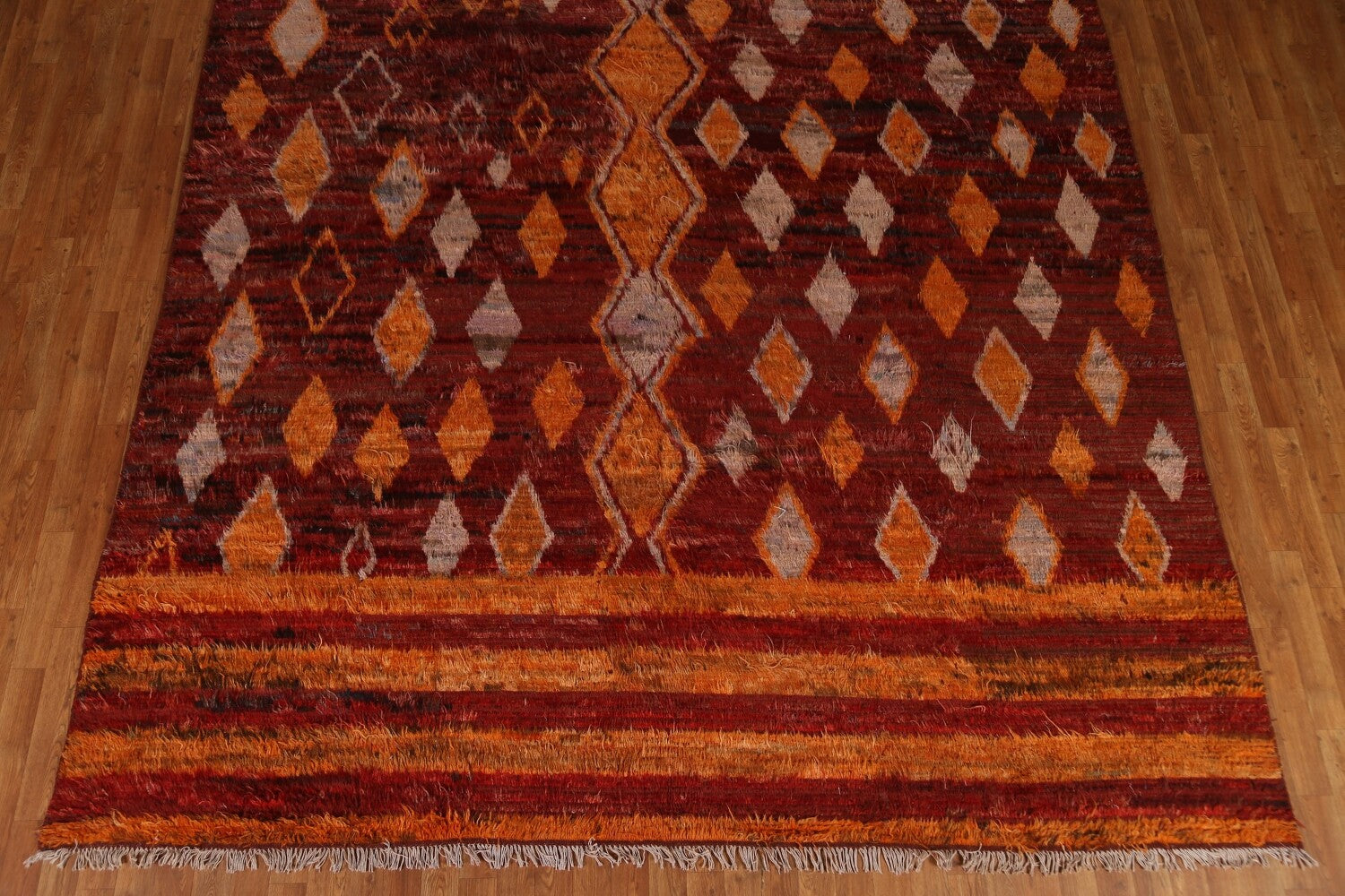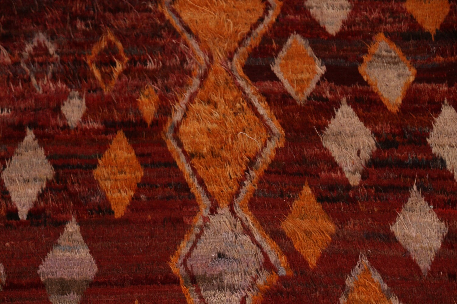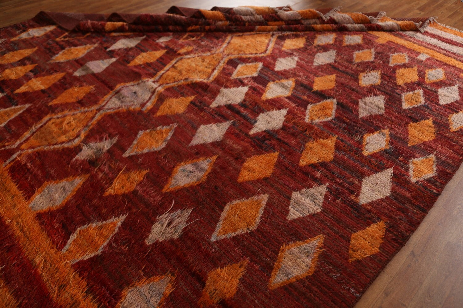 A Beautiful Genuine Pakistan Moroccan rug is Hand Knotted by skillful weavers in Pakistan with 100% Wool Material. This rug is in condition. dimensions are 12' 0'' X 9' 3'' in foot and 366 X 282 in centimeter. the primary color is Red.