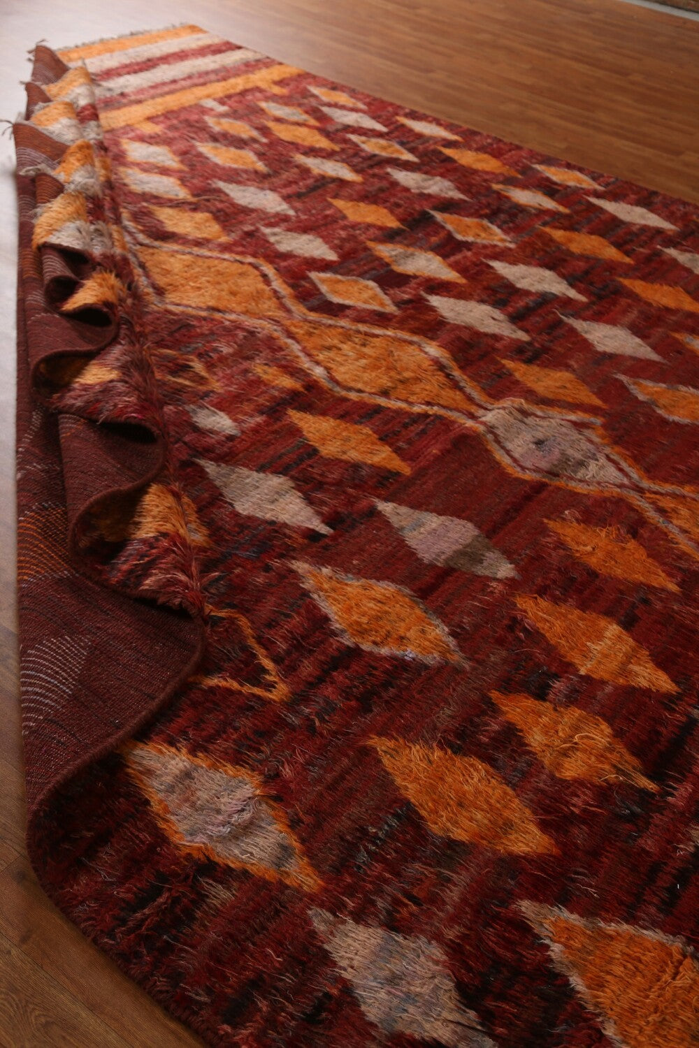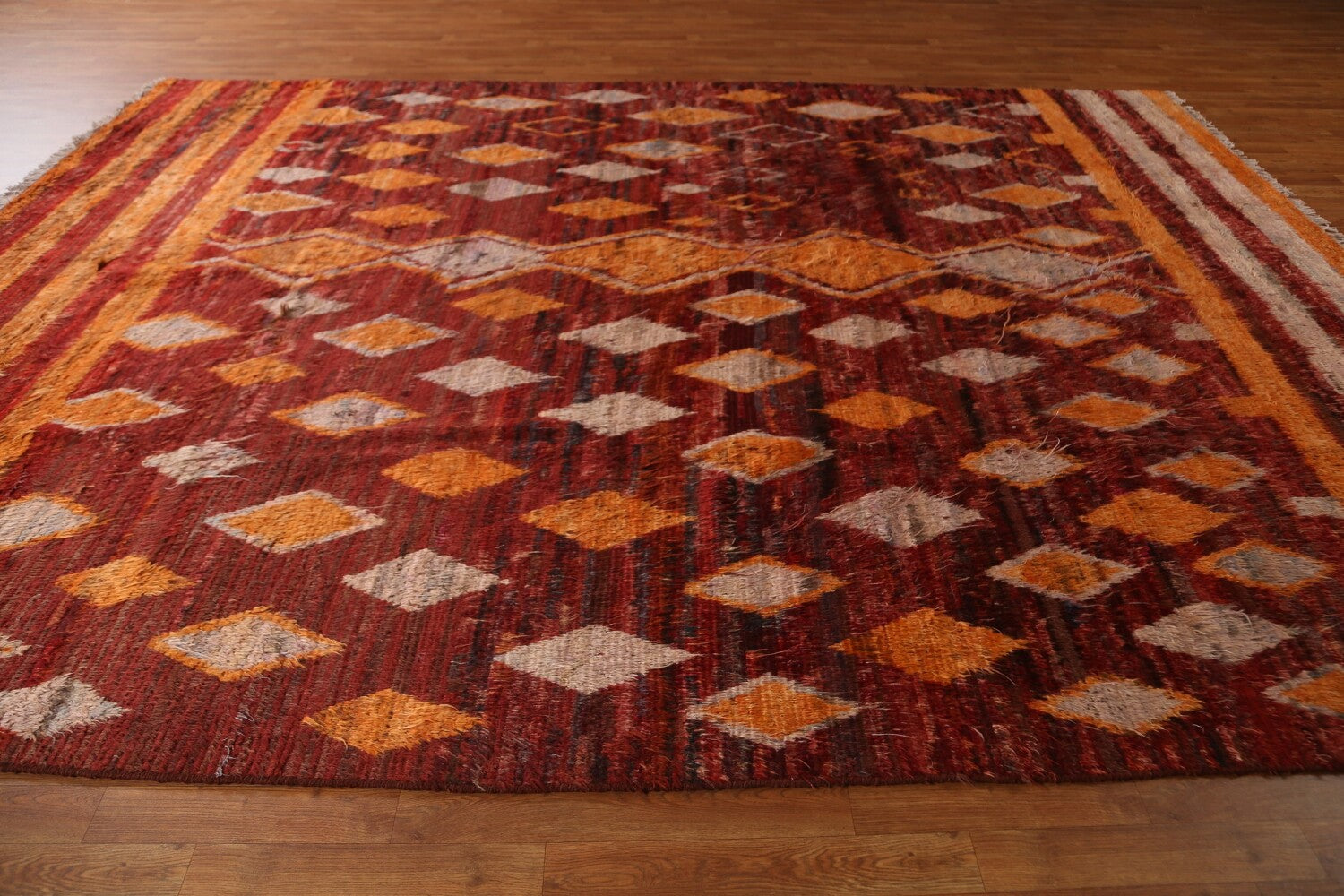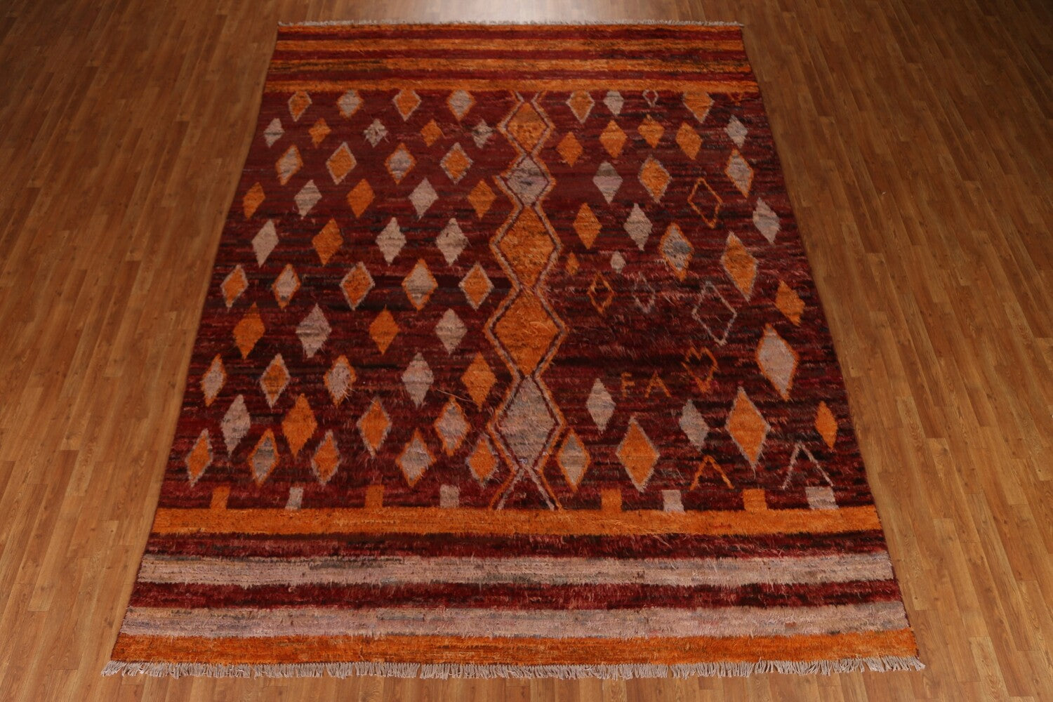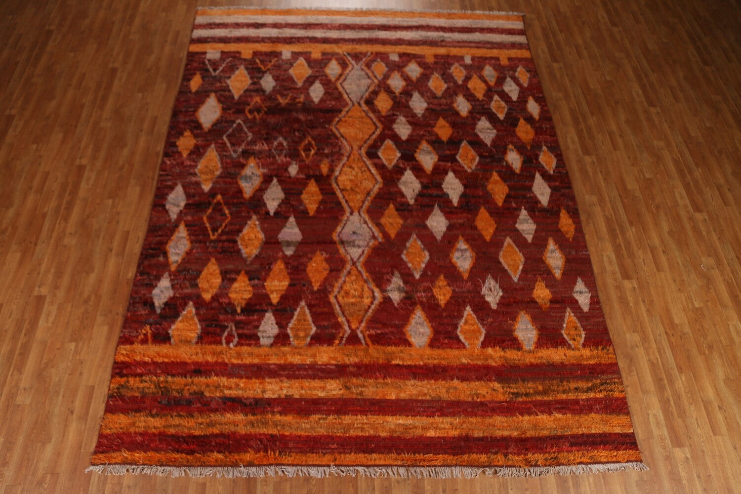 A Beautiful Genuine Pakistan Moroccan rug is Hand Knotted by skillful weavers in Pakistan with 100% Wool Material. This rug is in condition. dimensions are 12' 0'' X 9' 3'' in foot and 366 X 282 in centimeter. the primary color is Red.