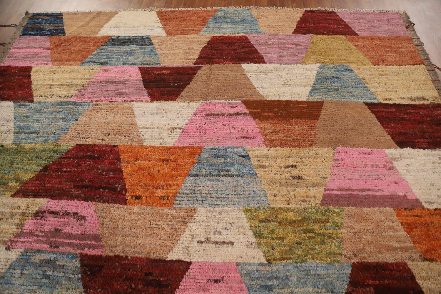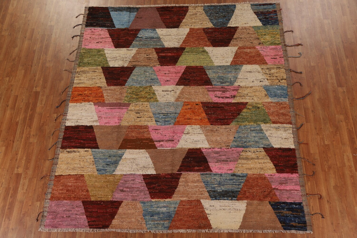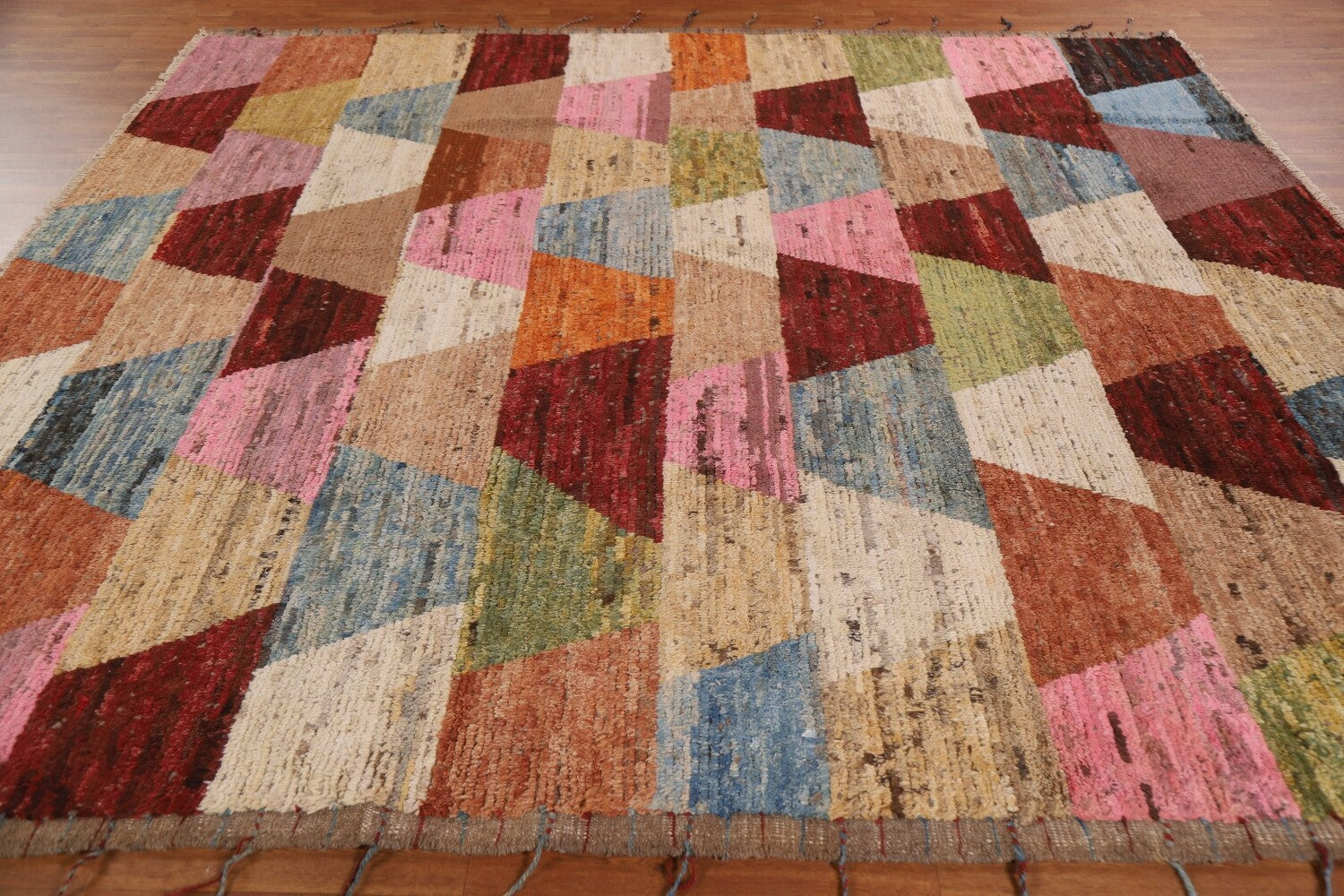 A Beautiful Genuine Pakistan Moroccan rug is Hand Knotted by skillful weavers in Pakistan with 100% Wool Material. This rug is in condition. dimensions are 9' 5'' X 8' 7'' in foot and 287 X 262 in centimeter. the primary color is Multi-Colored.