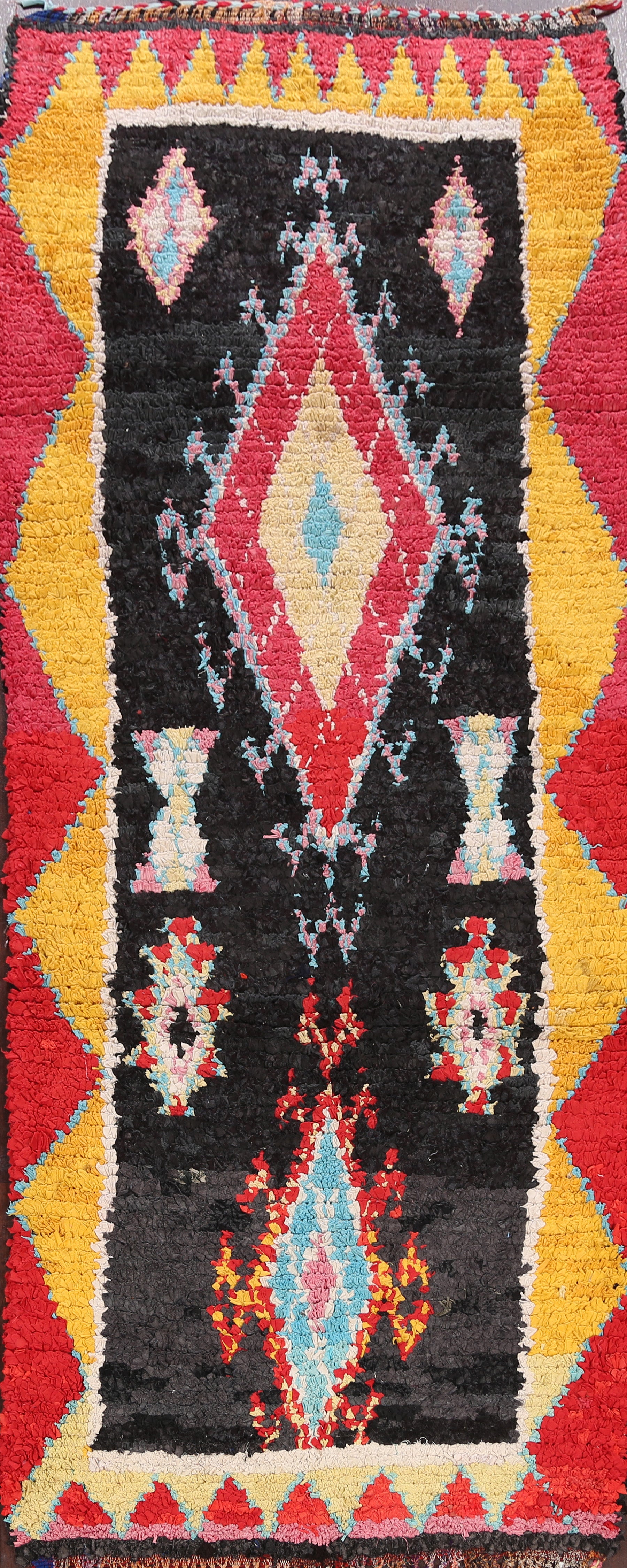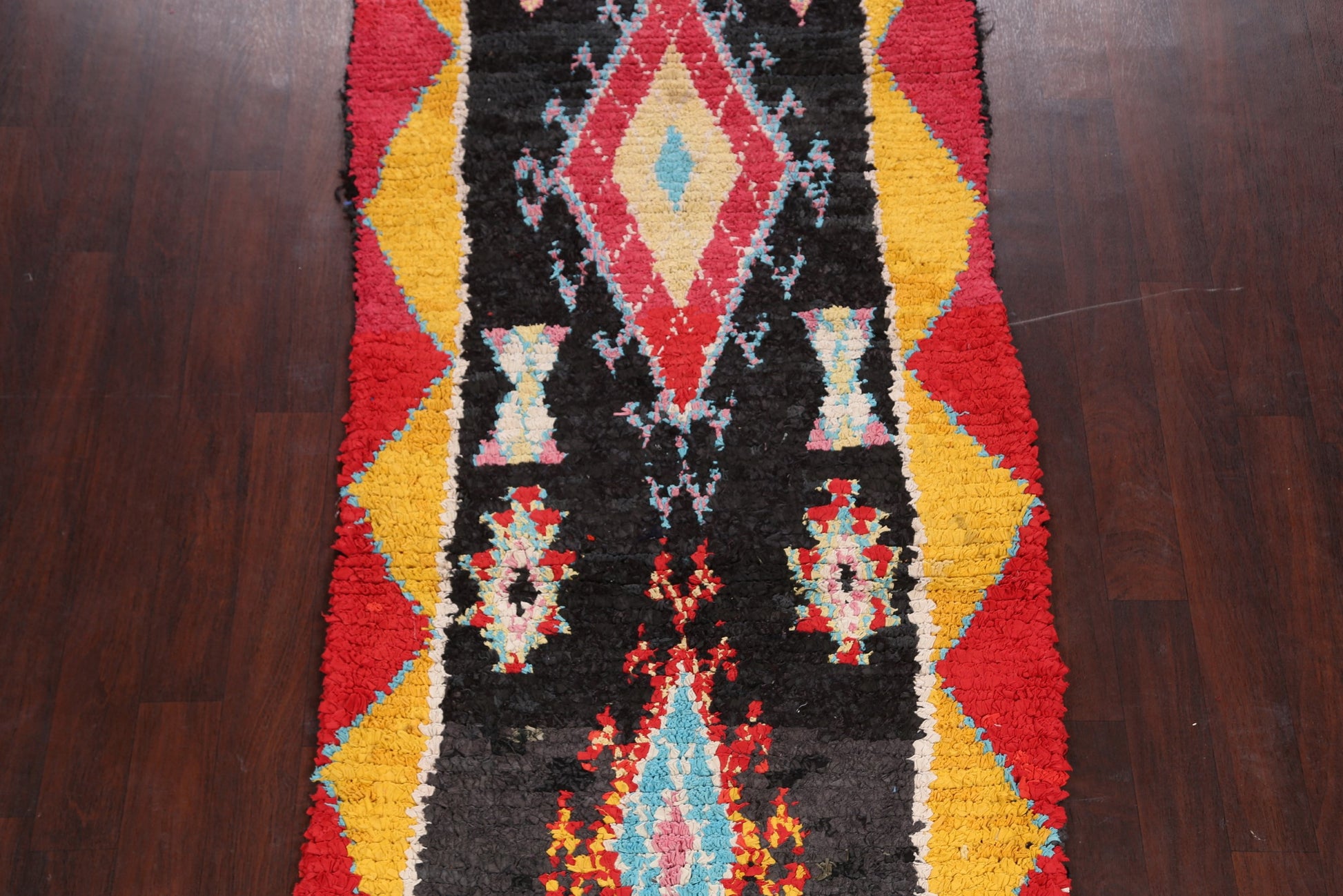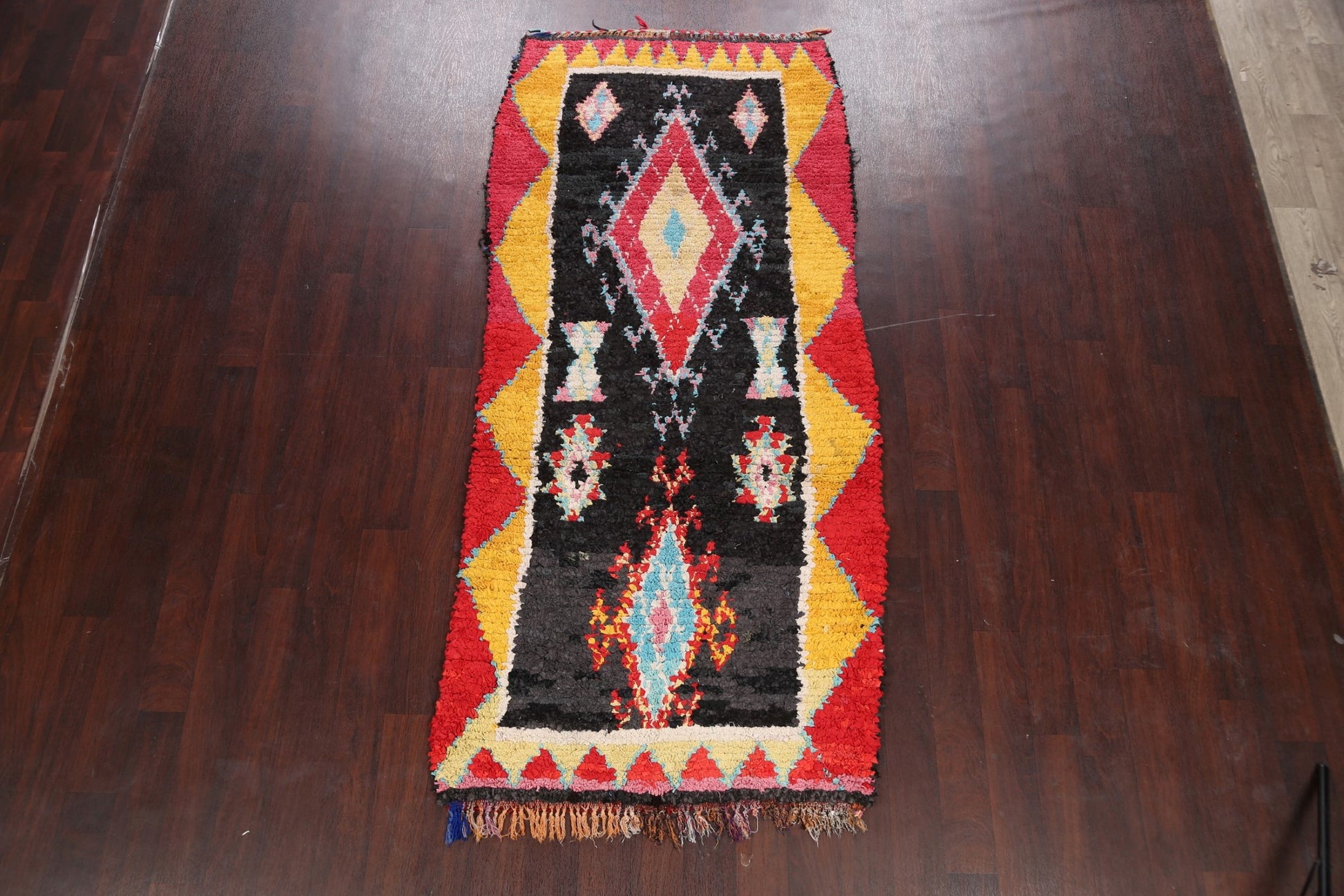 A Beautiful Genuine Morocco Moroccan rug is Hand Knotted by skillful weavers in Morocco with 100% Wool Material. This rug is in Very Good condition. dimensions are 8' 6'' X 3' 8'' in foot and 259 X 112 in centimeter. the primary color is Black.
