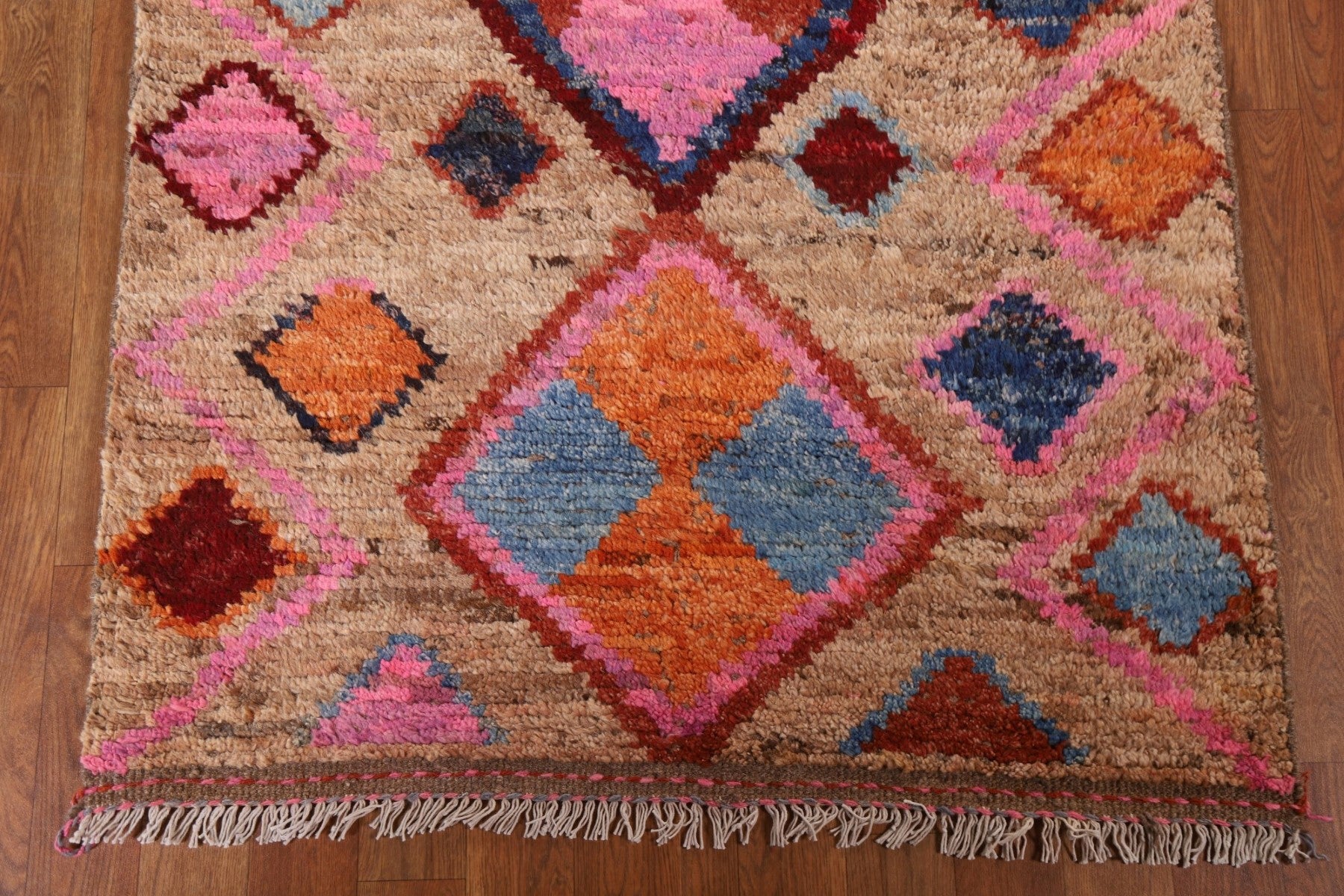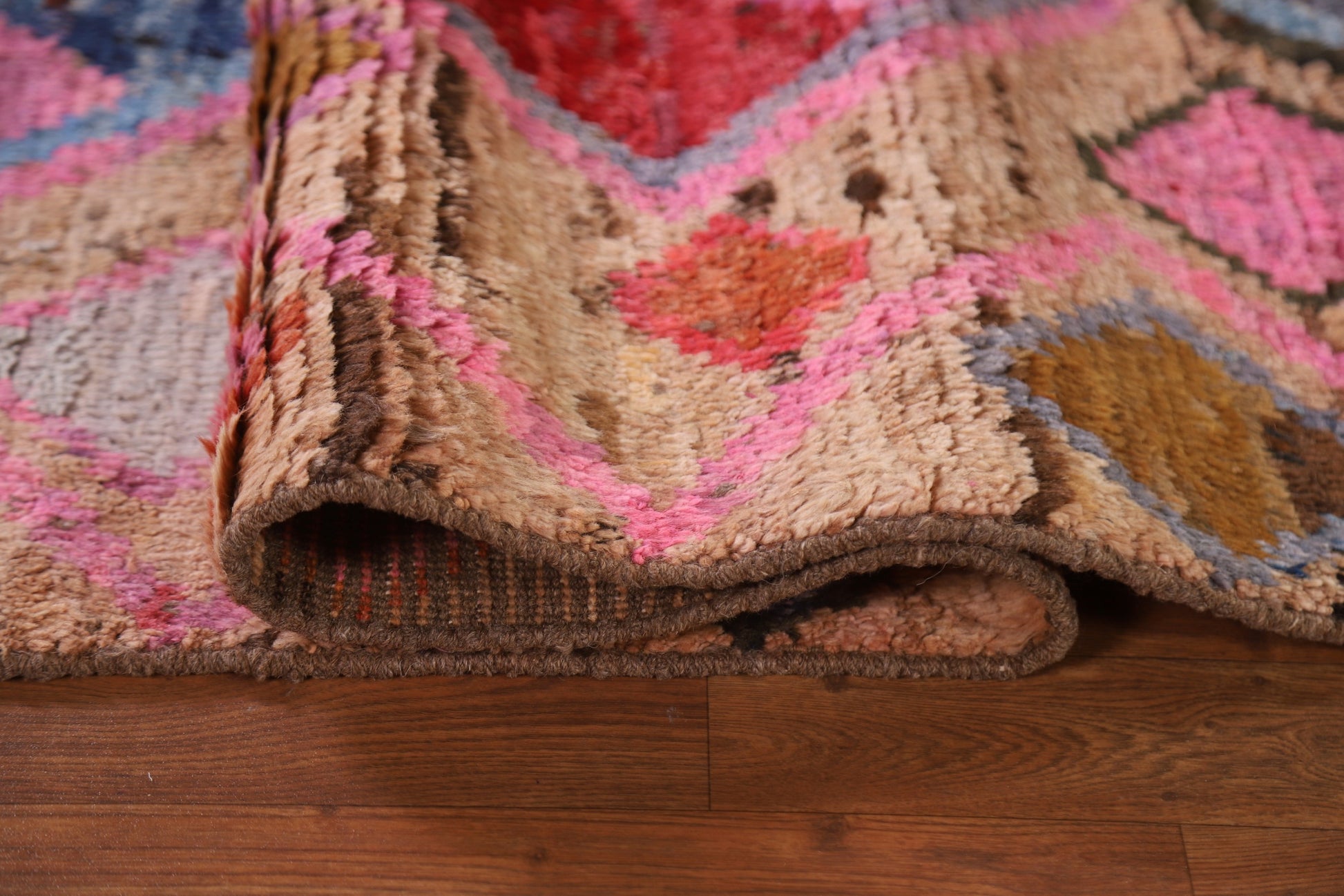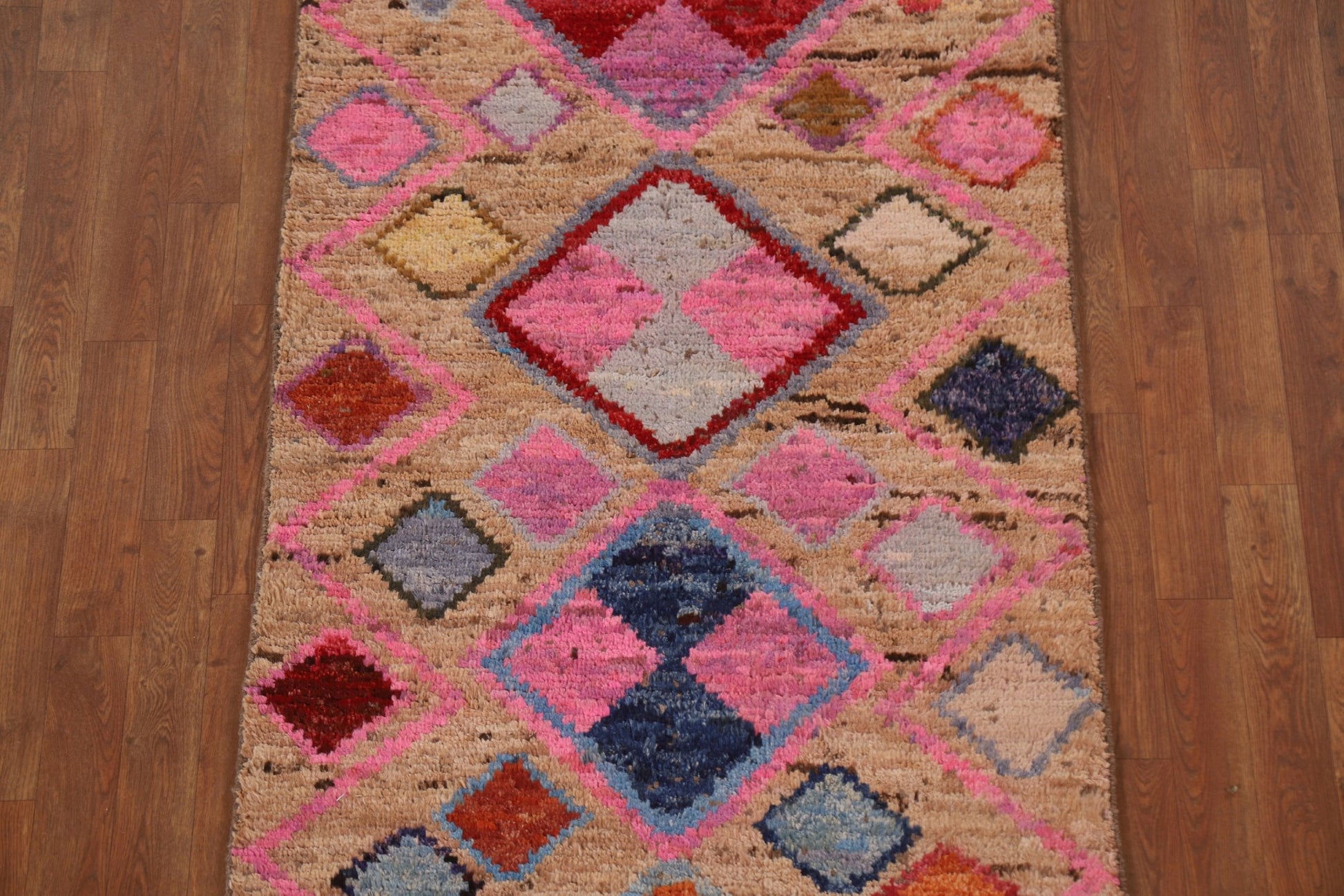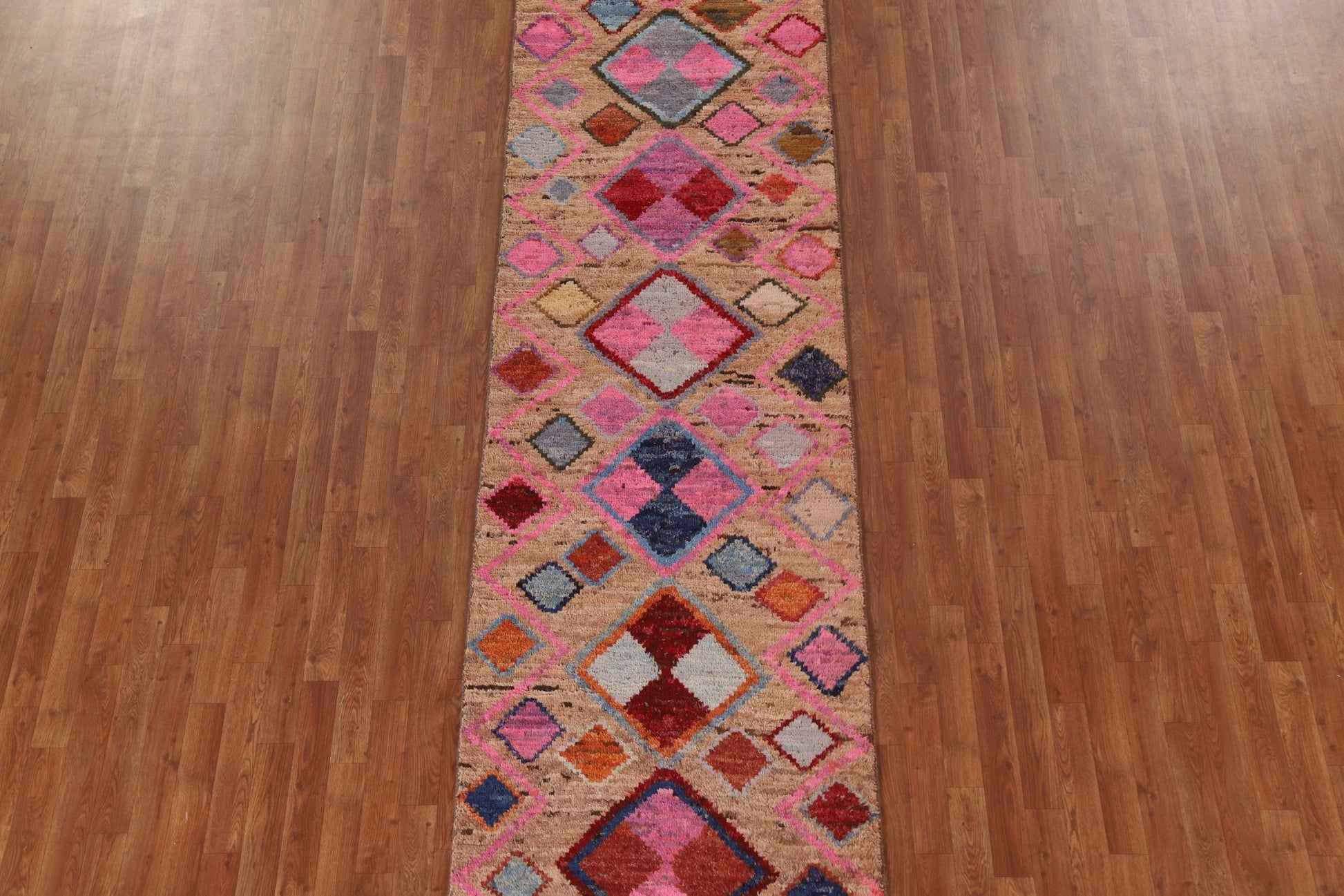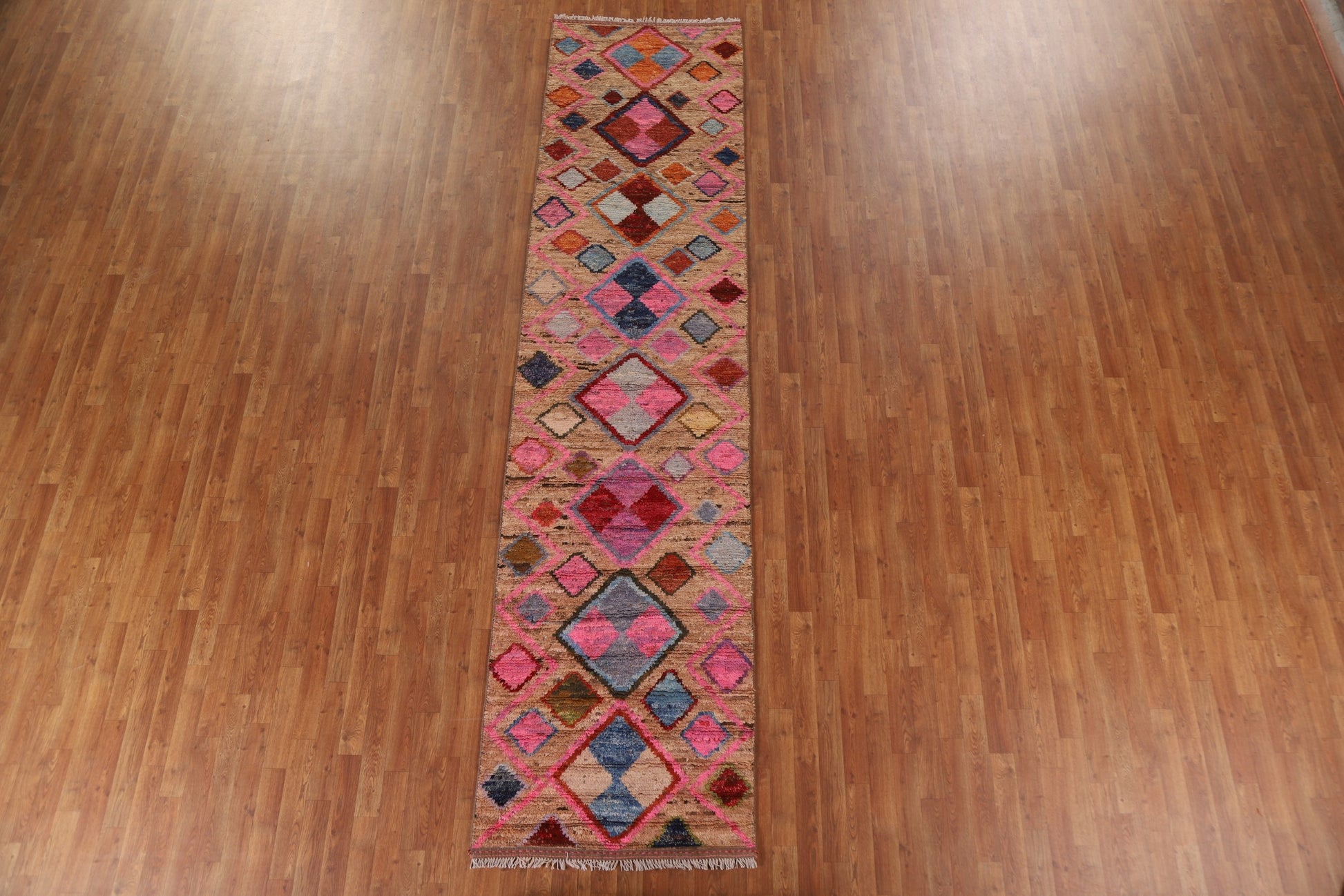 A Beautiful Genuine Pakistan Moroccan rug is Hand Knotted by skillful weavers in Pakistan with 100% Wool Material. This rug is in condition. dimensions are 12' 9'' X 3' 1'' in foot and 389 X 94 in centimeter. the primary color is Brown.