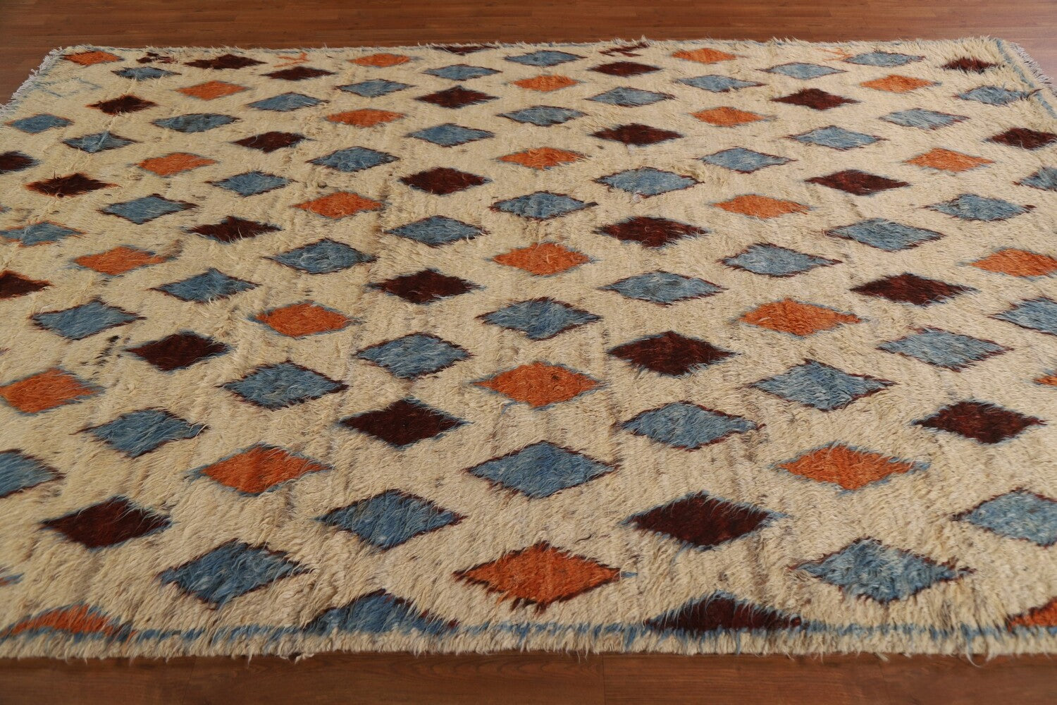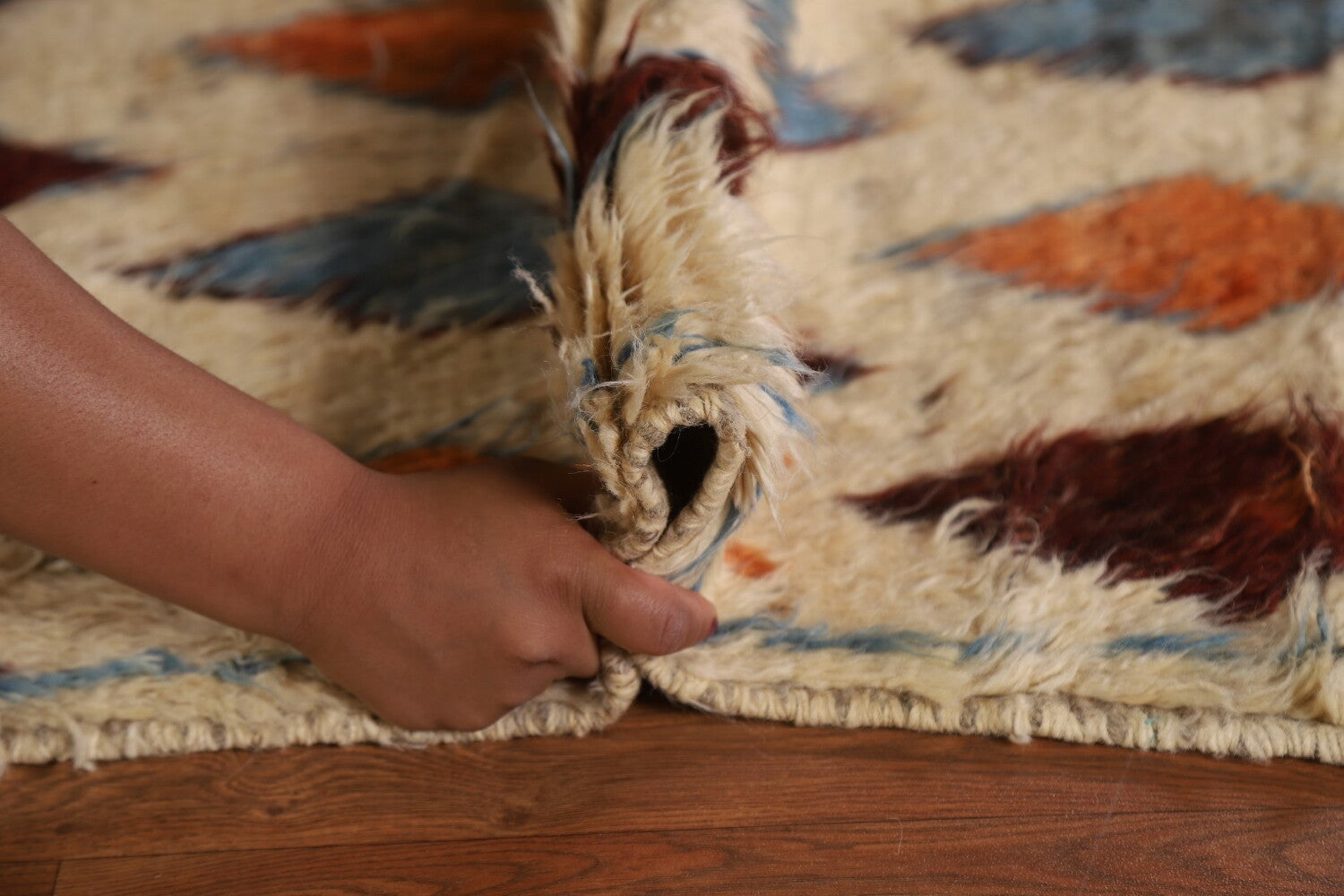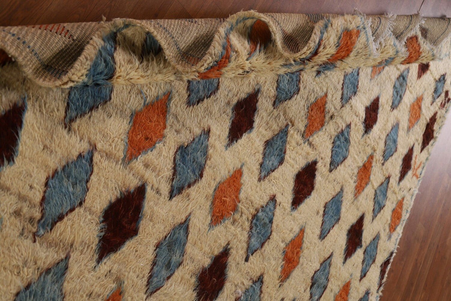 A Beautiful Genuine Pakistan Moroccan rug is Hand Knotted by skillful weavers in Pakistan with 100% Wool Material. This rug is in condition. dimensions are 9' 11'' X 6' 6'' in foot and 302 X 198 in centimeter. the primary color is Beige & Ivories.