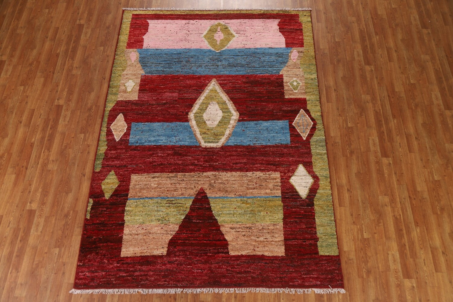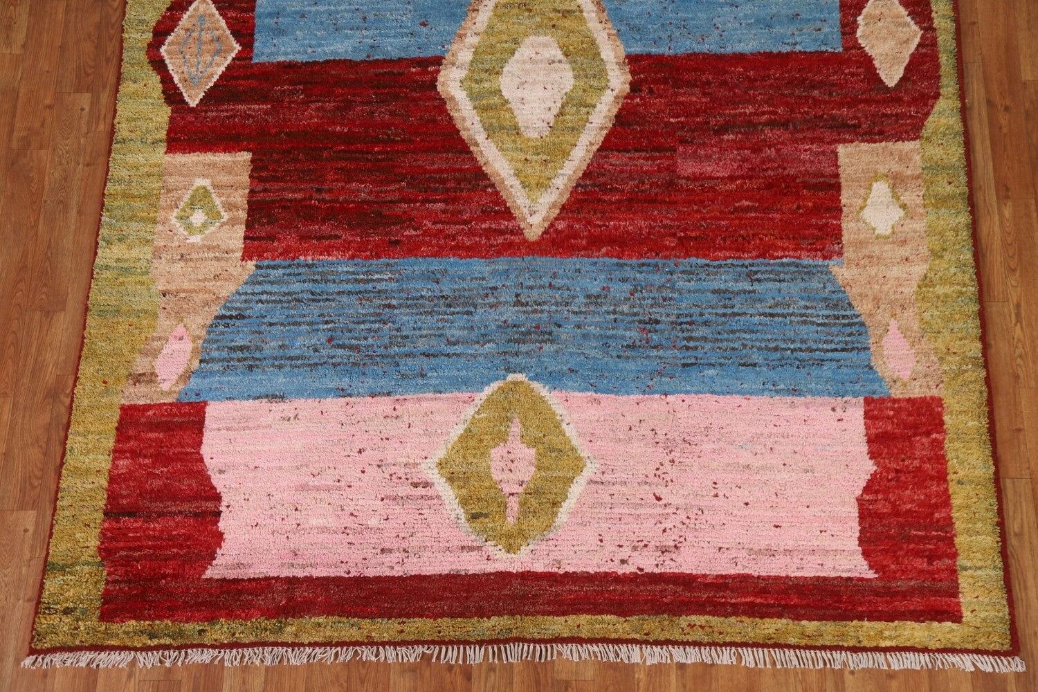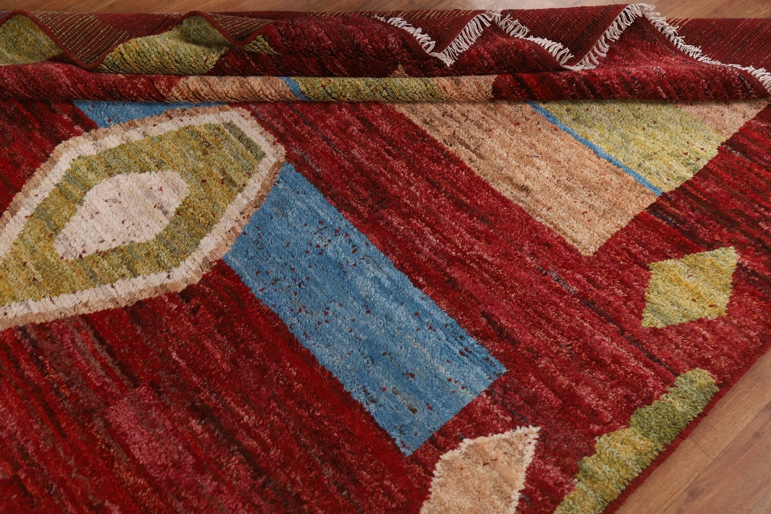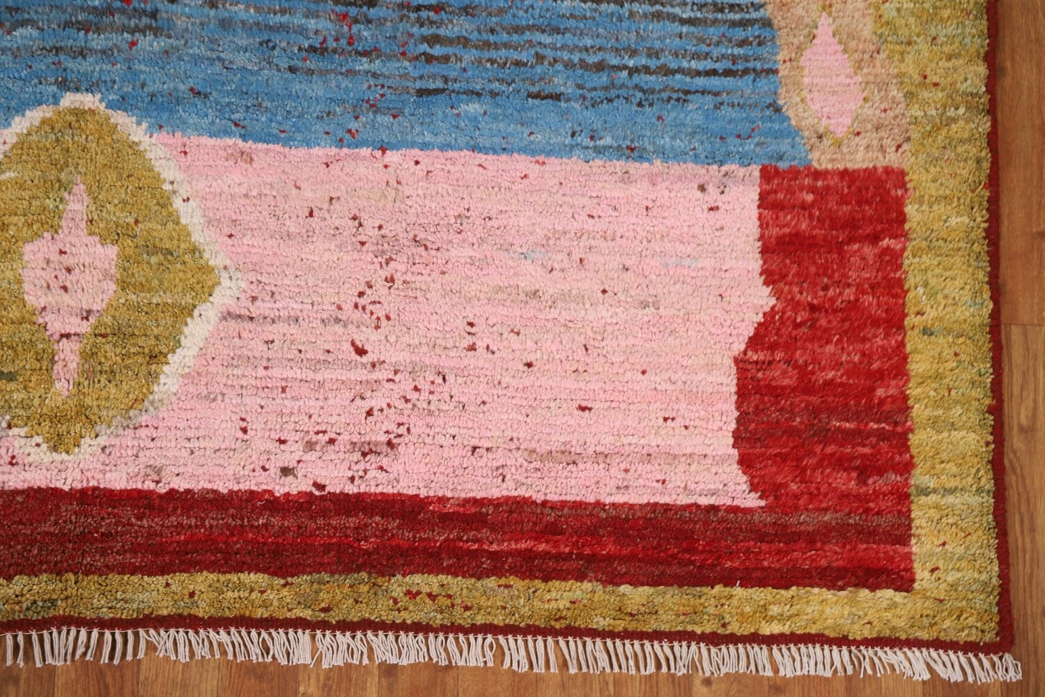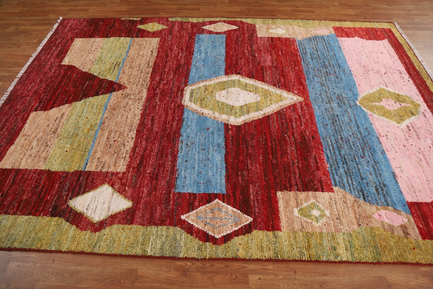 A Beautiful Genuine Pakistan Moroccan rug is Hand Knotted by skillful weavers in Pakistan with 100% Wool Material. This rug is in condition. dimensions are 9' 2'' X 6' 6'' in foot and 279 X 198 in centimeter. the primary color is Red.