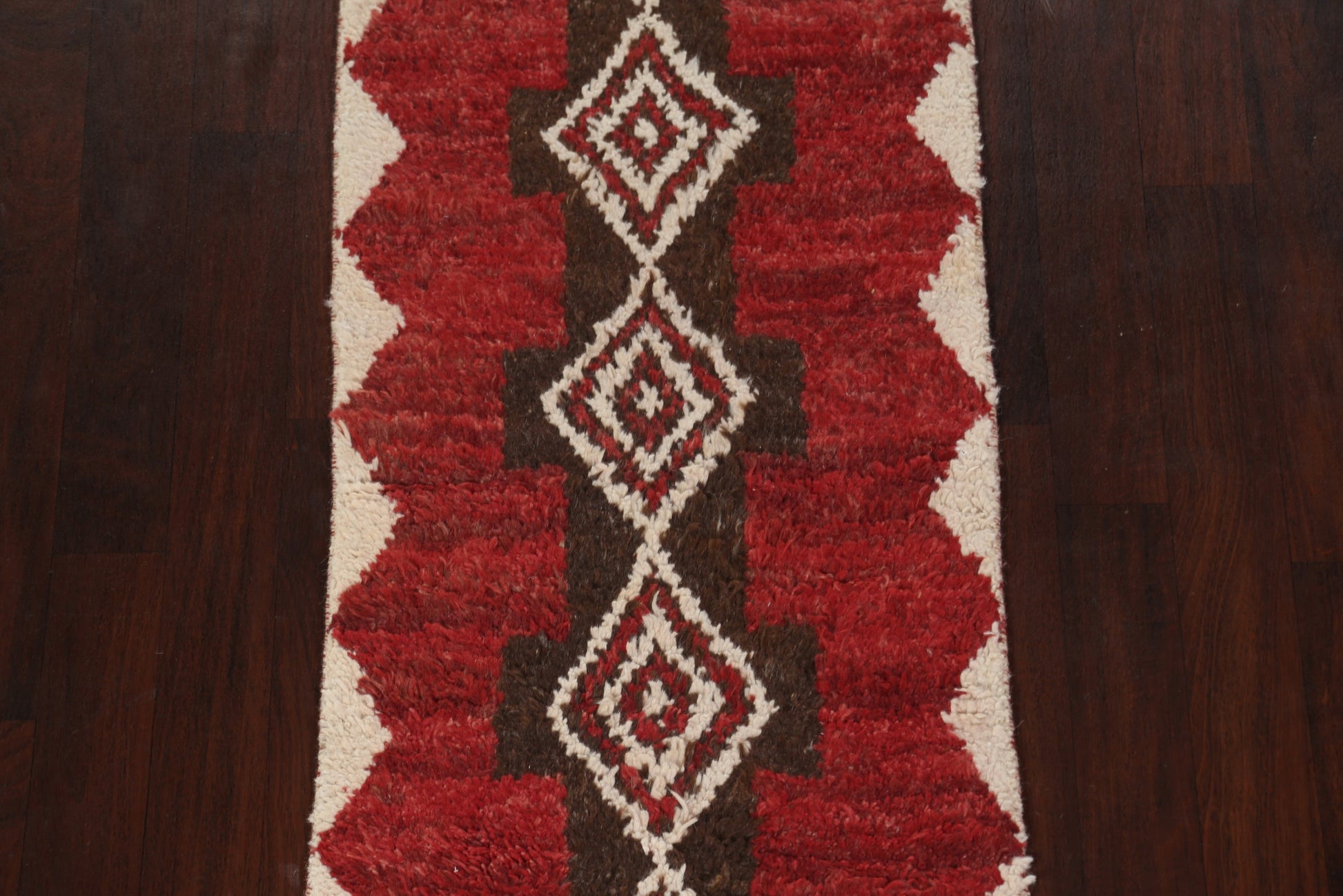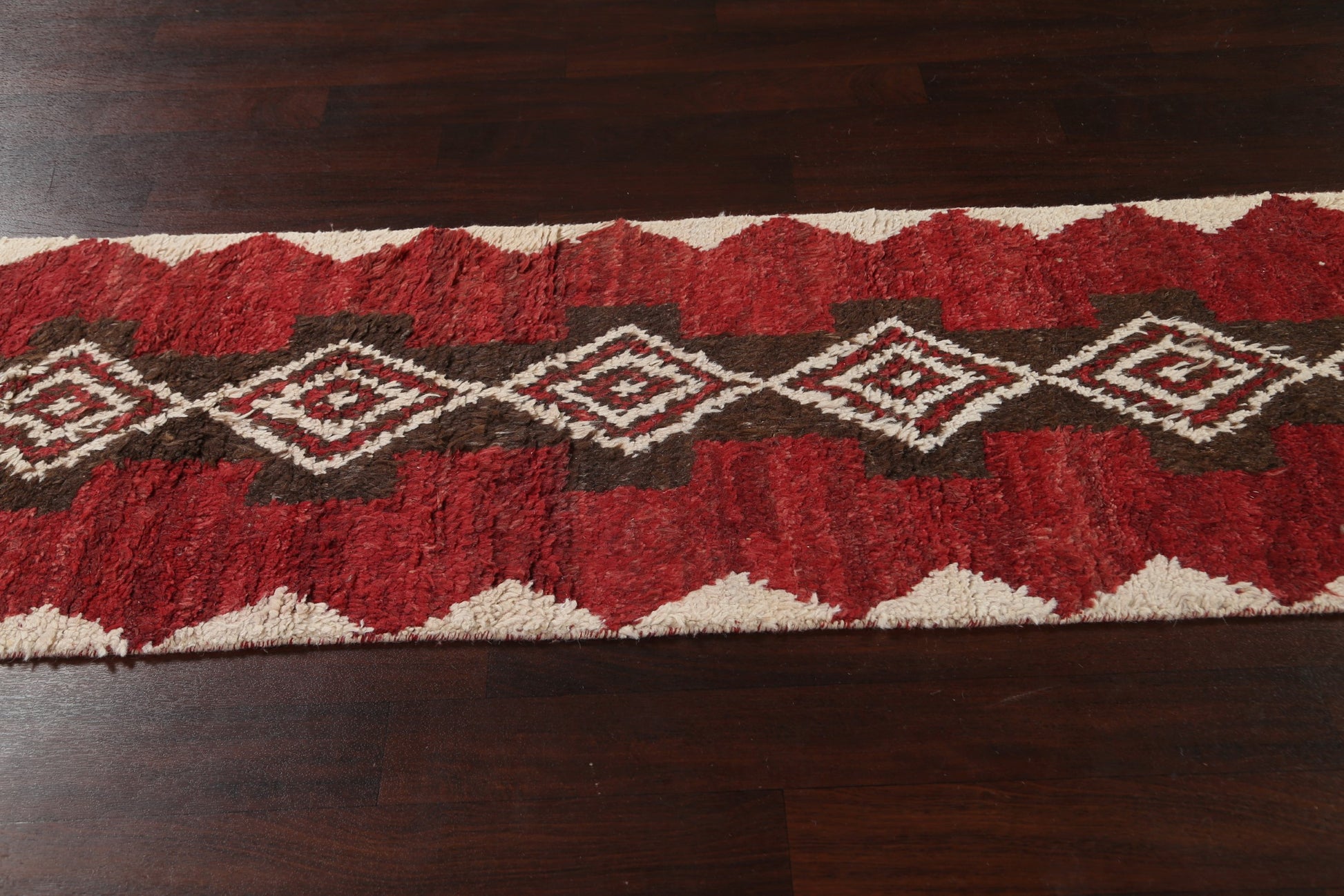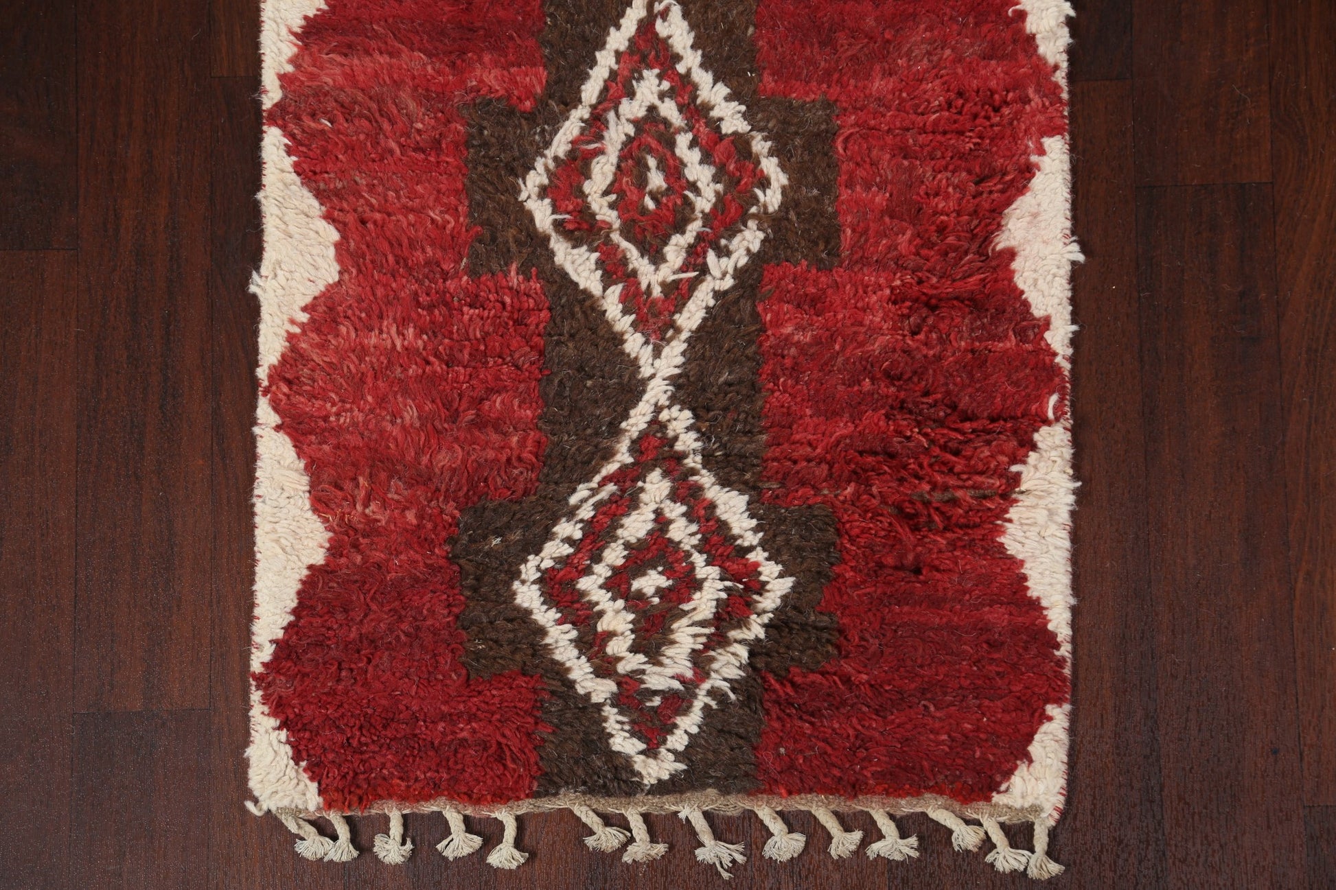 A Beautiful Genuine Morocco Moroccan rug is Hand Knotted by skillful weavers in Morocco with 100% Wool Material. This rug is in New, First Quality condition. dimensions are 12' 4'' X 2' 6'' in foot and 376 X 76 in centimeter. the primary color is Red.