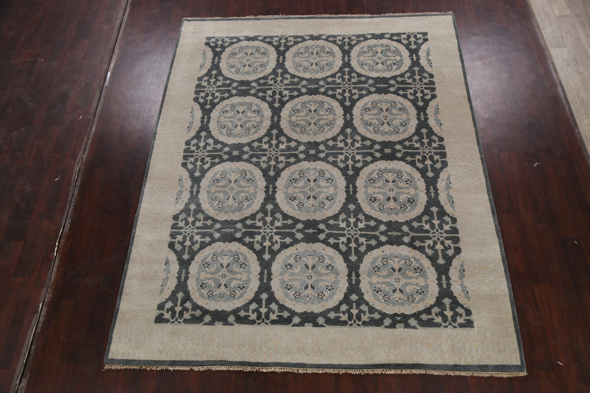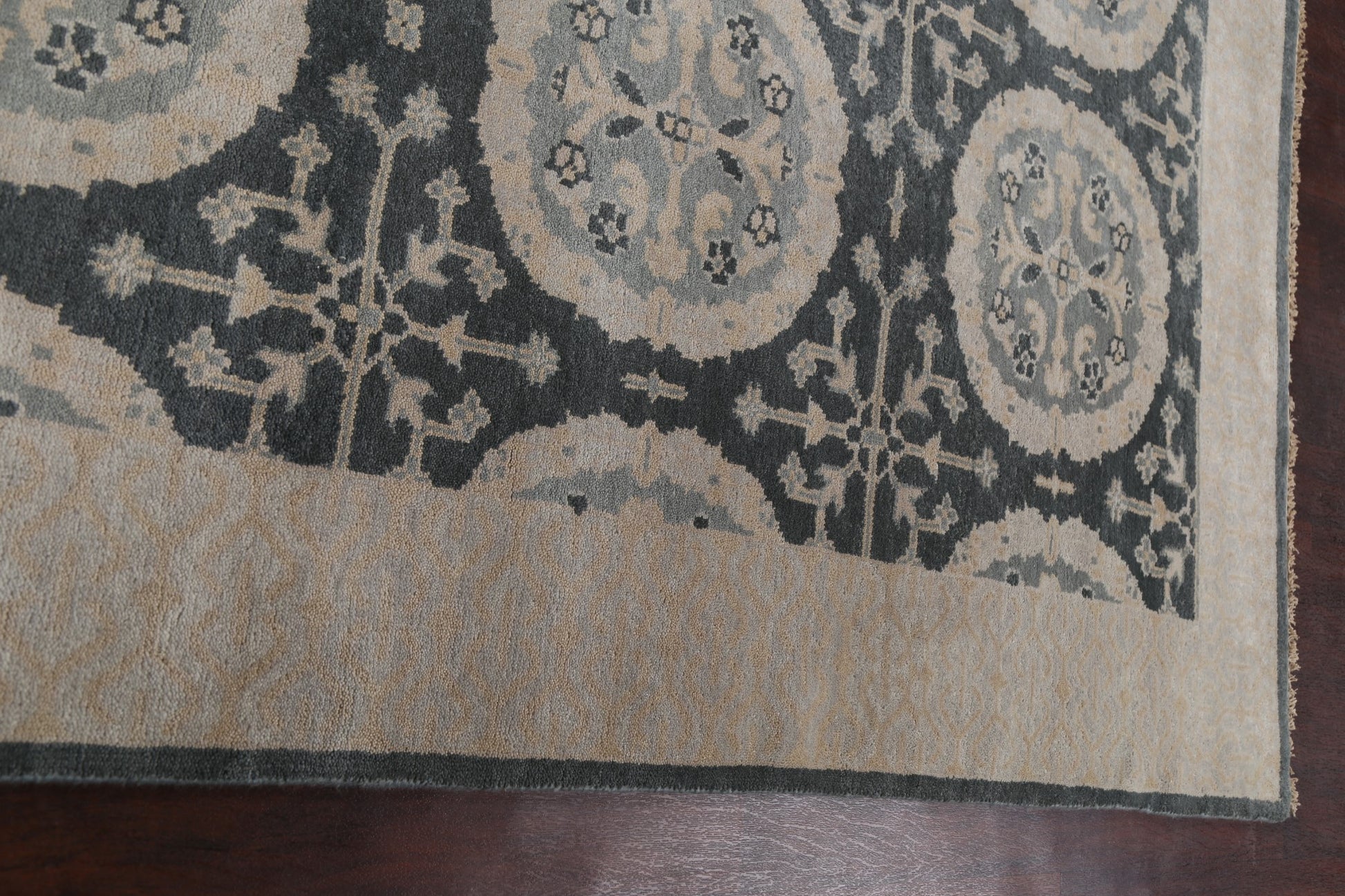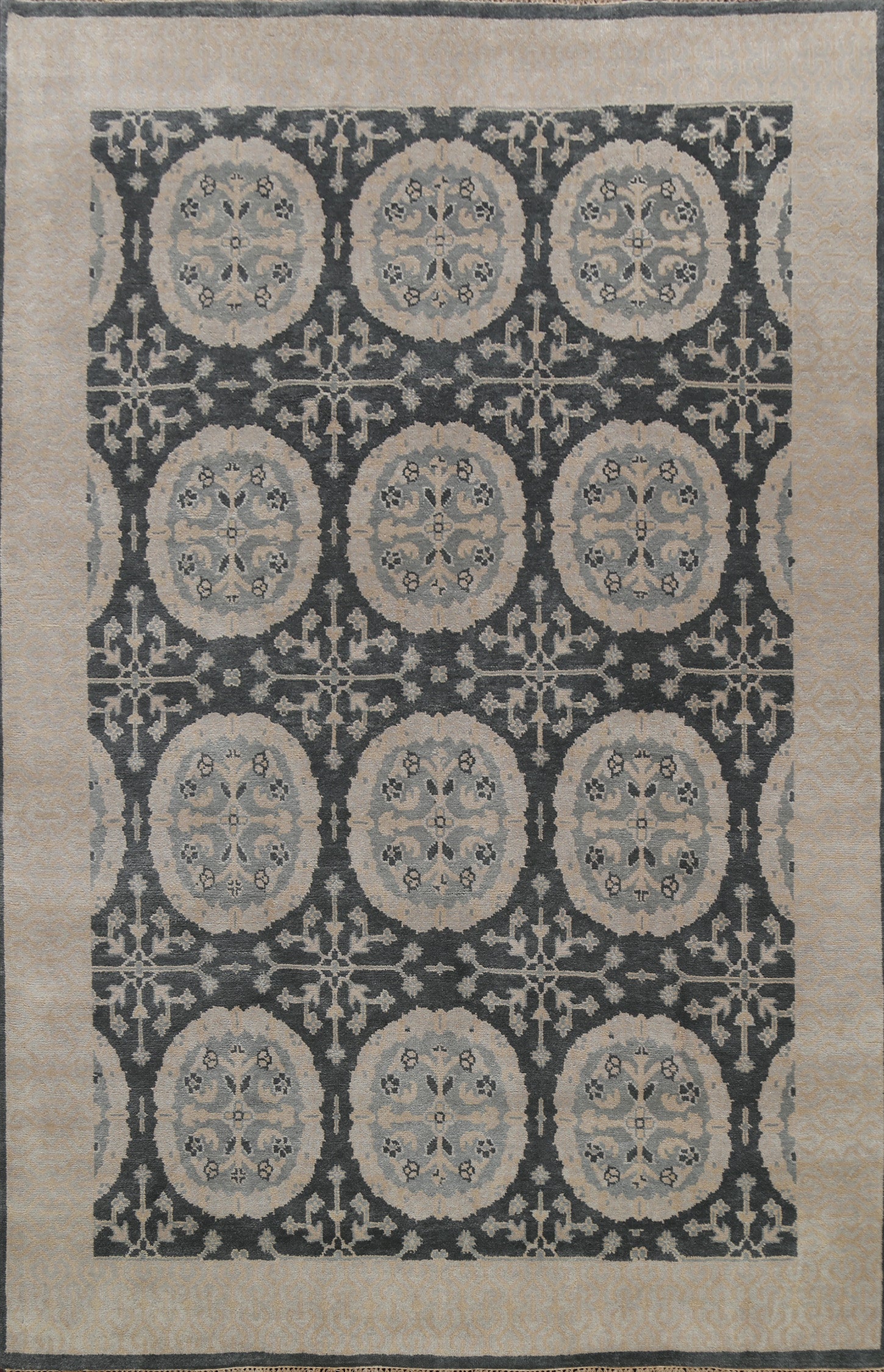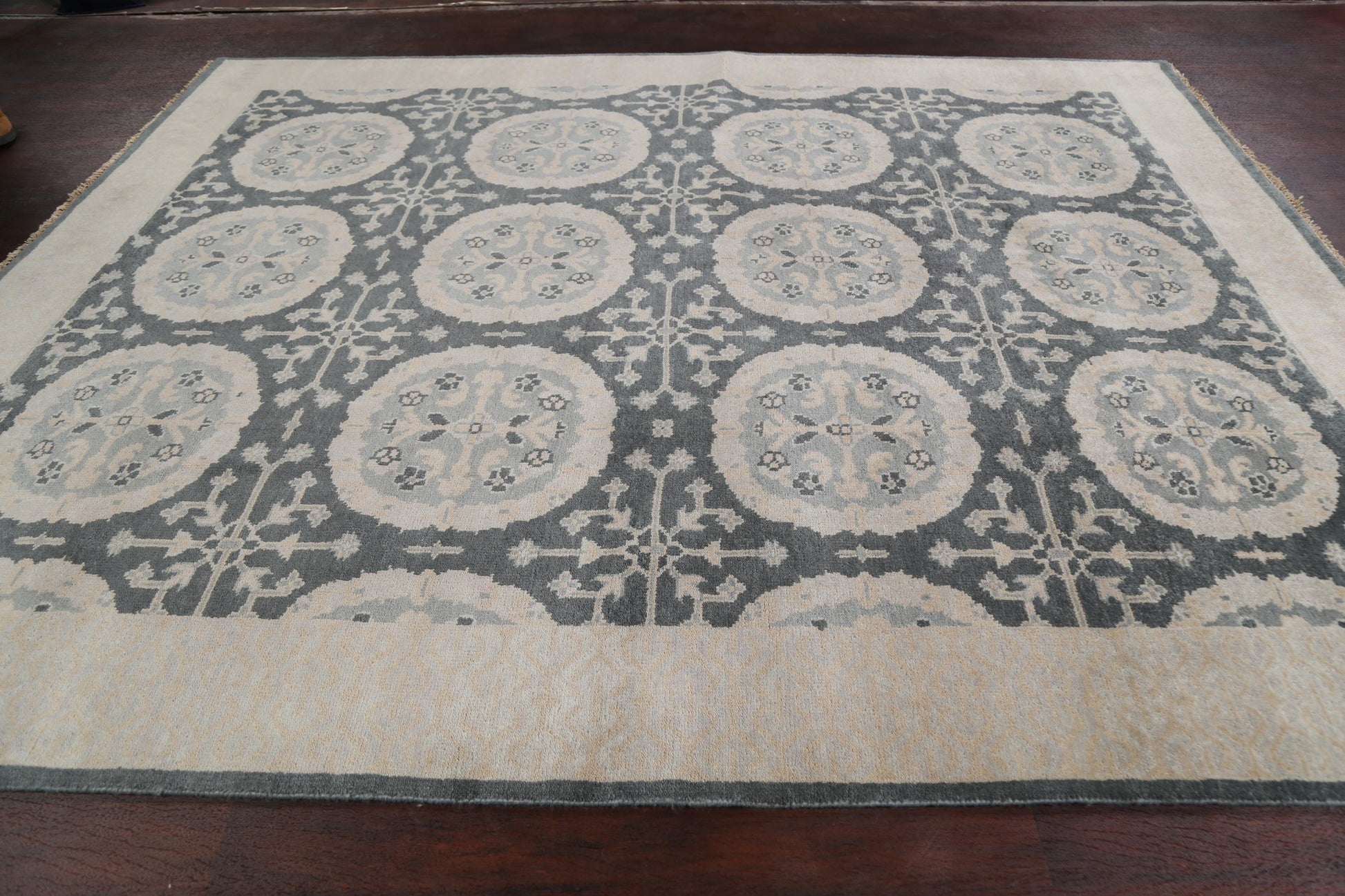 A Beautiful Genuine India Oushak rug is Hand Knotted by skillful weavers in India with 100% Wool Material. This rug is in New, First Quality condition. dimensions are 9' 9'' X 8' 0'' in foot and 297 X 244 in centimeter. the primary color is Greys & Charcoal.