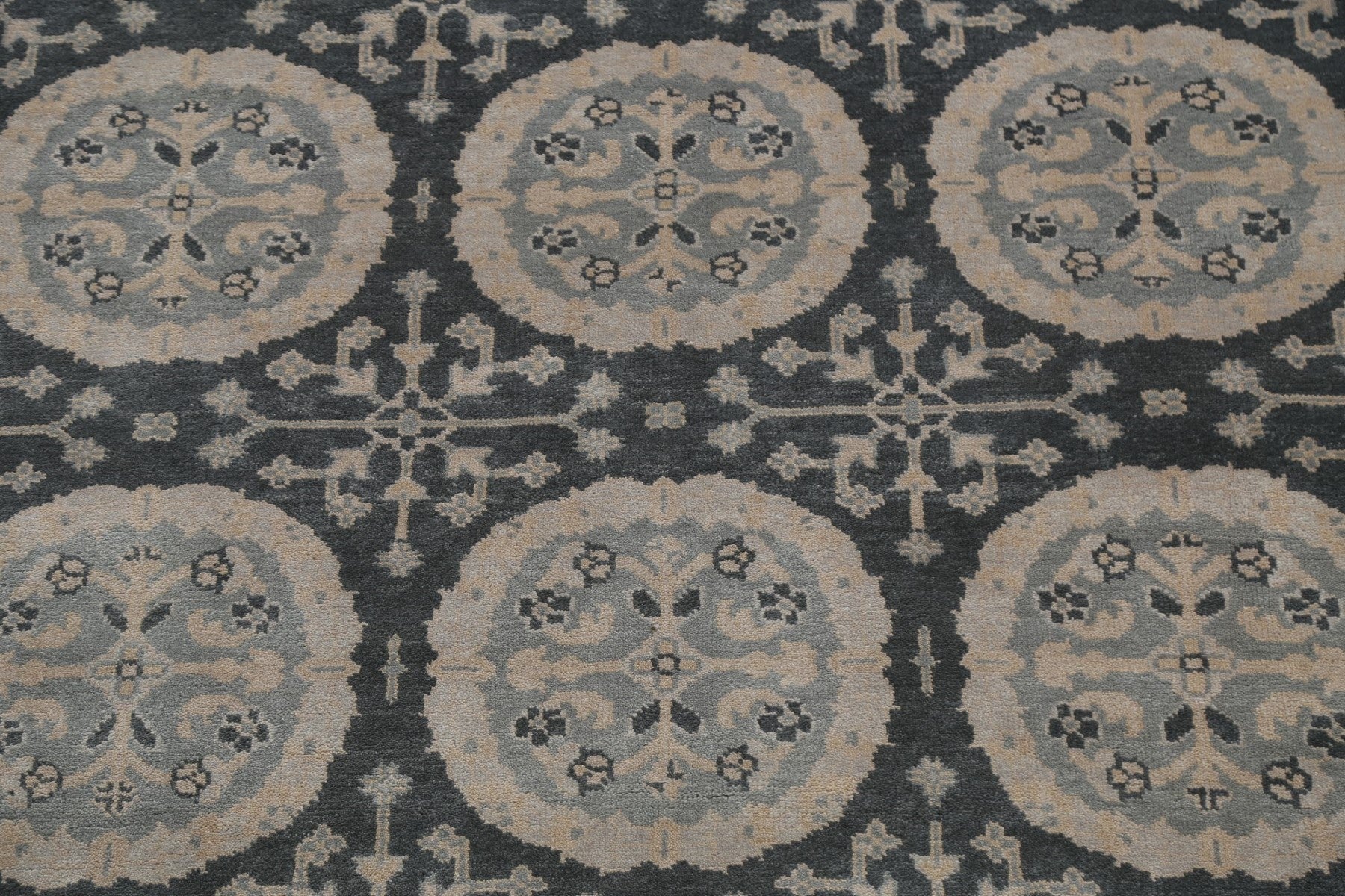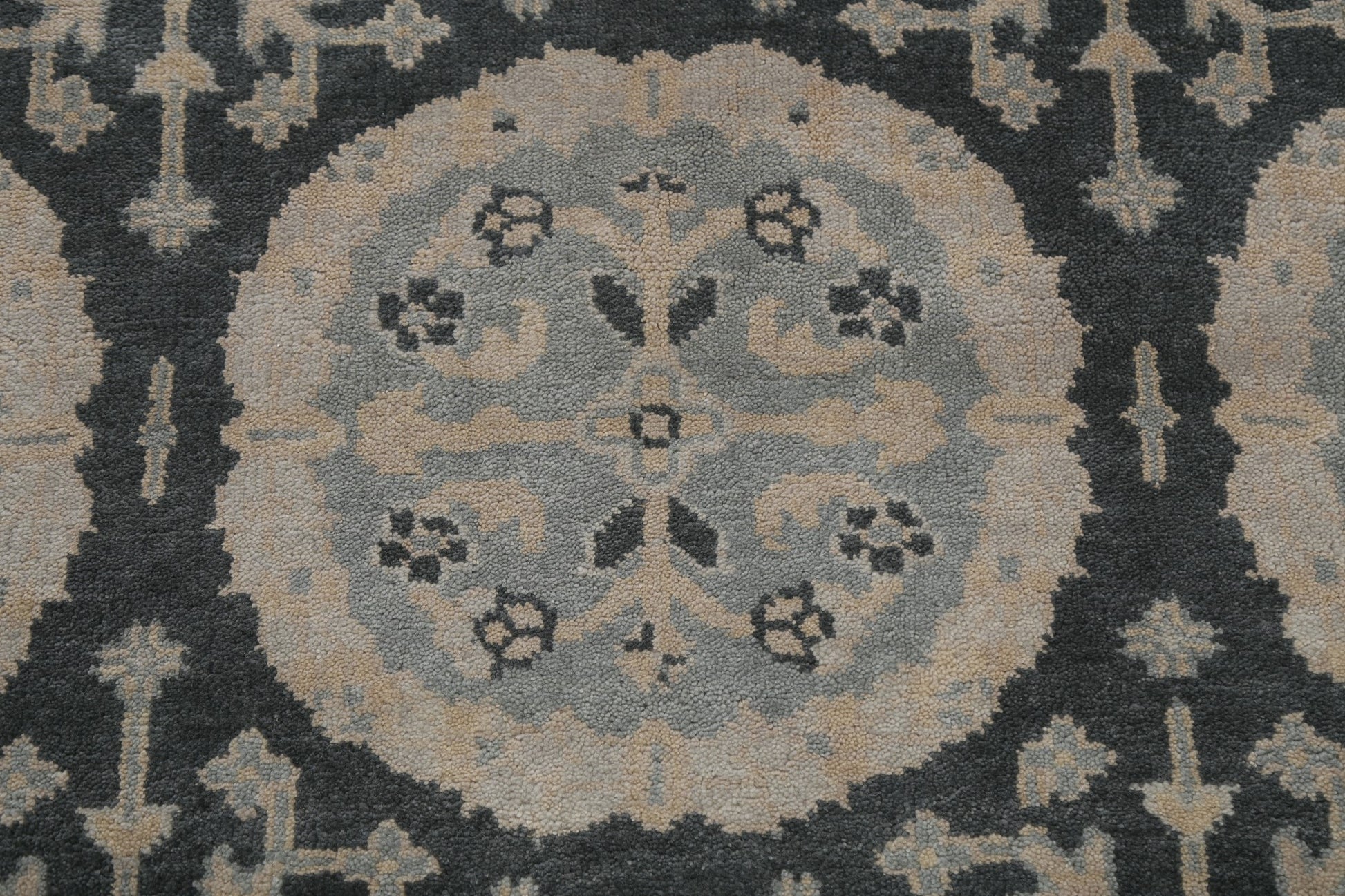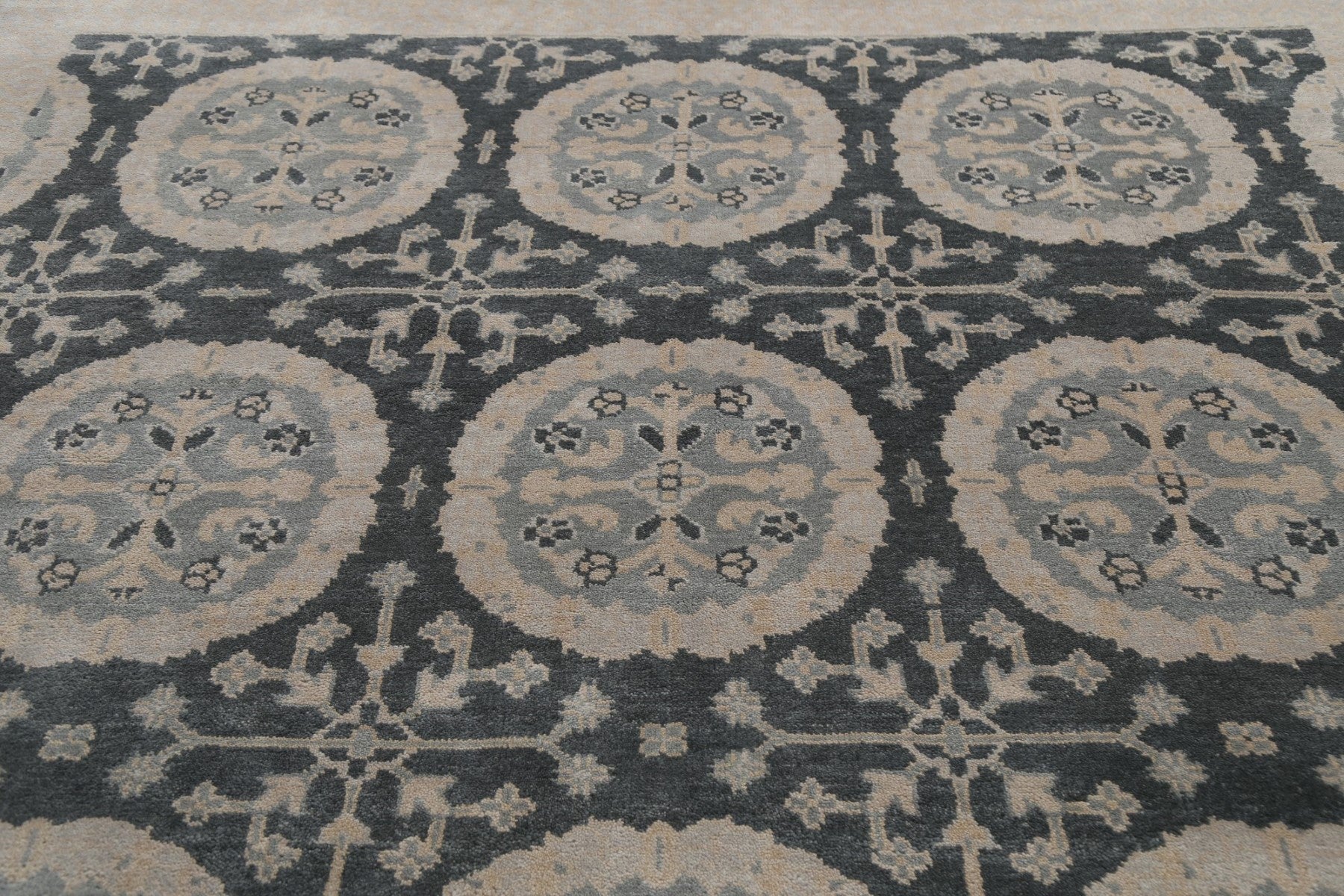 A Beautiful Genuine India Oushak rug is Hand Knotted by skillful weavers in India with 100% Wool Material. This rug is in New, First Quality condition. dimensions are 9' 9'' X 8' 0'' in foot and 297 X 244 in centimeter. the primary color is Greys & Charcoal.