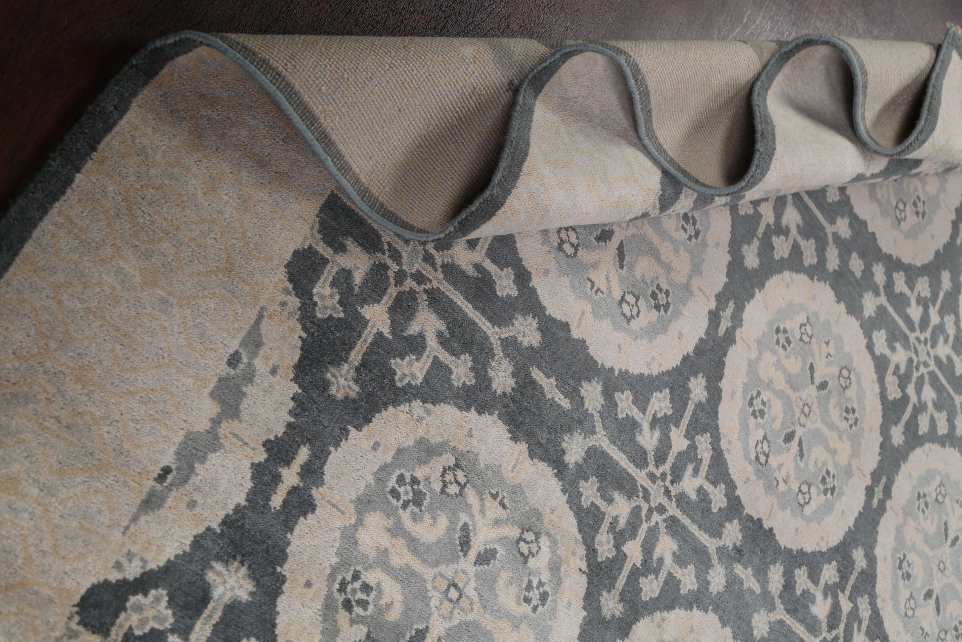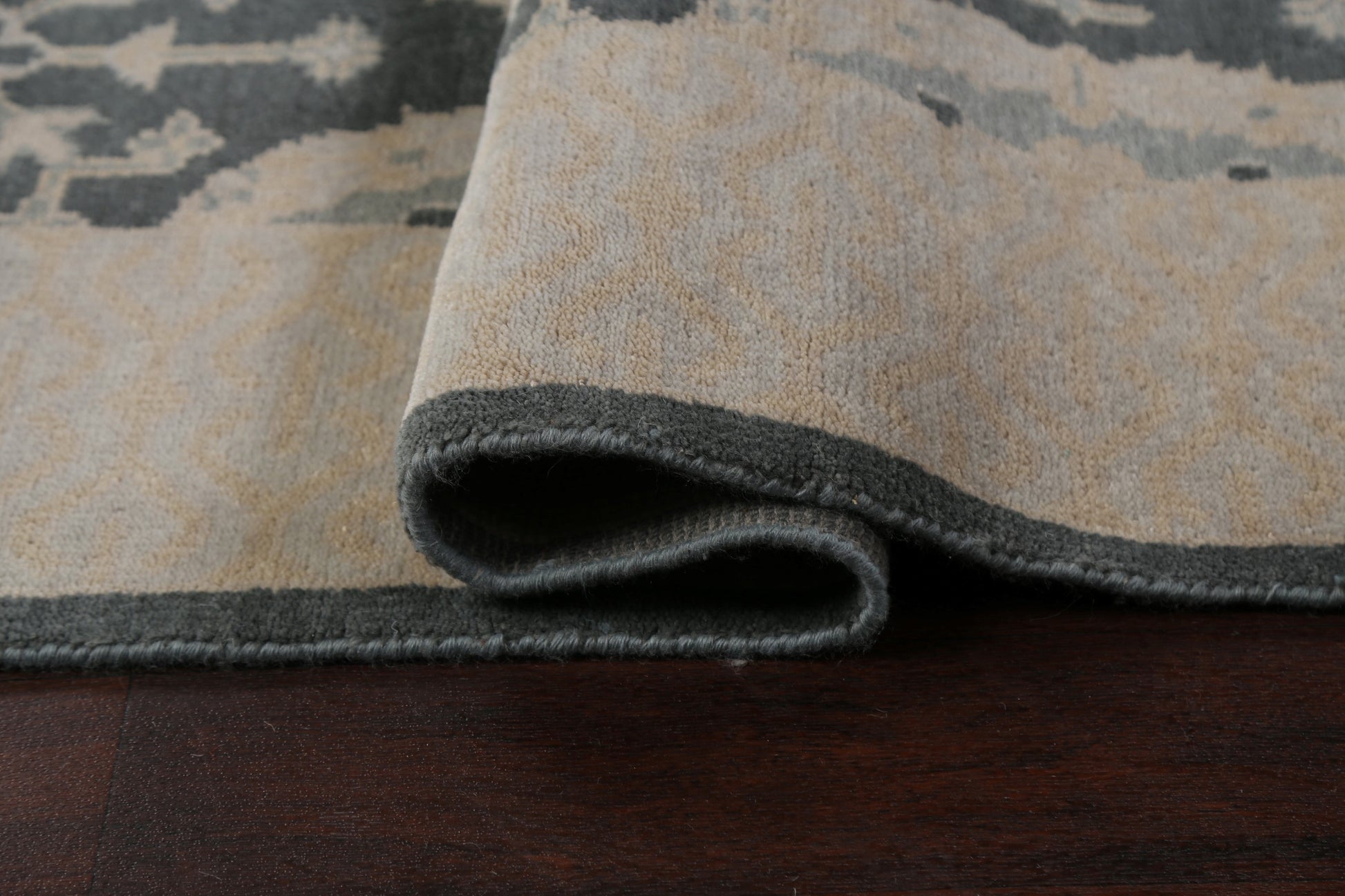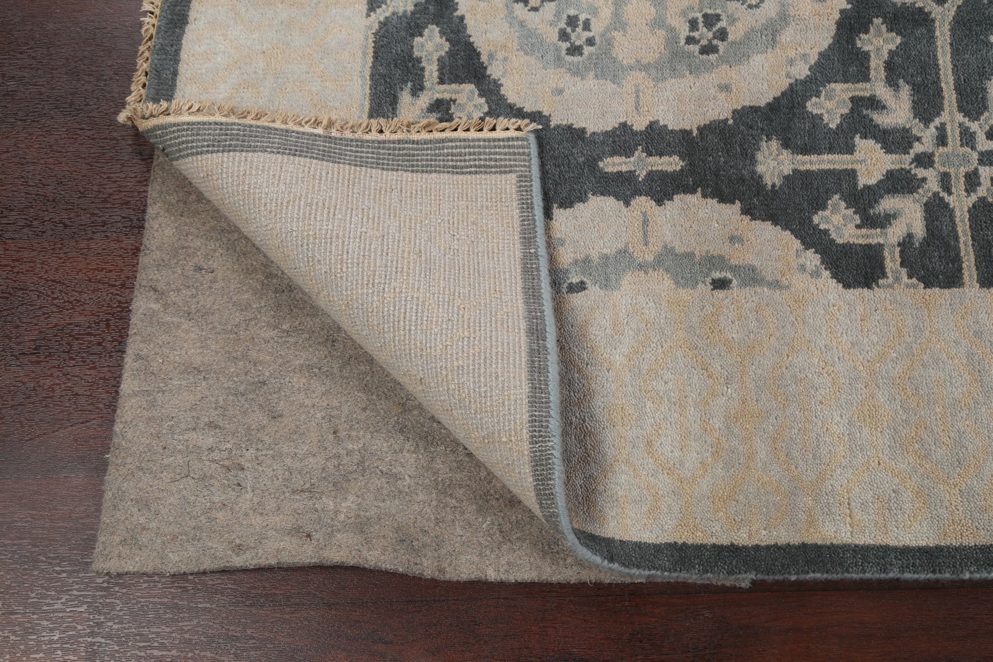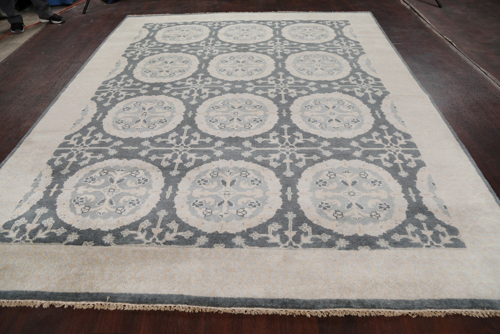 A Beautiful Genuine India Oushak rug is Hand Knotted by skillful weavers in India with 100% Wool Material. This rug is in New, First Quality condition. dimensions are 9' 9'' X 8' 0'' in foot and 297 X 244 in centimeter. the primary color is Greys & Charcoal.
