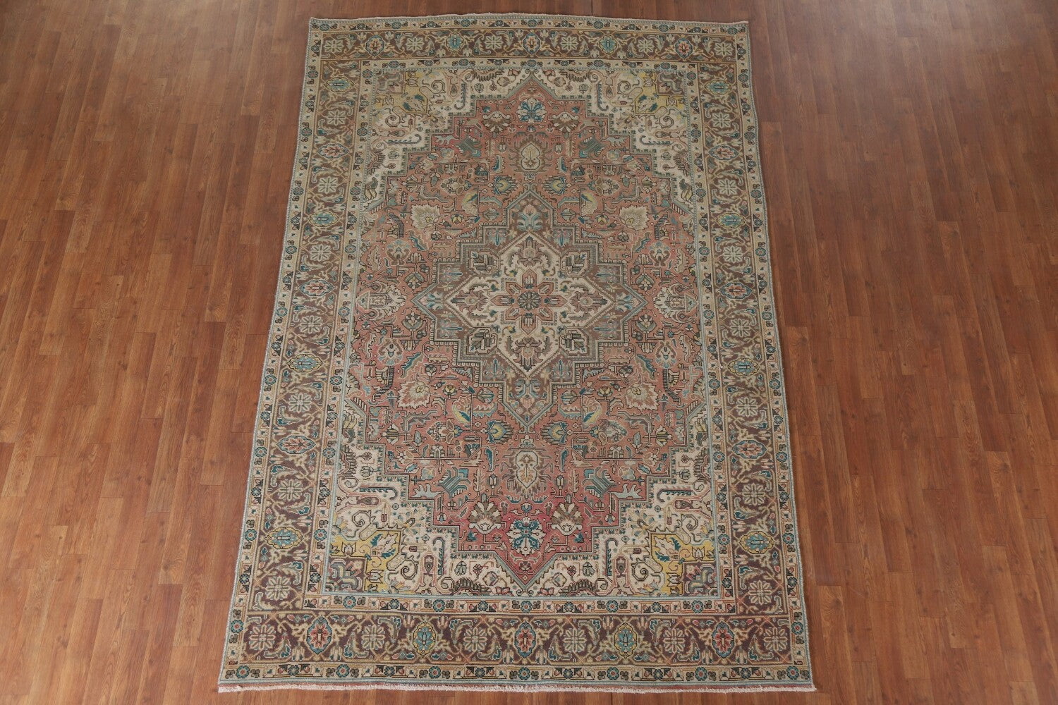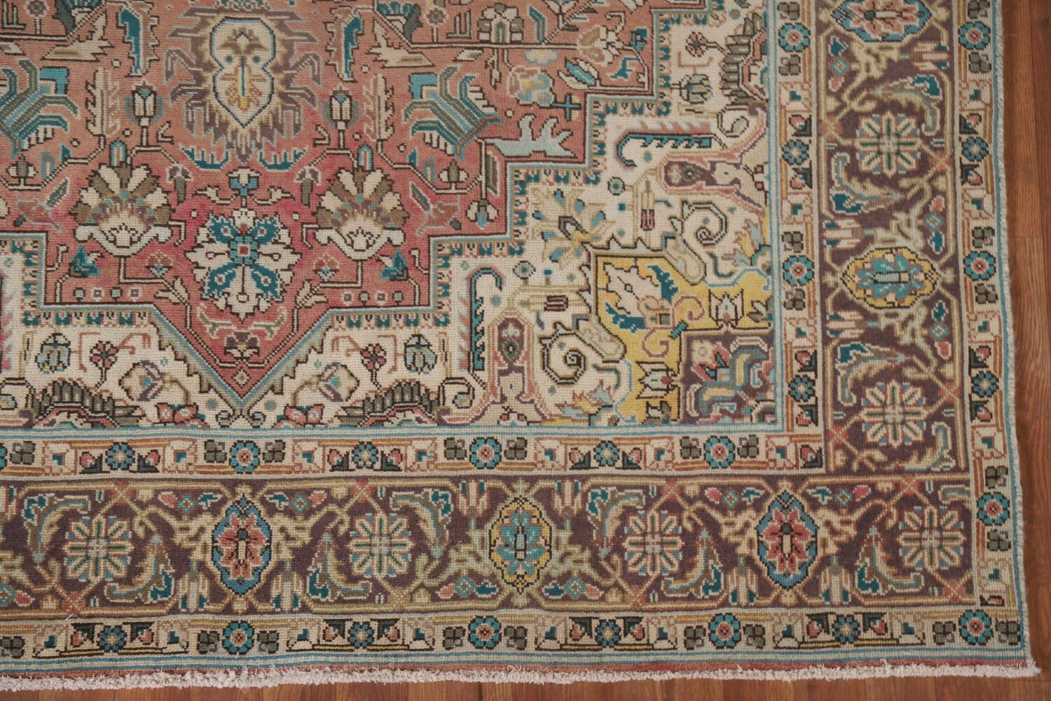A Beautiful Genuine Persia ( Persia ) Tabriz rug is Hand Knotted by skillful weavers in Persia ( Persia ) with 100% Wool Material. This rug is in Very Good (Evenly Low Pile) condition. dimensions are 9' 7'' X 6' 4'' in foot and 292 X 193 in centimeter. the primary color is Pink.