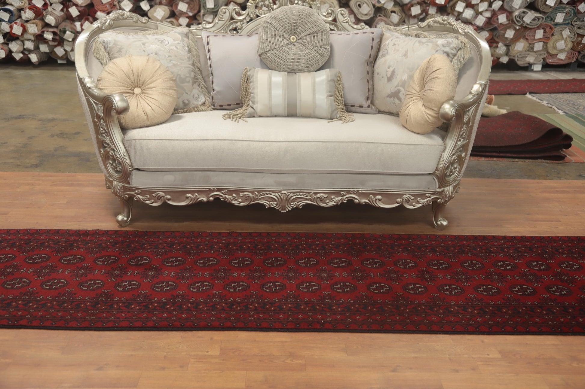 A Beautiful Genuine Afghanistan Balouch rug is Hand Knotted by skillful weavers in Afghanistan with 100% Wool Material. This rug is in New, First Quality condition. dimensions are 16' 0'' X 2' 9'' in foot and 488 X 84 in centimeter. the primary color is Red.